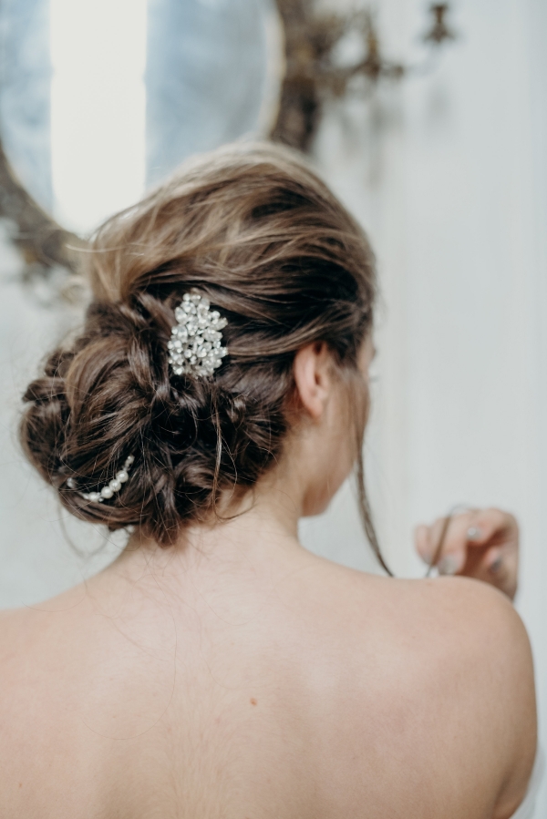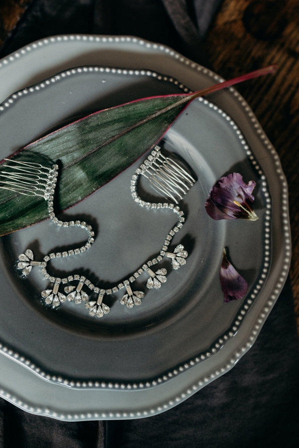 The use of luxurious fabrics and lavish accents juxtaposed against bare brick, plaster and rust finishes epitomises the Industrial Luxe aesthetic. Antique cutlery, chunky vintage keys and old-fashioned bottles with tapered candles sit alongside free-flowing elements such as loose, dark blooms, and undone hair enhanced by bejewelled hairpieces and ethereal make-up.