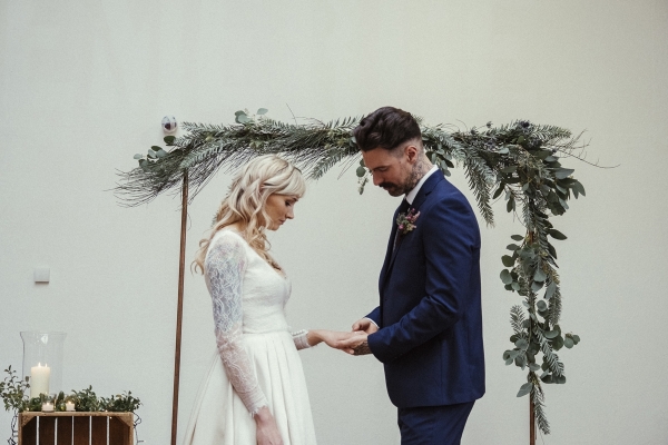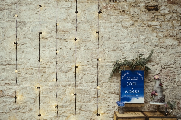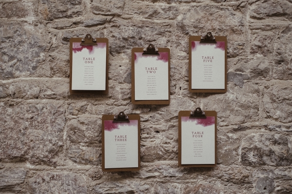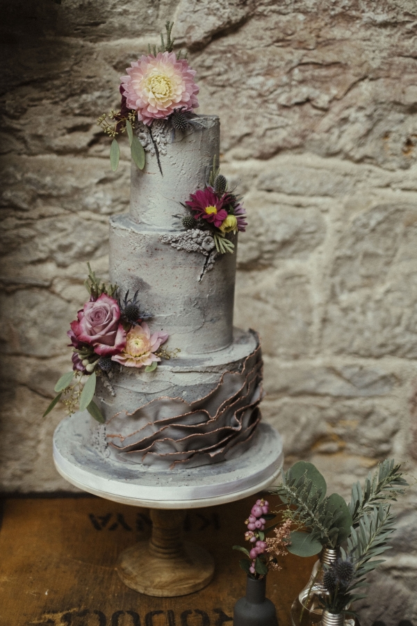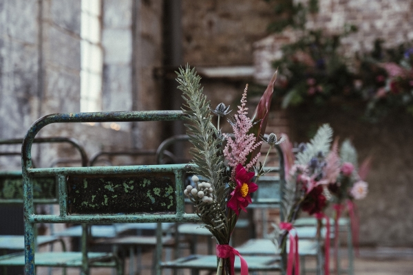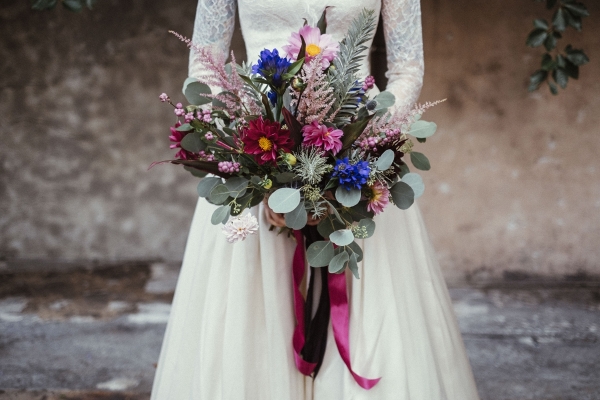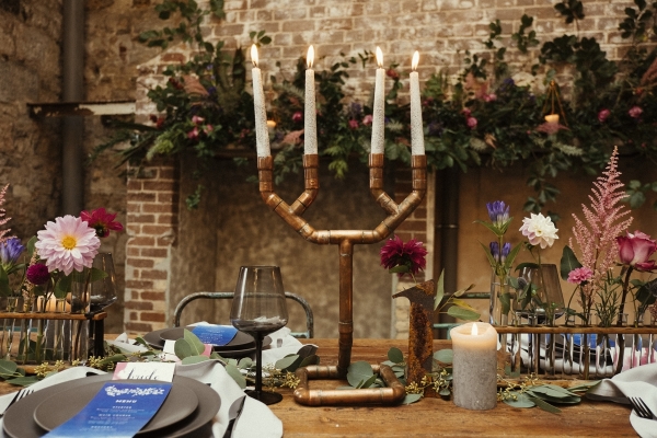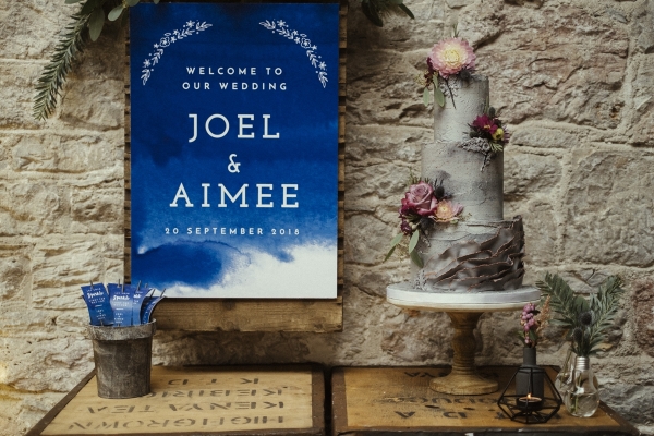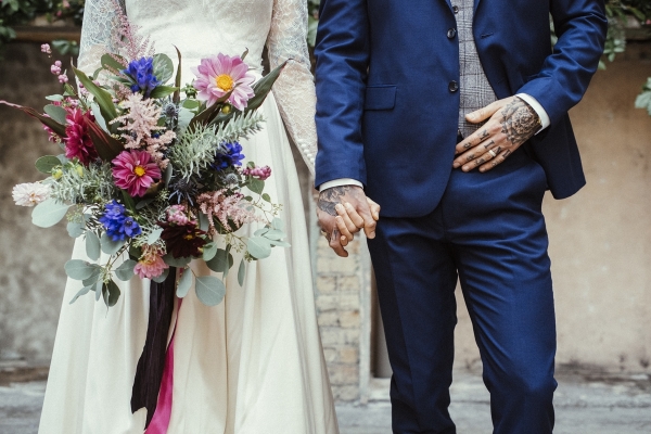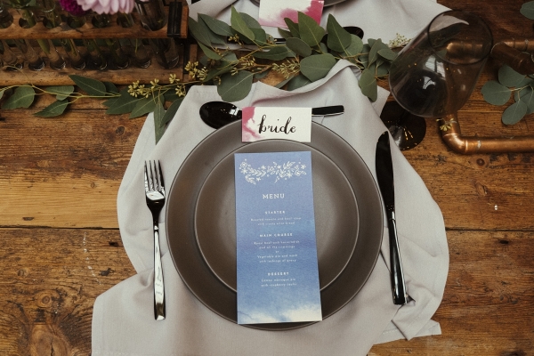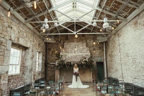 This styled shoot brings together an eye-catching combination of raw, distressed textures and bold and bright colours, the rich palette offering the perfect contrast to the venue's industrial aesthetic. The exposed brick is enhanced with festoon lighting, vintage chairs bear a worn-like beauty, and wild and uninhibited florals burst with colour. Shades of magenta, turquoise and blue pop against abundant foliage and textures of wood, stone and metallics. The bare light bulbs shine down on tables dressed with bare linens and eucalyptus, while jars of pink and purple florals nestle alongside copper piping candlesticks. Adorned with dainty florals, the bold hues of the stationery, decorated with a blue wash of watercolour, and the cake, its rich texture echoing the aged walls of the building, are the perfect finishing touches.