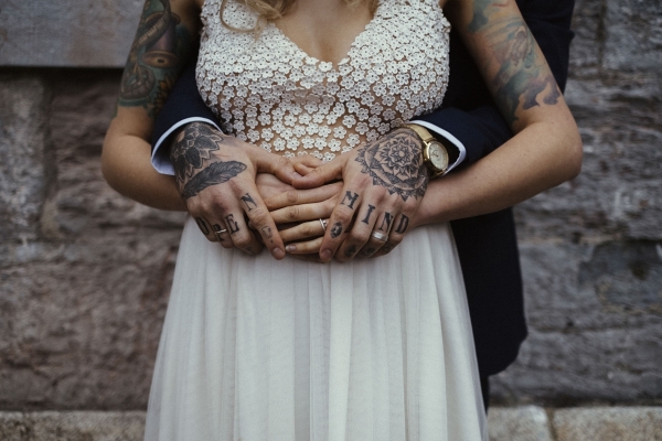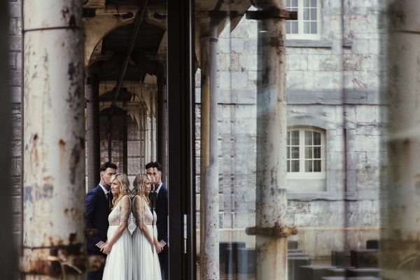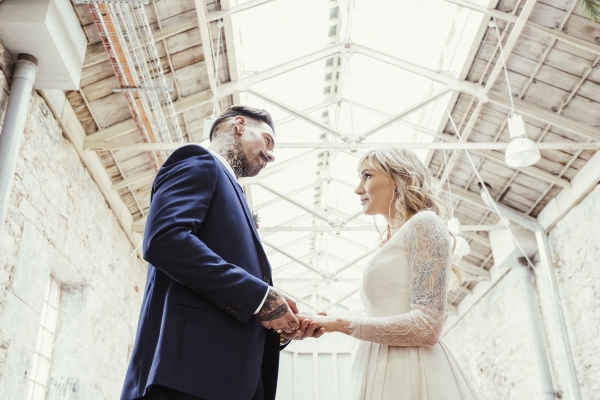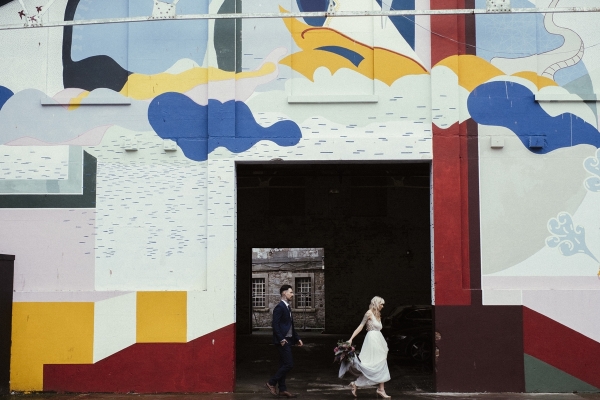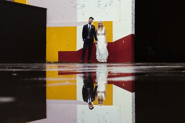 Outside, there's an urban quality to the styling; the bride and groom oh-so cool against the striking wall mural. The many nooks and spaces of Ocean Studios bring opportunity aplenty for a creative approach to the images, using reflections, shadows and the natural brightness of such a light-filled venue to shine a spotlight on the bride, groom and their effortlessly stylish day.