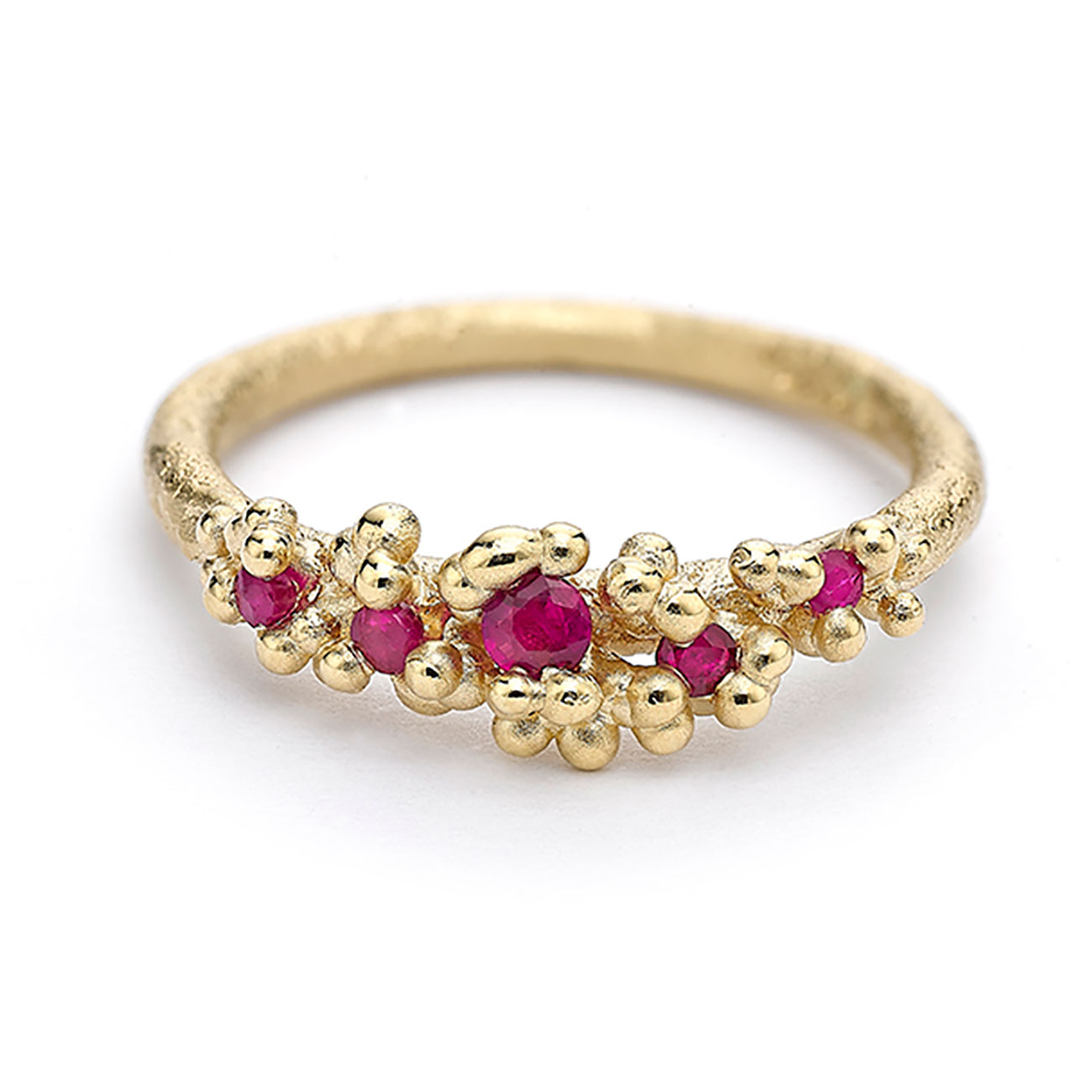 Picture a dainty pendant featuring a solitare diamond nestled amongst tiny golden granules; a gently textured engagement ring scattered with champagne and white diamonds; a wedding band dotted with tiny blue sapphires and diamonds, and a ring of pink-red rubies seemingly floating amongst granules of gold. You’ll find these ethereal and enchanting heirlooms – and so much more – amongst the treasures of Polka Dot Gallery.