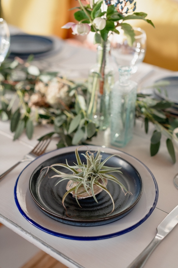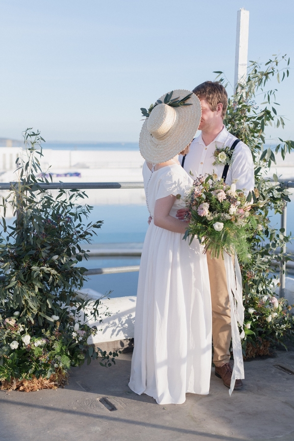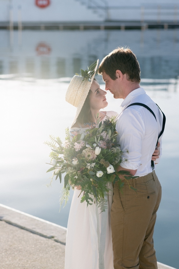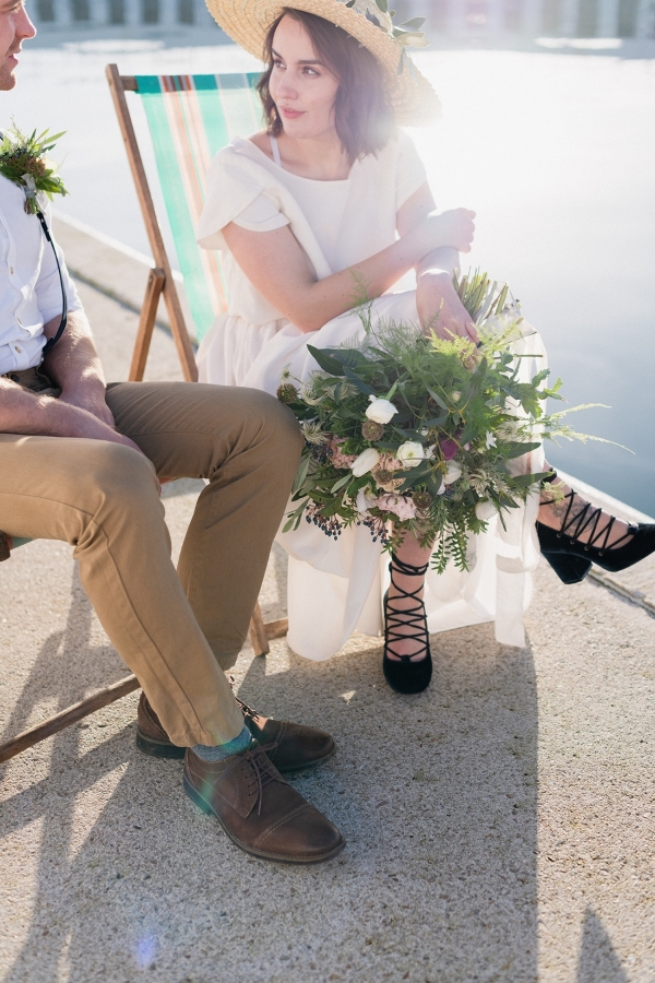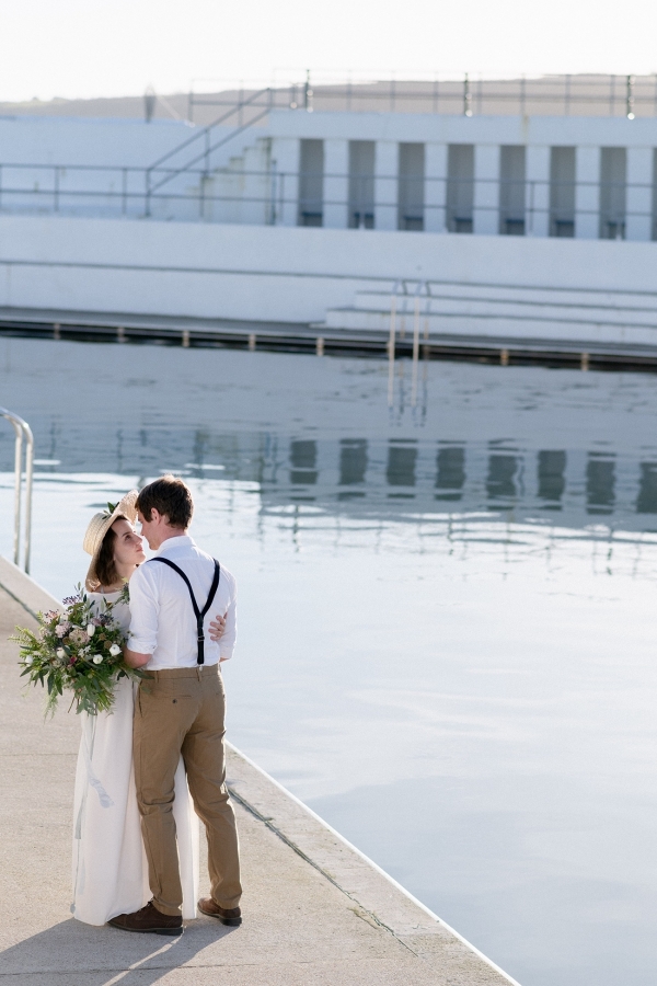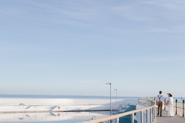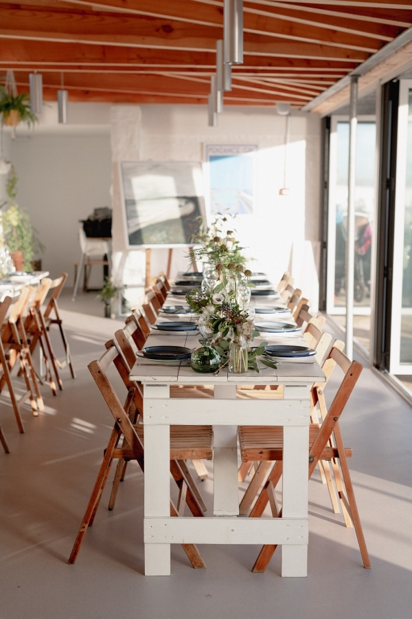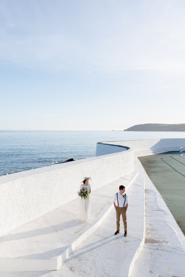 Drawing on many of the associations with west Cornwall ' art galleries, folklore, mild weather, fishing heritage and, of course, the eclectic architecture of Penzance town ' Salt & Sea Photography Co. created the visual story of an artist and fisherman holding their intimate wedding celebration at Jubilee Pool. Deviating from conventional wedding décor and instead leaning towards the feel of a rustic, tucked-away-down-a-side-street art gallery, the beautiful minimal space of Jubilee Pool's new café and event space provided the perfect blank canvas for a set-up of artworks, paintbrushes and feasting tables.