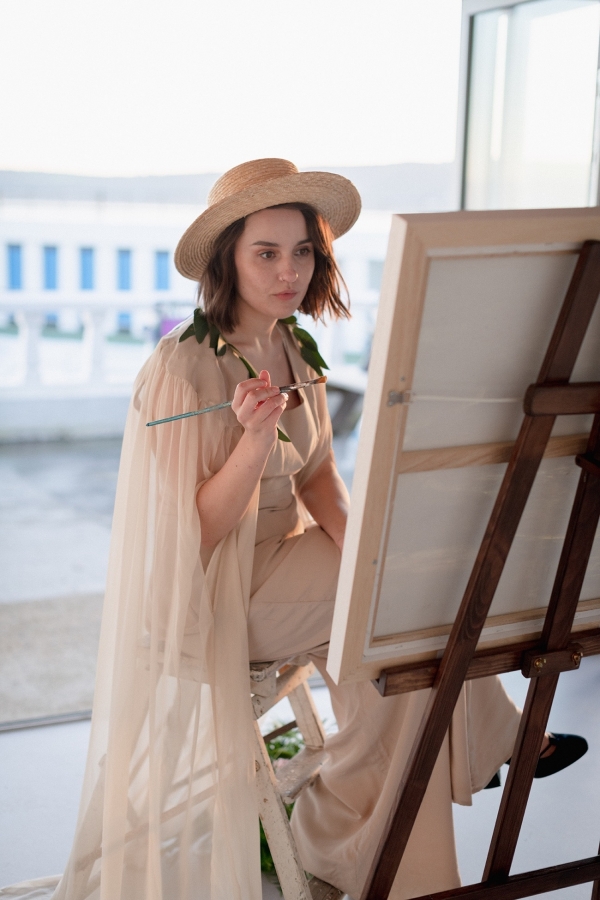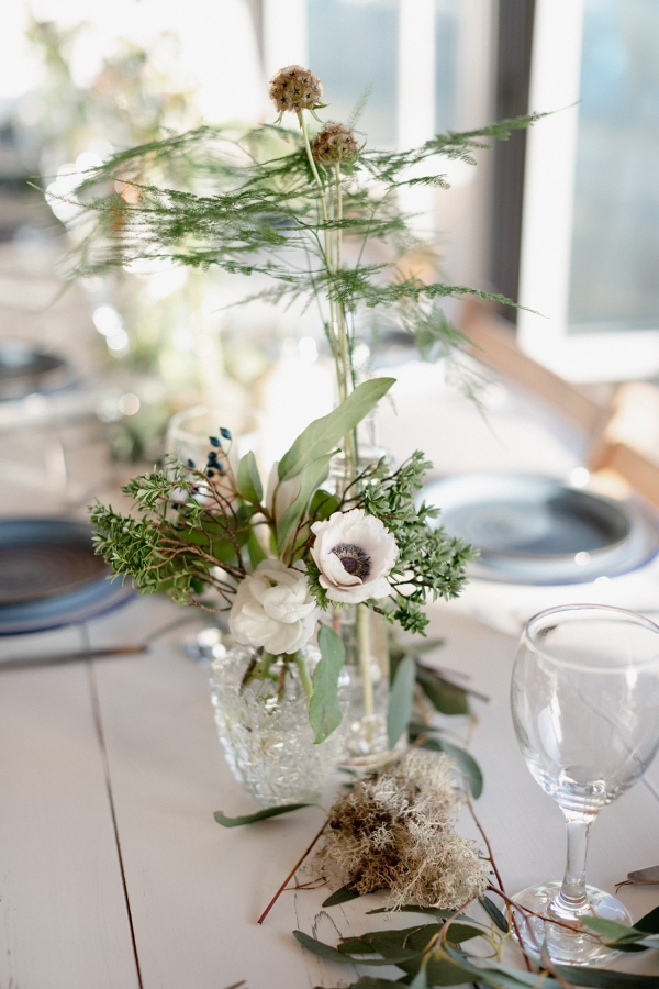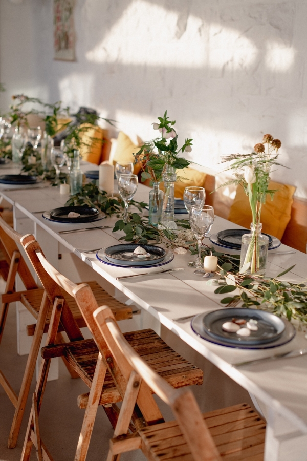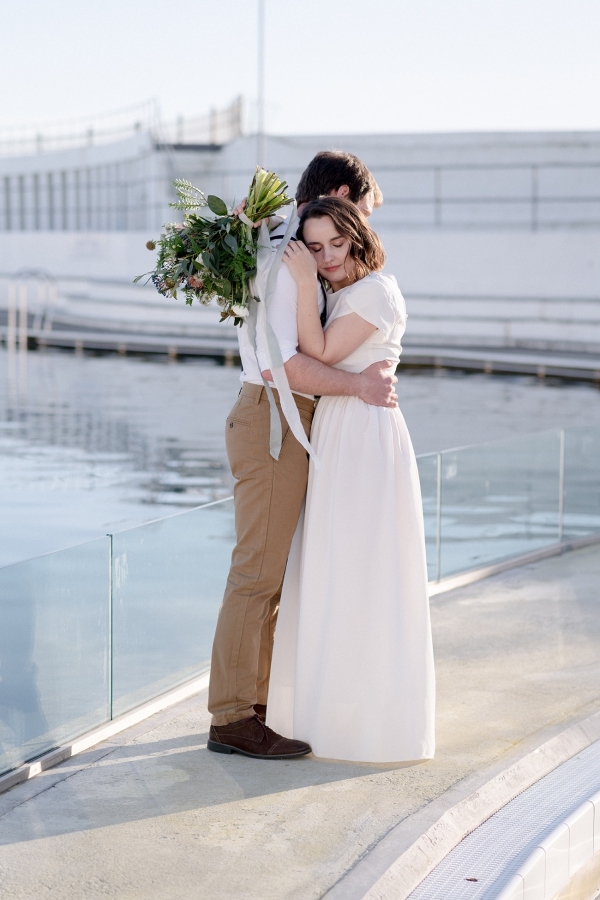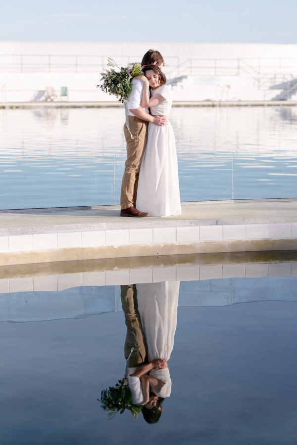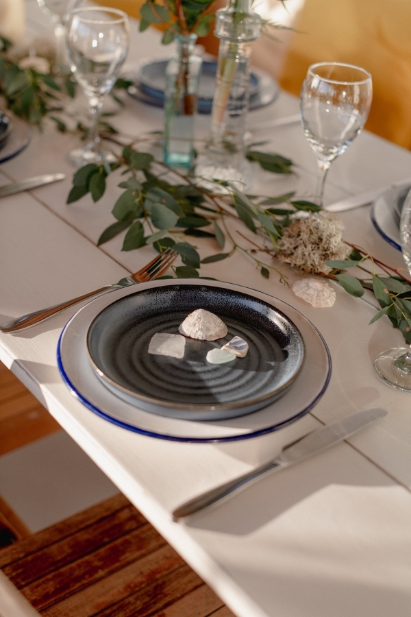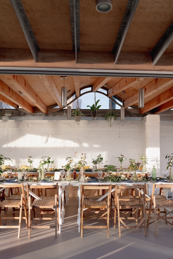 Drawing on many of the associations with west Cornwall ' art galleries, folklore, mild weather, fishing heritage and, of course, the eclectic architecture of Penzance town ' Salt & Sea Photography Co. created the visual story of an artist and fisherman holding their intimate wedding celebration at Jubilee Pool. Deviating from conventional wedding décor and instead leaning towards the feel of a rustic, tucked-away-down-a-side-street art gallery, the beautiful minimal space of Jubilee Pool's new café and event space provided the perfect blank canvas for a set-up of artworks, paintbrushes and feasting tables.