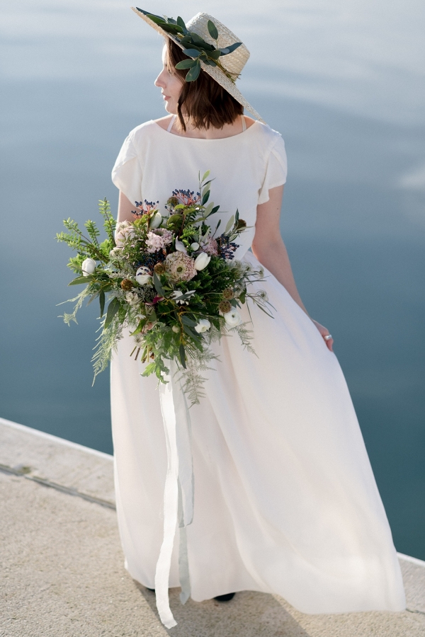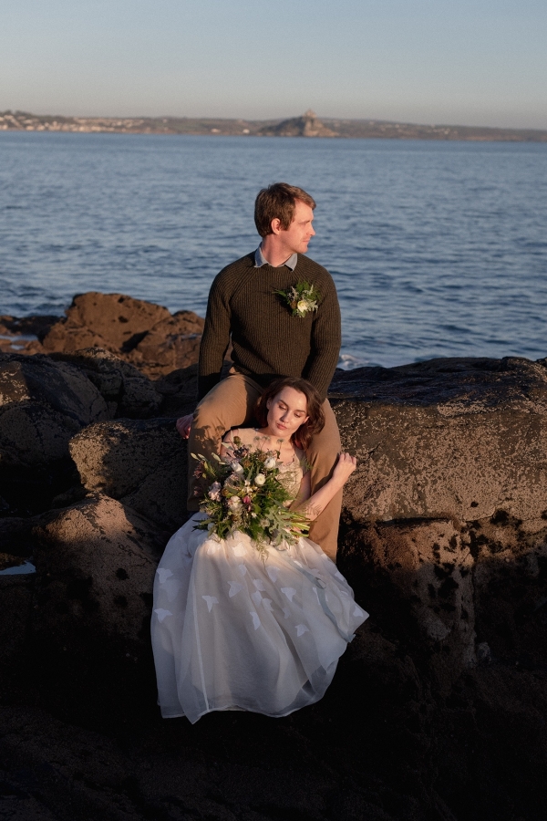 Crafted in Cornwall by Ailsa Munro, the bride's separates and jumpsuit-cape-combination reflected the contemporary and whimsical vibe of the setting and, paired with a Portuguese boater hat and leafy green bouquet, created a look befitting a Cornish artist on her wedding day. The groom's three looks offer different degrees of formality to reflect the laid-back and quirky style of Penzance.