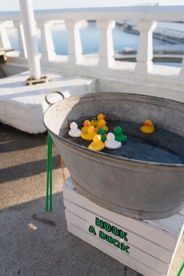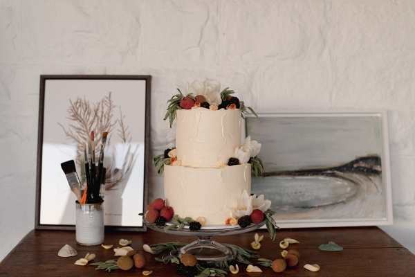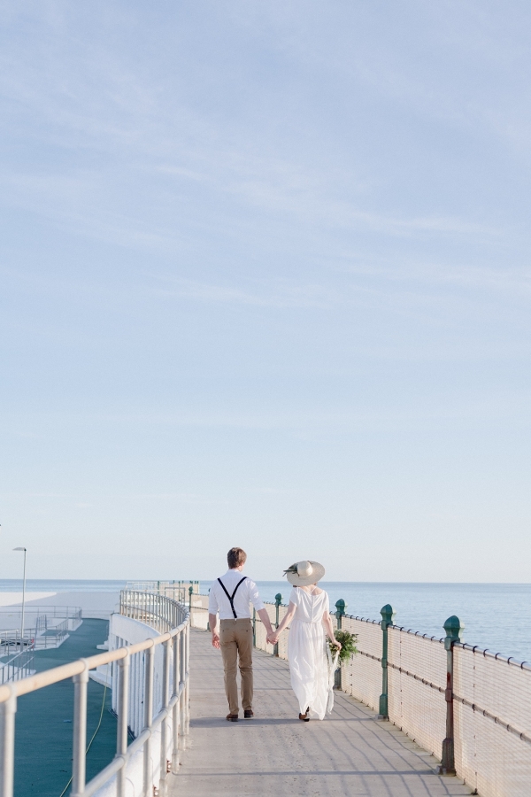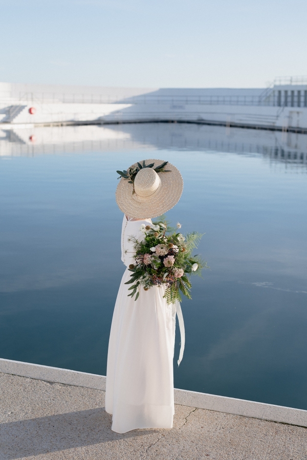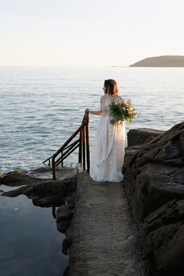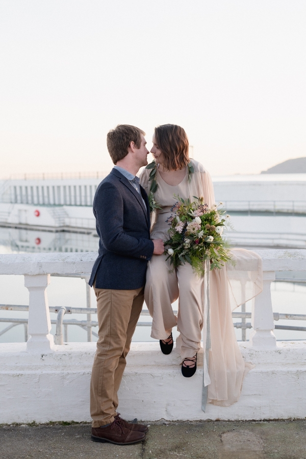 With contributions of art from Clare Webb and Molesworth & Bird, the pressed seaweed and whitewashed oil canvas styles married together, along with a natural, elegant cake and trestle tables, to set the tone of a lofty studio. Pippa of Zennor Wild and Sam of Stargazey Wedding Hire transformed the upper gallery overlooking the pool into a breathtaking ceremony space with panoramic views of the bay. The poolside galleries also made the perfect spot for guests to play a selection of retro games, which served as a nod to the vintage roots of the lido.