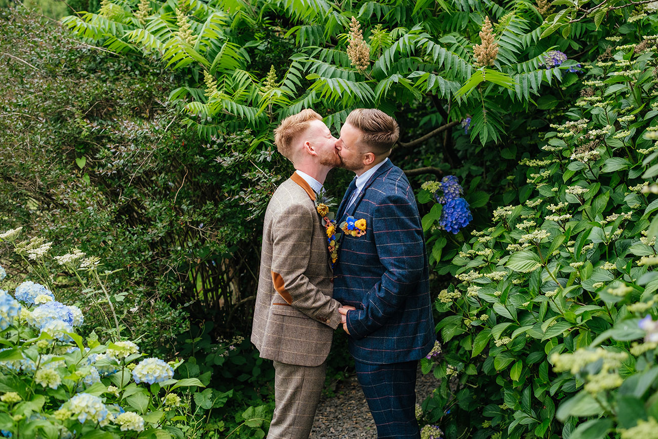 [Photography & videography Charlie Flounders Photography / Concept & planning Ebb, Flow & Grow / Suits Prudence Gowns / Rings & jewellery Hannah Louise Lamb / Celebrant Ceremonies by Amanda / Flowers Escential Blooms / Models Tom & Tim Chichester, Penny the Pooch @pretty_penny_cockapoo]