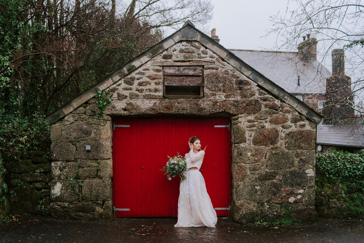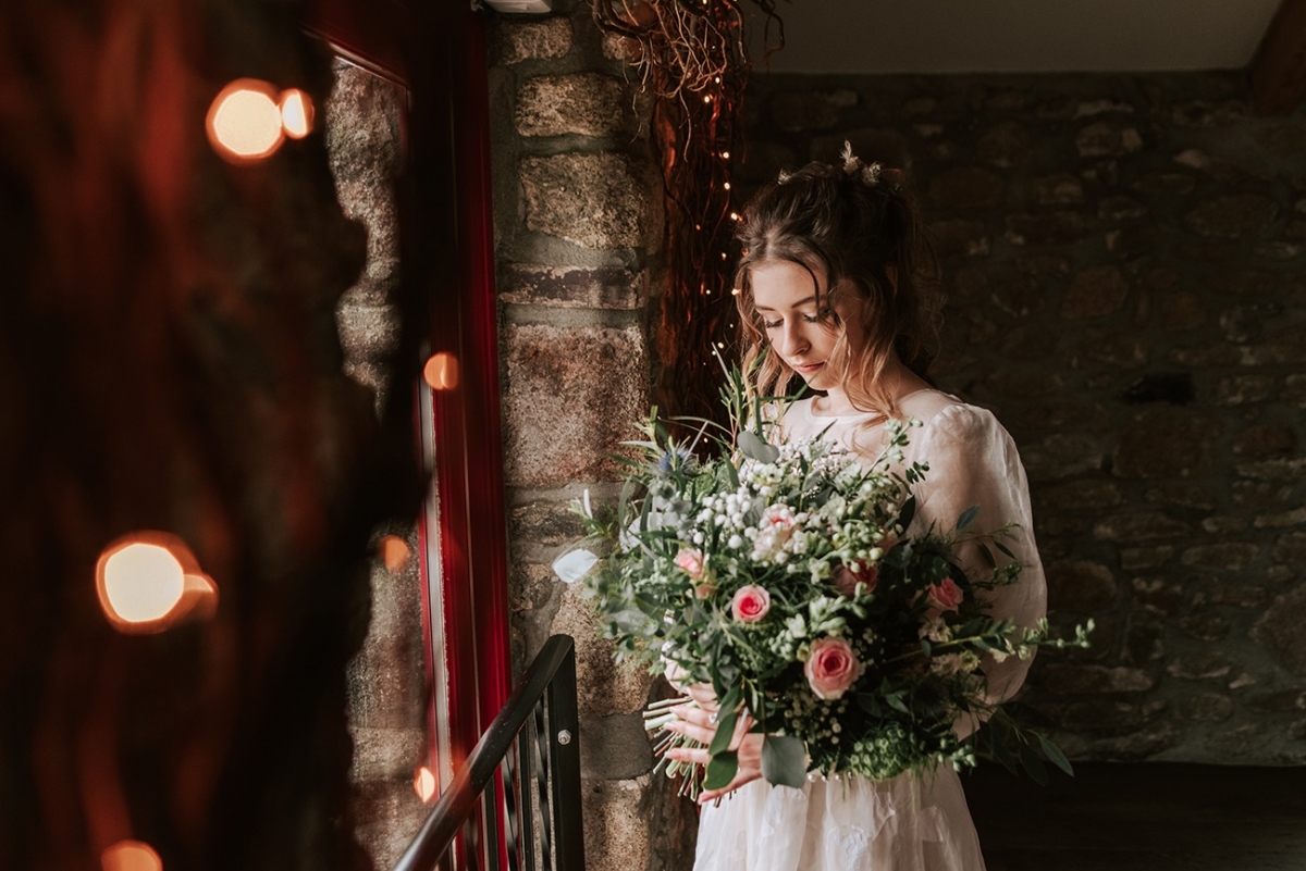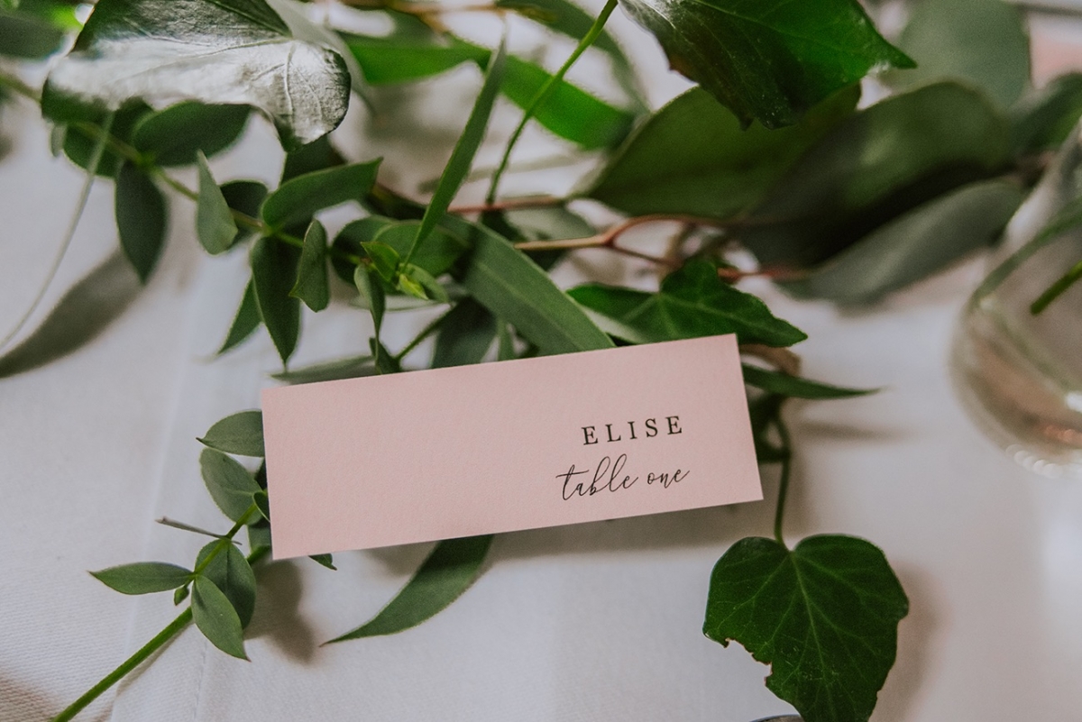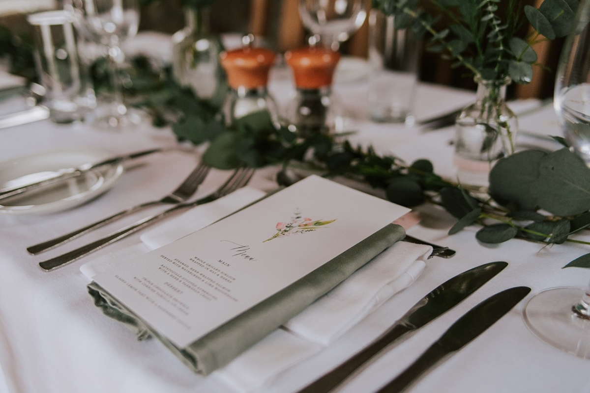 While not part of the original vision, the weather adds a captivating, elemental feel to the images, while showcasing the rustic spaces and waterside arbour of Knightor Winery. A palette of forest green and pretty pink carries through the details, from the hand-painted cake to the stationery, the colours popping against the crisp whites. Eucalyptus adds a lush, earthy vibe to the tablescape, the backdrop of exposed brick walls and twinkling fairy lights bringing rustic charm in abundance.