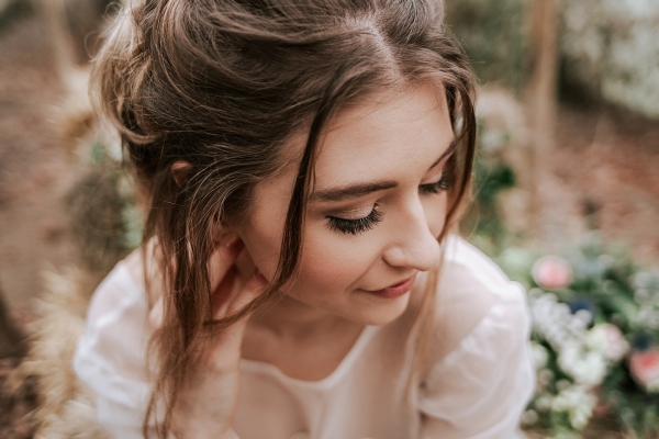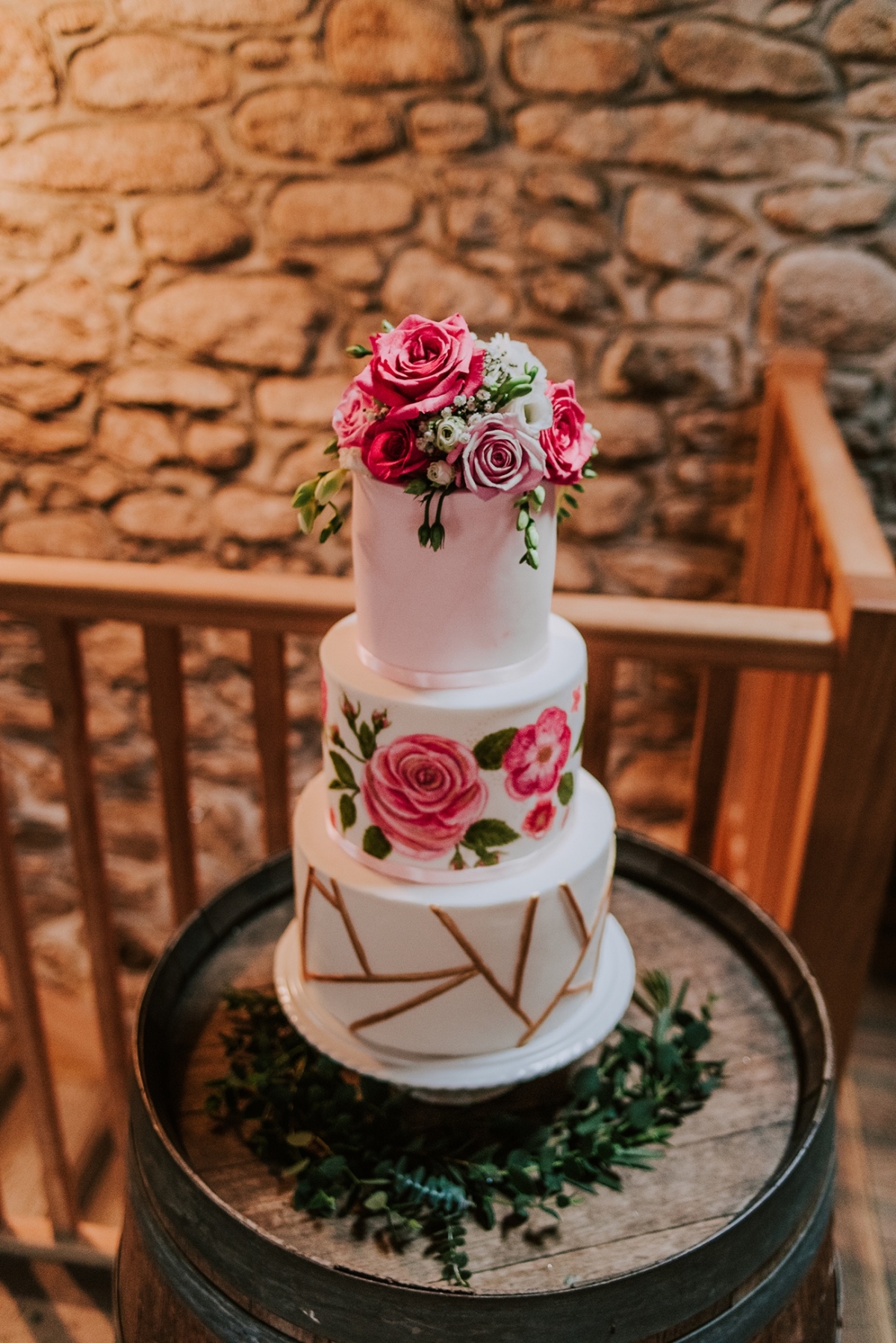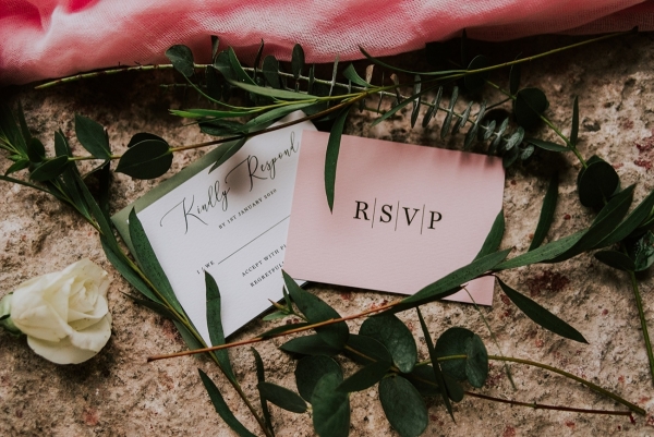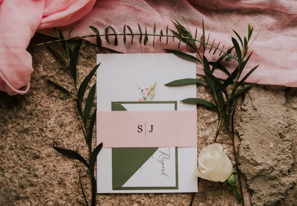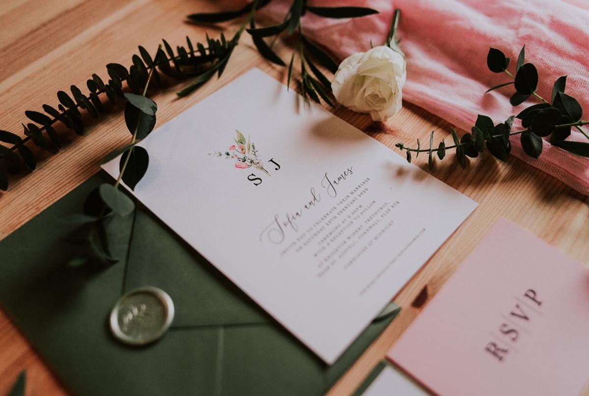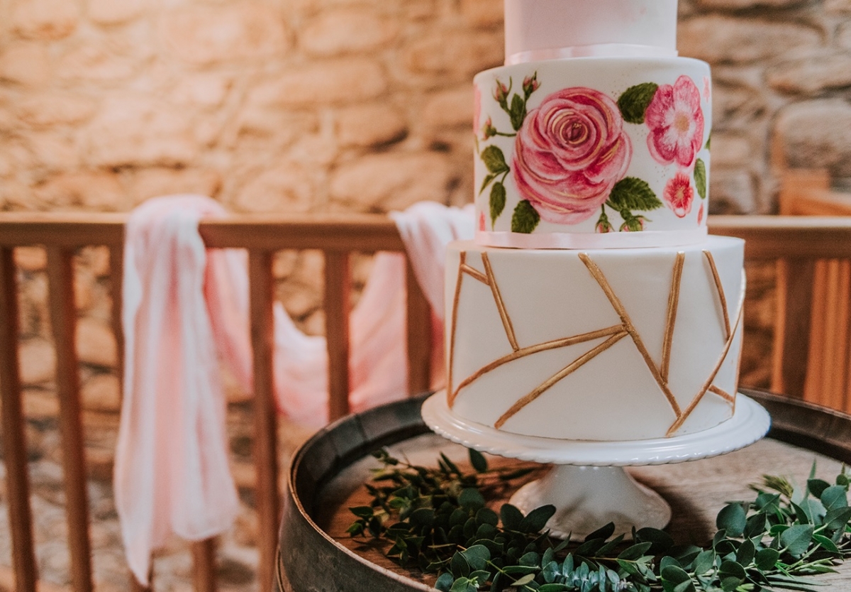 While not part of the original vision, the weather adds a captivating, elemental feel to the images, while showcasing the rustic spaces and waterside arbour of Knightor Winery. A palette of forest green and pretty pink carries through the details, from the hand-painted cake to the stationery, the colours popping against the crisp whites. Eucalyptus adds a lush, earthy vibe to the tablescape, the backdrop of exposed brick walls and twinkling fairy lights bringing rustic charm in abundance.