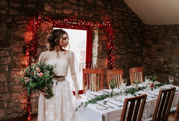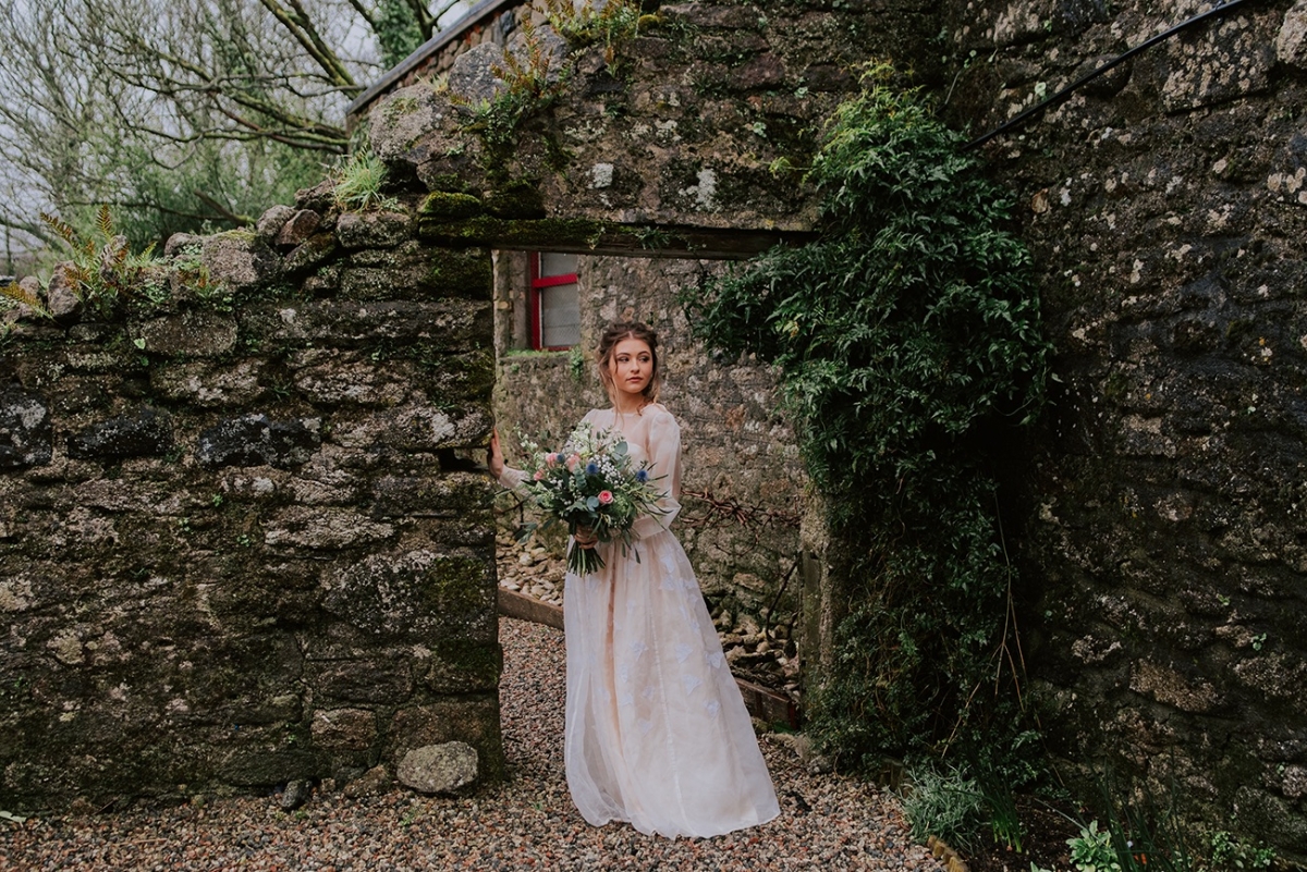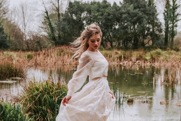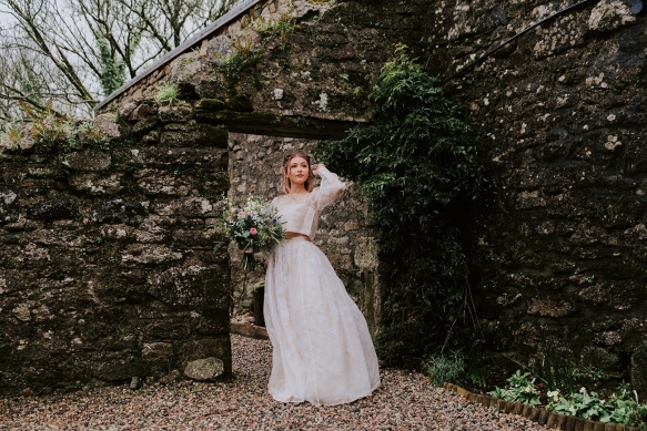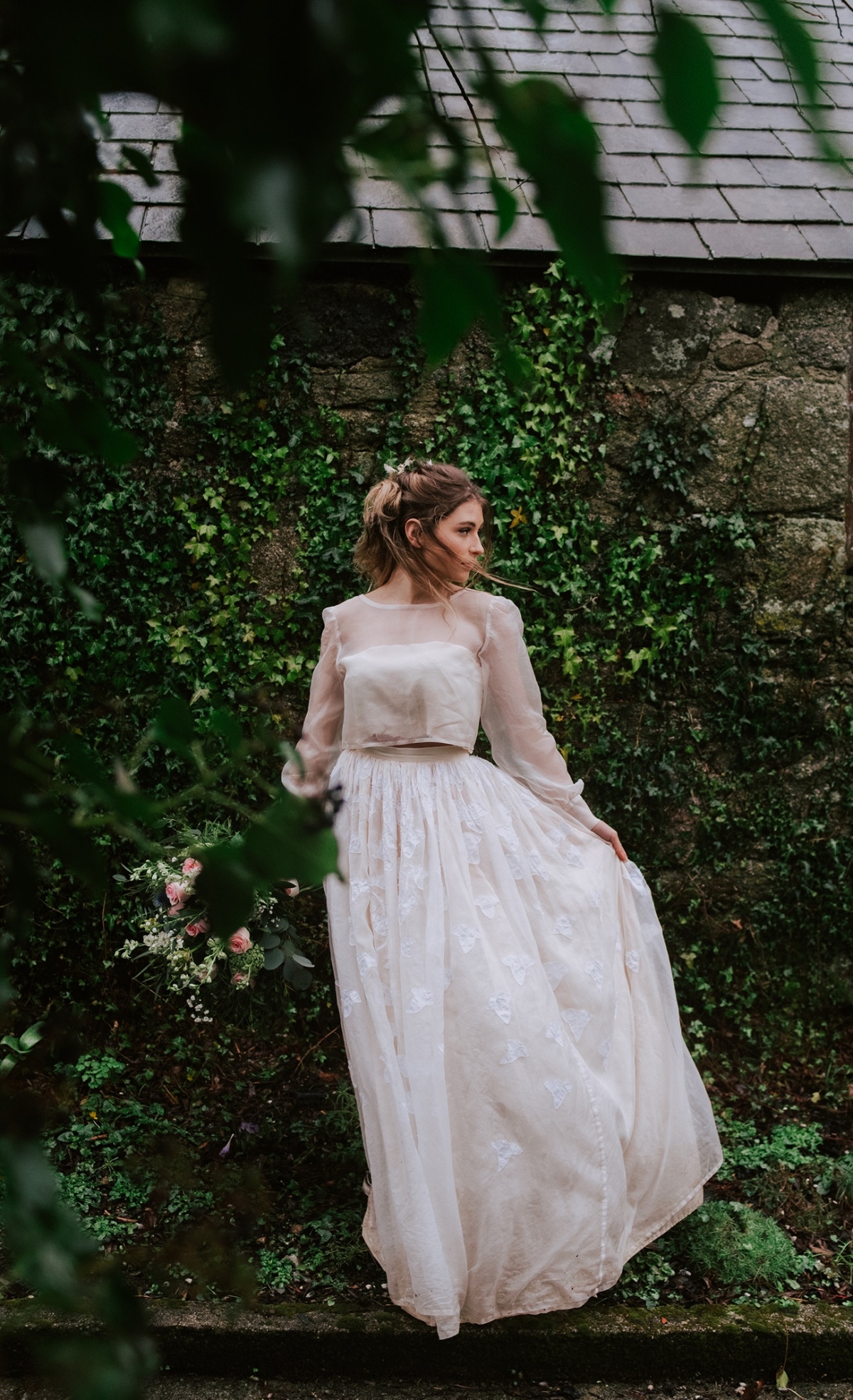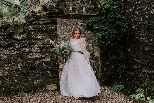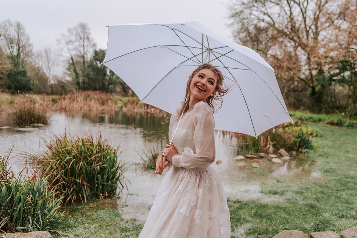 The bride, meanwhile, nails contemporary, weather-ready bridal style: her light, delicately detailed separates add playful movement, while her textured hair, adorned with wispy florals and foliage, is the perfect look for a laid-back, rustic-chic day. She carries a wild, foliage-rich bouquet dotted with pink petals ' and, of course, the ultimate wet weather bridal accessory: an umbrella!
