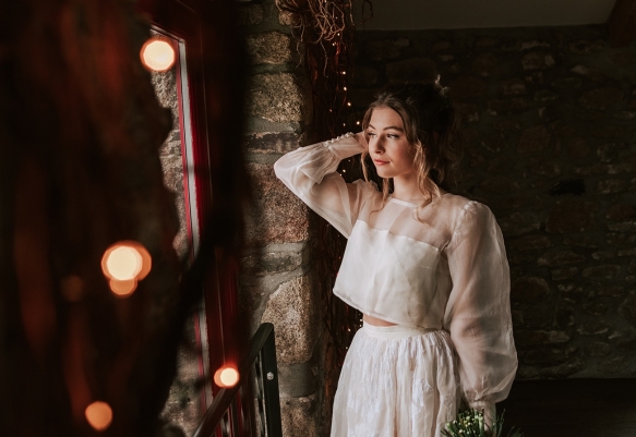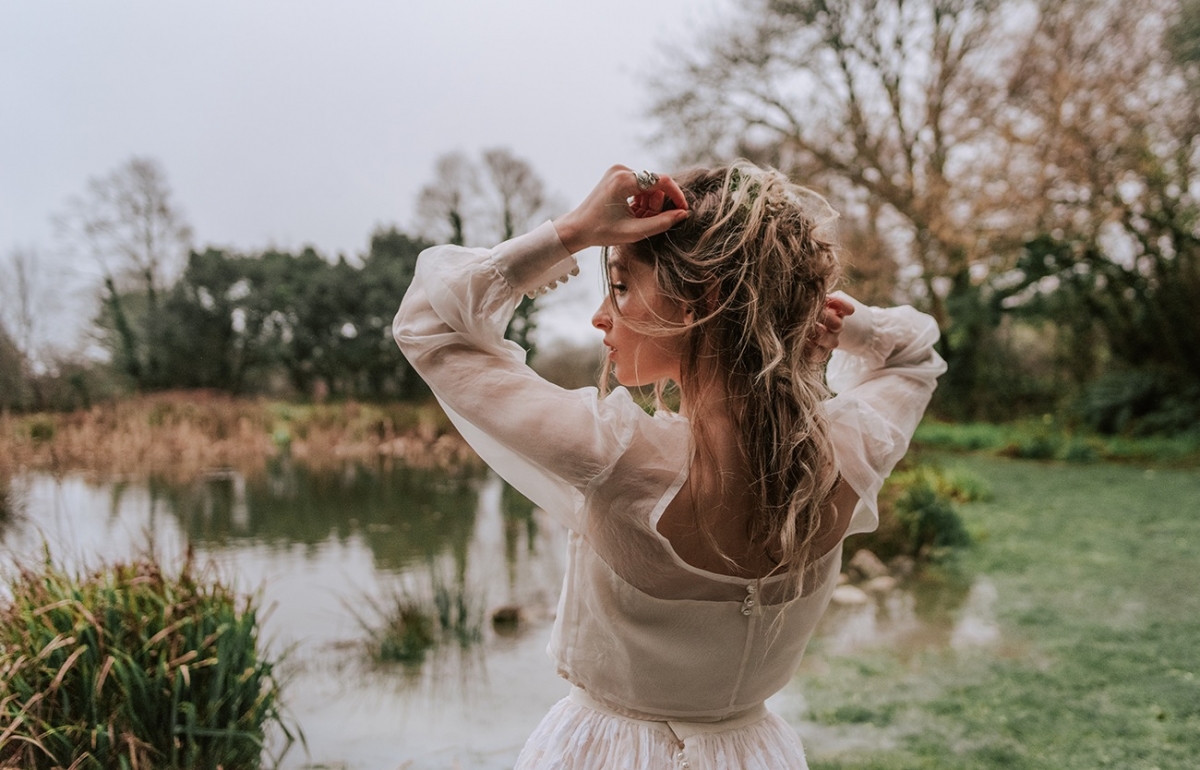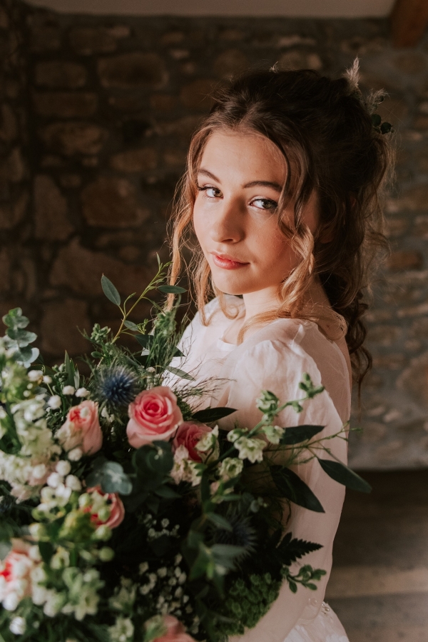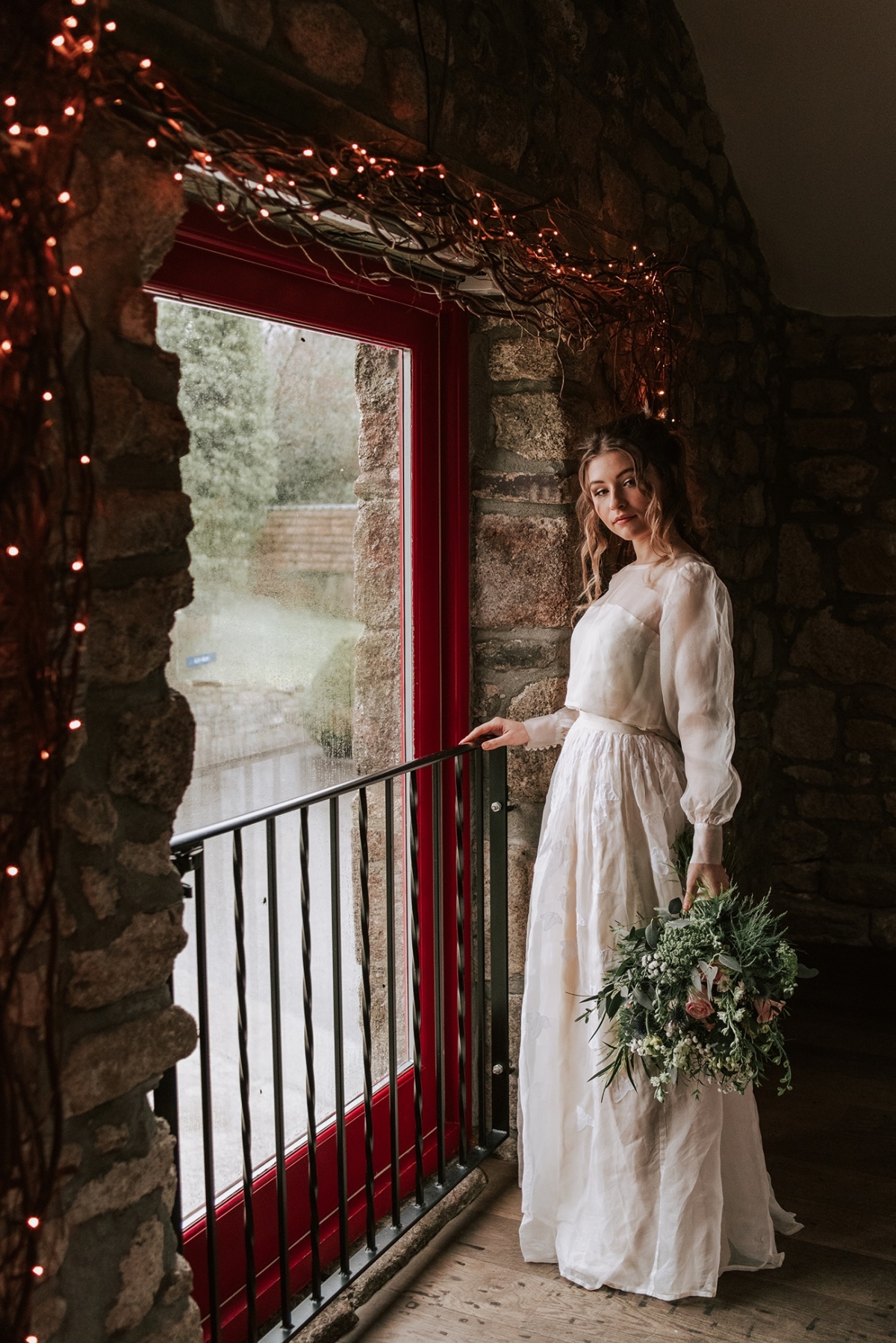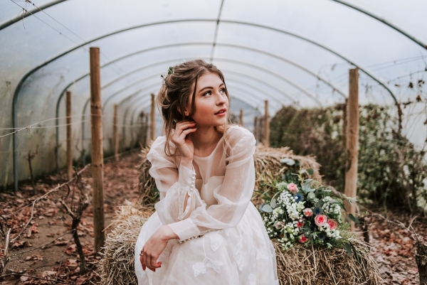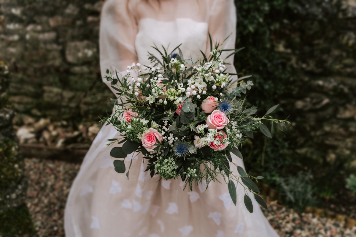 The bride, meanwhile, nails contemporary, weather-ready bridal style: her light, delicately detailed separates add playful movement, while her textured hair, adorned with wispy florals and foliage, is the perfect look for a laid-back, rustic-chic day. She carries a wild, foliage-rich bouquet dotted with pink petals ' and, of course, the ultimate wet weather bridal accessory: an umbrella!