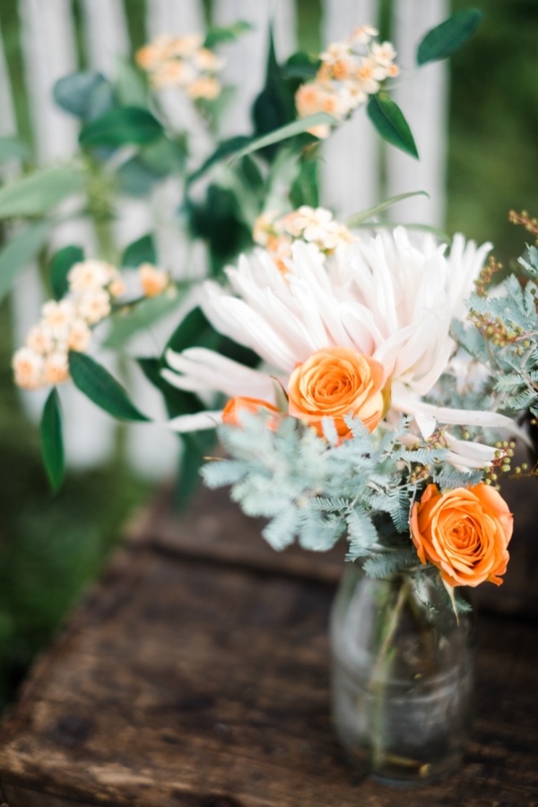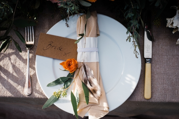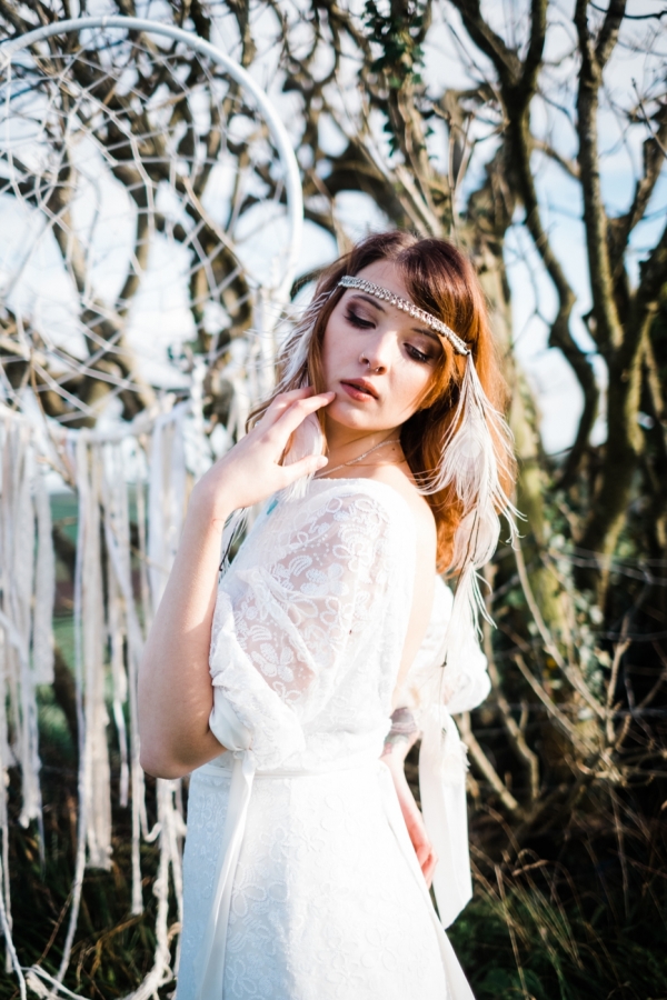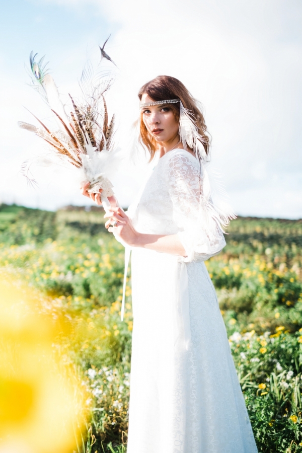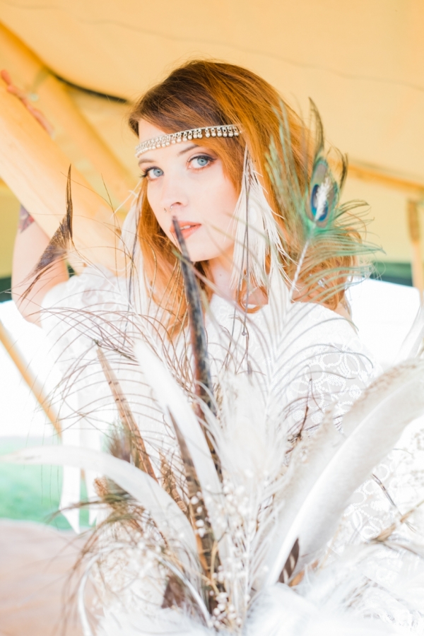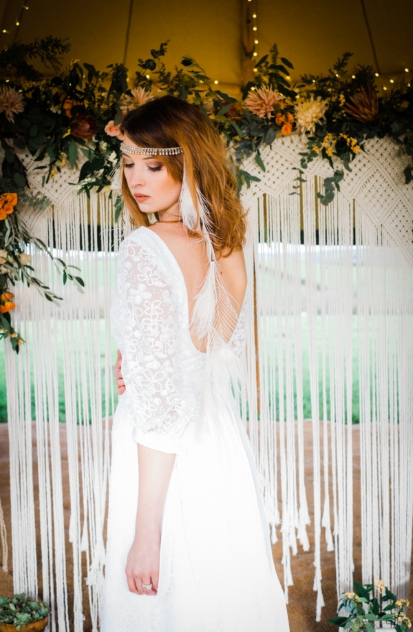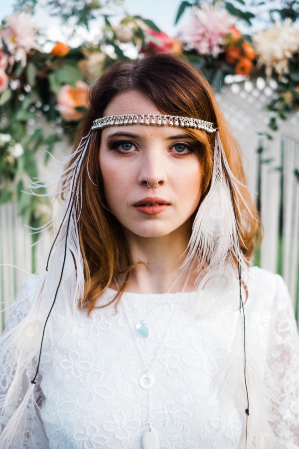 The bride's smoky eyes and tousled hair continue the relaxed, boho vibe enhanced with feathers and tiny bell-adorned headpieces alongside the vintage inspired gowns. Feathers play an important role in embracing the natural environment, incorporated in the bouquet and table decor as well as the hair.