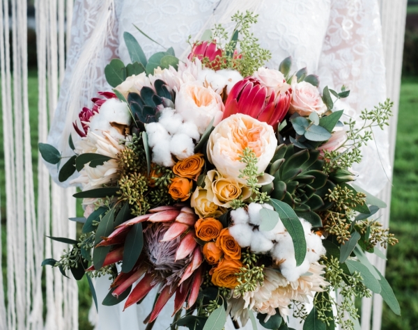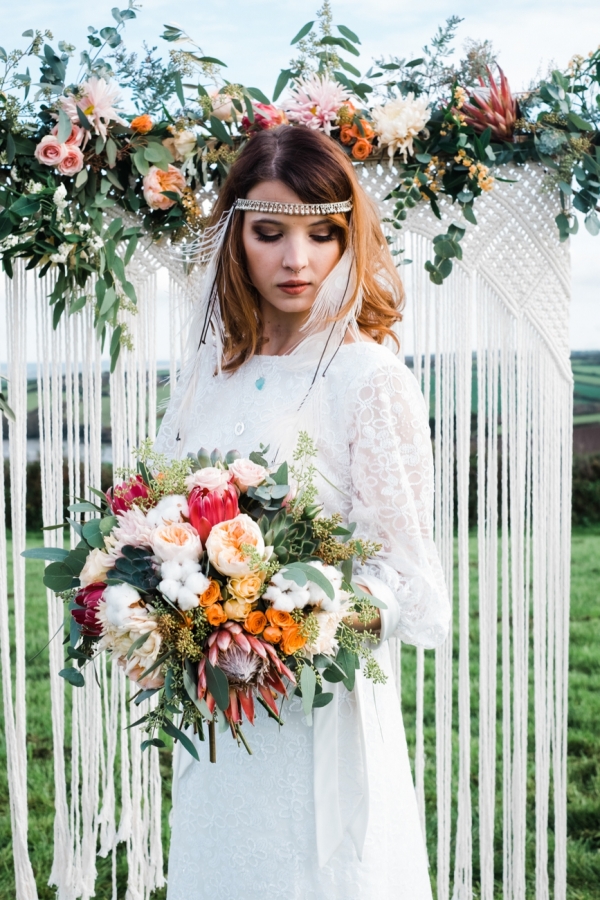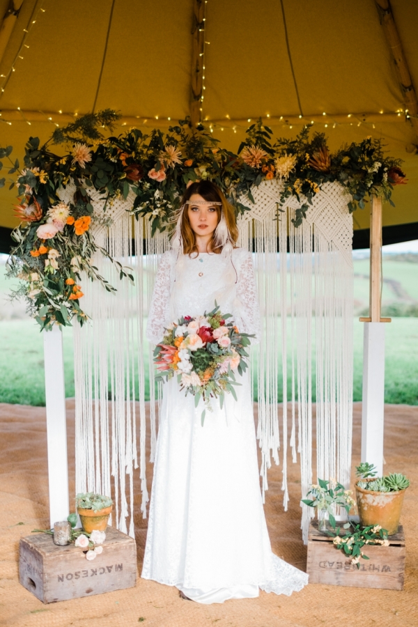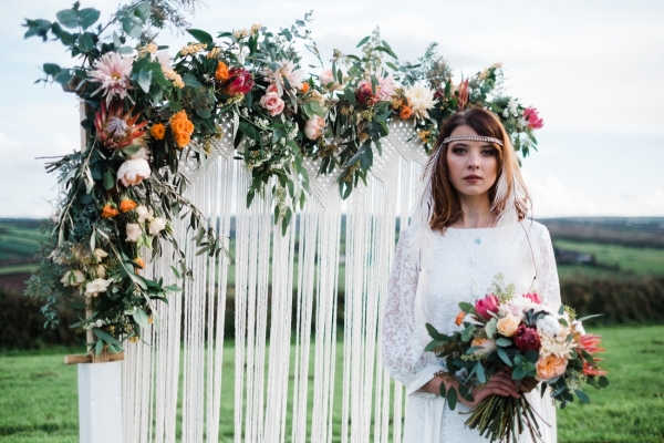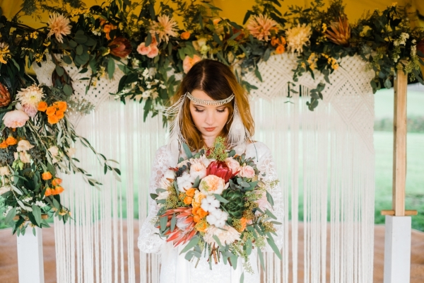 The decorative knots of the macrame ceremony arch mark a stylish point of difference from an exclusively floral design. Instead, the bright florals are used to add pops of brilliance to the scenic backdrop while enhancing the boho chic vibe.