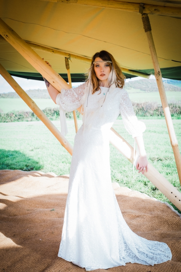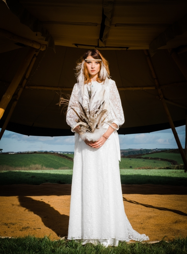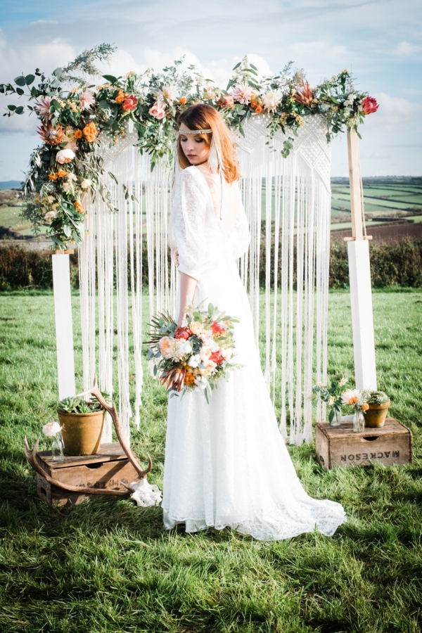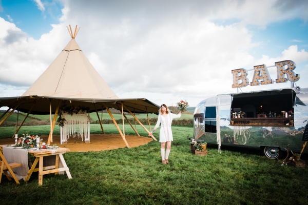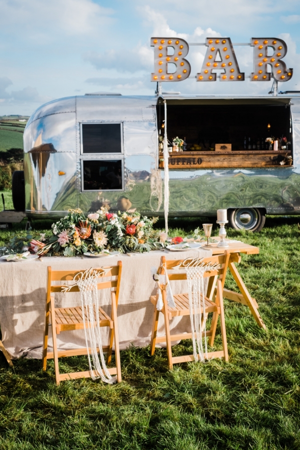 The metallic sheen of the airstream bar, the rustic wooden cake stands and the burnt orange florals all combine in the Cornish sun to sprinkle a shimmer of unbridled magic over the scene. From tall tipis and hand-drawn stationery to dreamcatchers and sheepskin rugs, it's a romantic balance of luxe and carefree; whimsical in nature but superb in its effect.