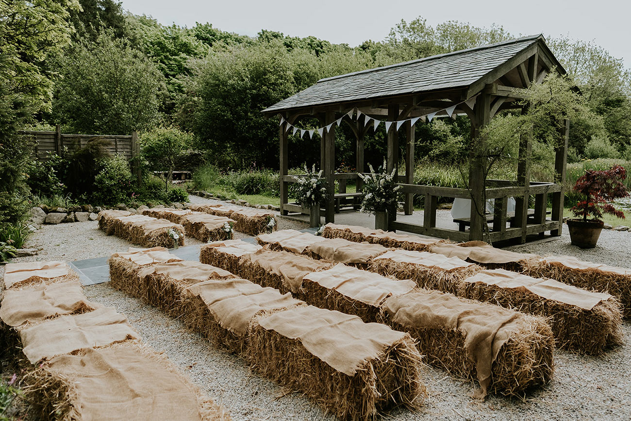 Tapping into the creative talents of friends and family to help achieve their autumnal vision, a friend made the three-tier wedding cake comprising Guinness chocolate cake, Victoria sponge and carrot cake, while one of Loretta’s bridesmaids arranged the floristry, including gorgeous garlands on the tables. Knightor’s 18th century barn was a carnival of rich autumnal colours, carrying from the posies of flowers in jam jars and bottles to the arrangements of dried flowers filling jugs and watering cans, which sat atop log slices dotted with pine cones.