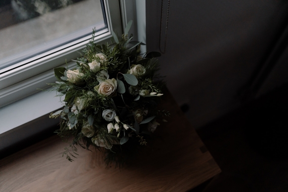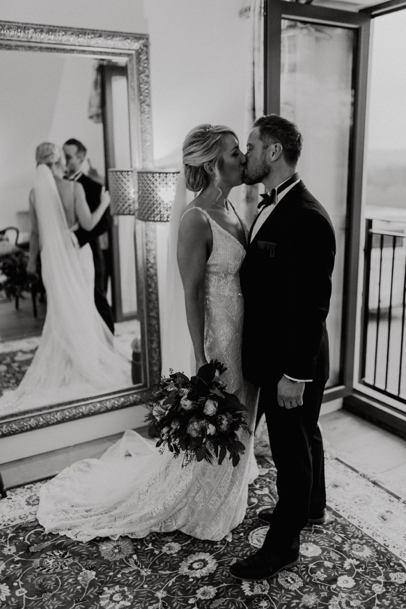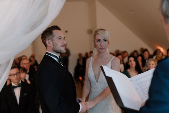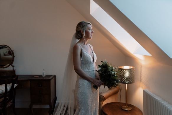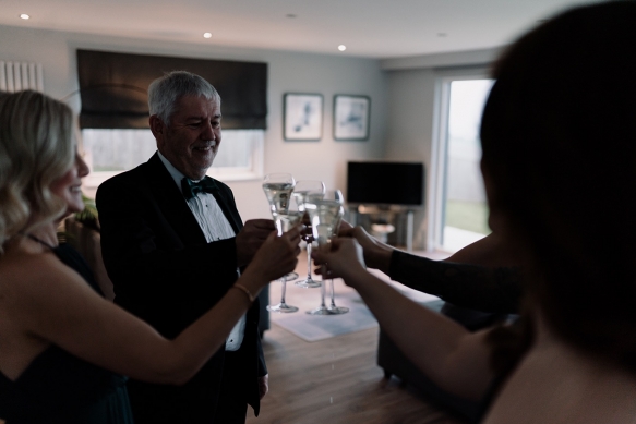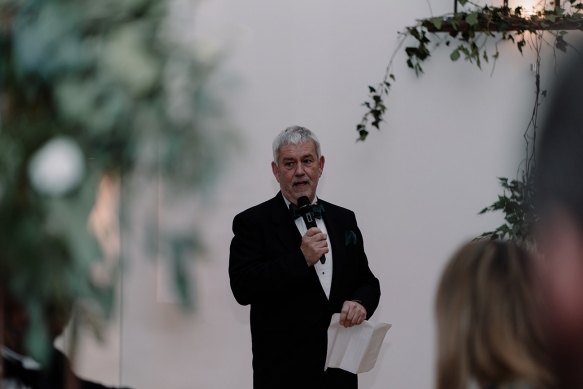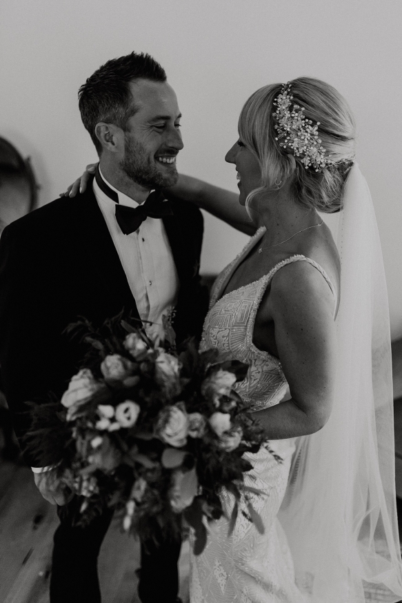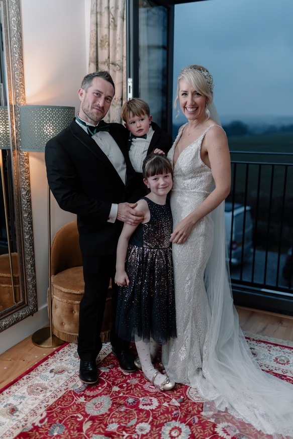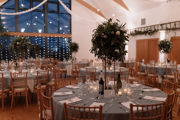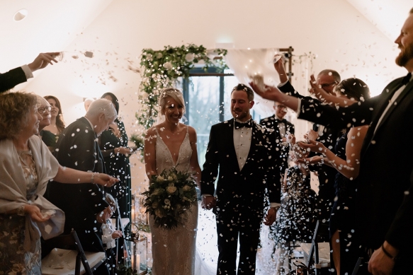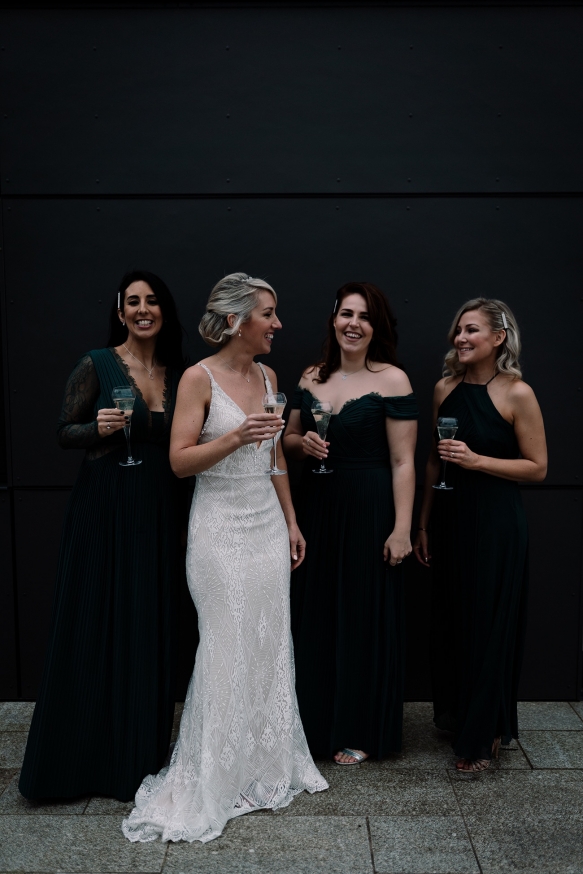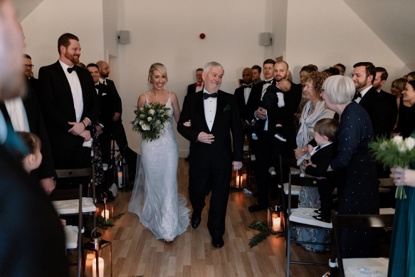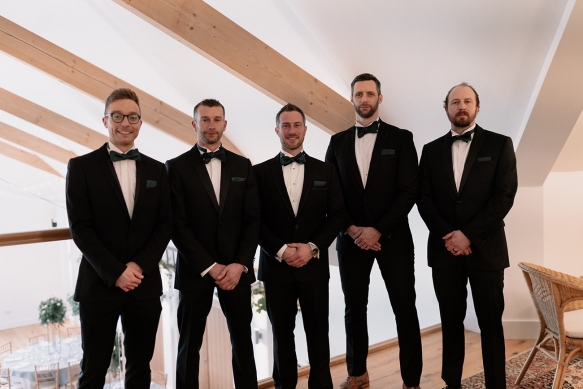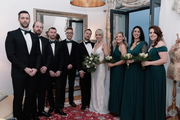 Classically glamorous touches carried throughout, from the foliage-filled centrepieces dotted with cream blooms to the elegant drapes and carnival of tea lights and fairy lights which enhanced the magical atmosphere. The bridesmaids wore chic gowns in shades of dark green and black teamed with softly waved hair, while Ellie dazzled in a gorgeous beaded gown that paired perfectly with the dapper tuxedos of Ben and his groomsmen.