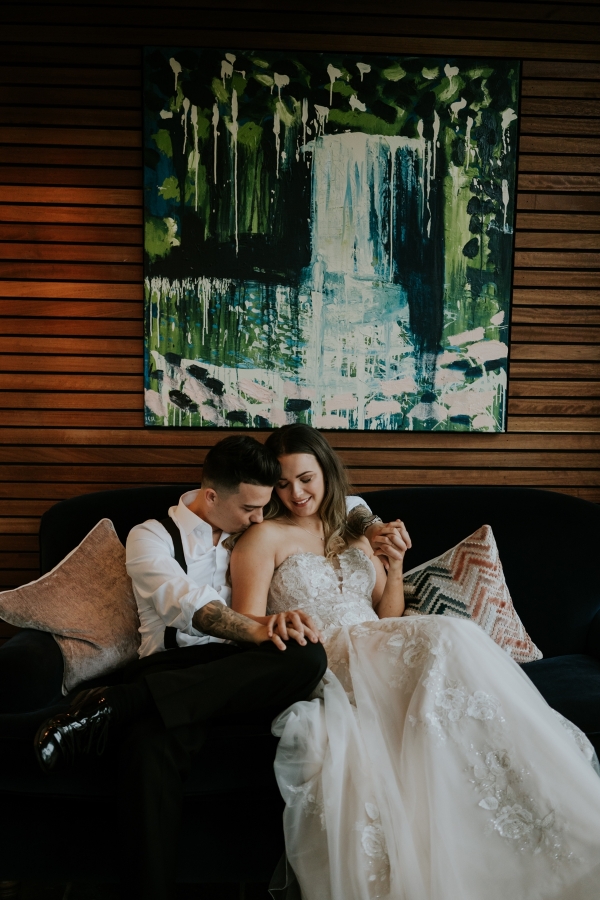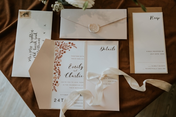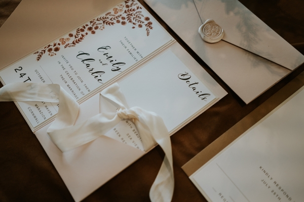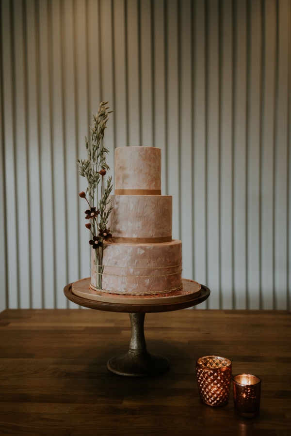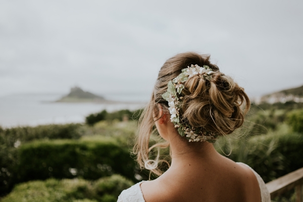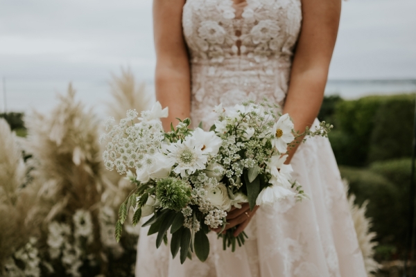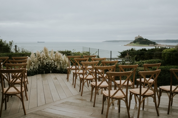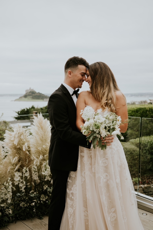 With a carnival of delicate white blooms and pampas grasses as a breezy backdrop, the Cornish sea beyond, it is difficult to imagine a dreamier setting for a wedding ceremony. The bride holds a bouquet of dainty petals, which echo the lace embellishment of her whimsical bridal gown, while the groom's dinner suit exemplifies the luxurious keynote of the aesthetic. Then there's the cake: a texture-rich vision of creamy latte and caramel tones so perfectly reflective of the stylish, comforting interiors of this seaside sanctuary.