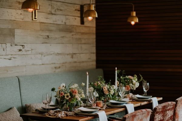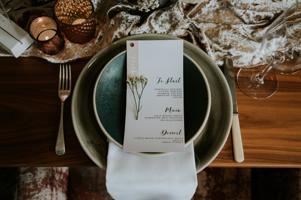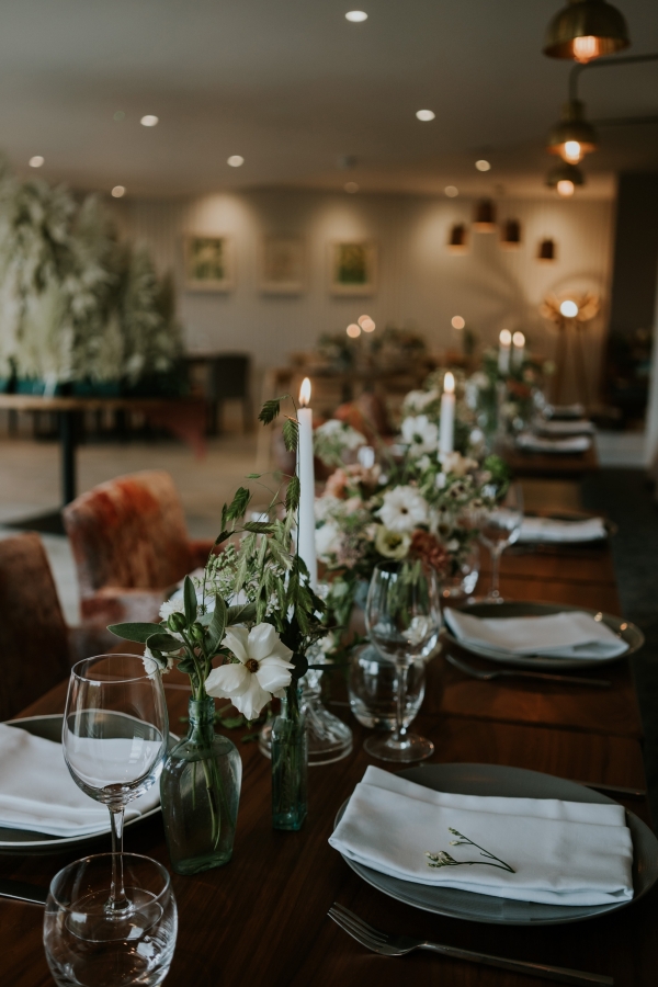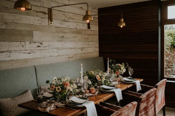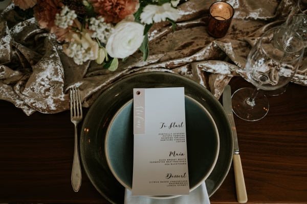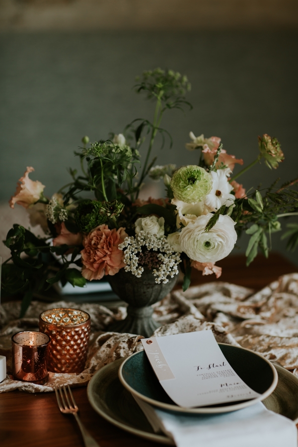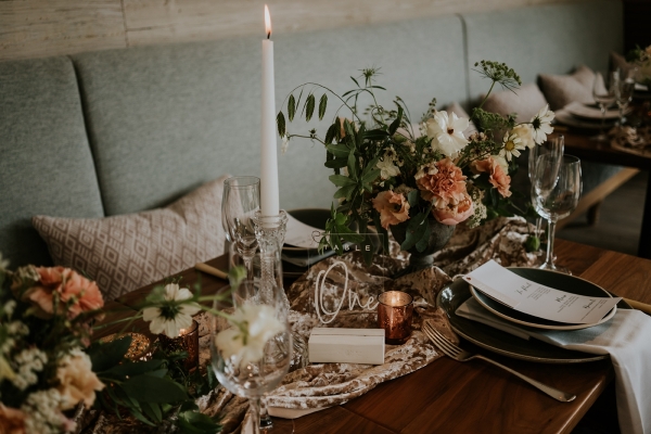 Drawing on the surroundings and warm tones of the boutique hotel, a palette of sage green and white meets soft shades of blush, peach and light brown. The hues find beautiful form in the floral arrangements, the silken, softly coloured petals spilling from small urns across the tablescape. Organic textures, plush velvet and pampas grasses play into the mood of relaxed elegance, complementing the restaurant, with its muted hues and accents of wood and copper. The table styling works just as beautifully on the terrace, where the colours and natural textures blend seamlessly into the landscape, the iconic sight of St Michael's Mount offering a captivating focal point.