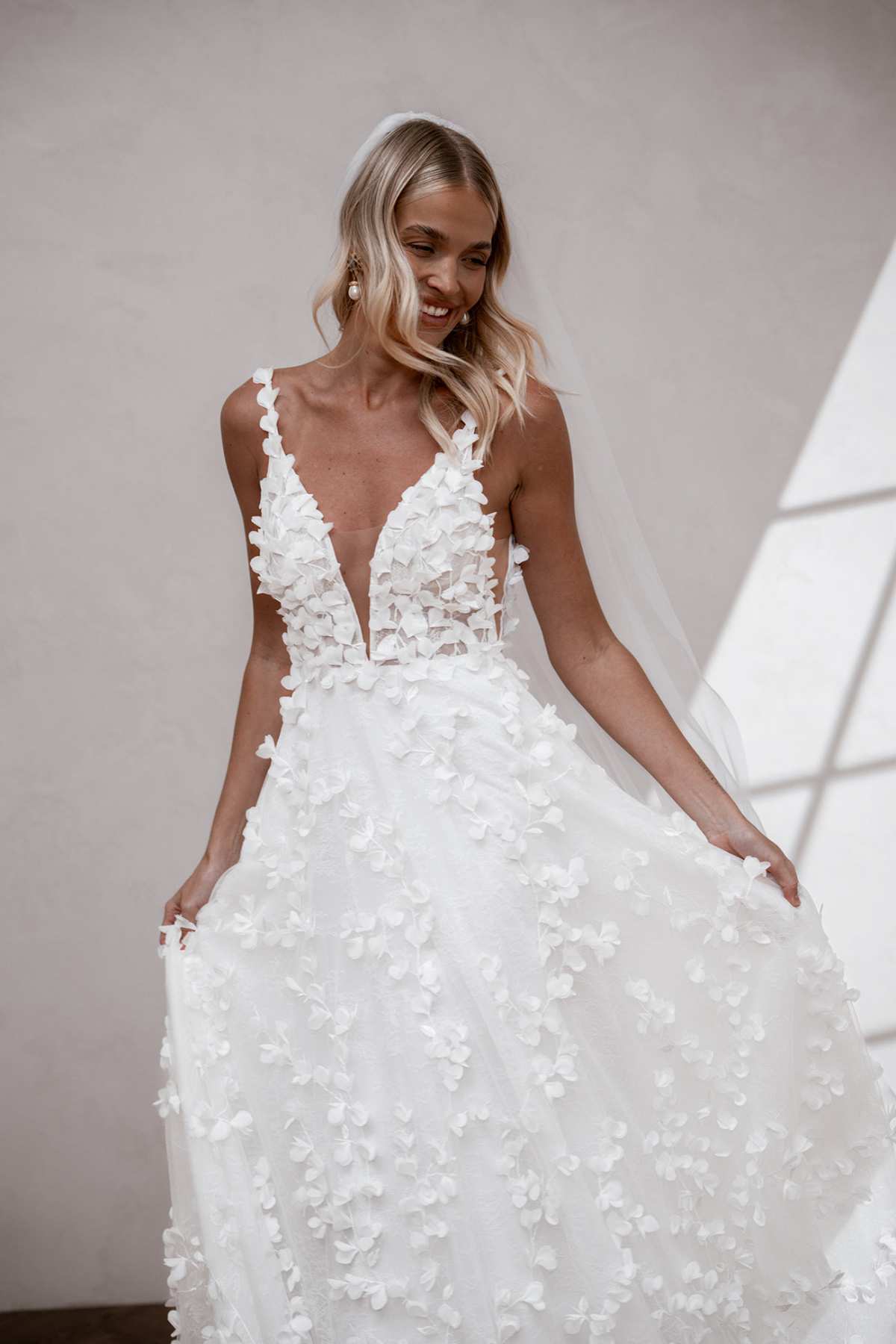 Cooper's heavenly texture and movement will have you in a romantic trance all day long. Combining illusion tulle side cut-outs, a plunging neckline and a light, flowy skirt, the gown is incredibly comfortable to wear, while the cascading 3D florals spell pure enchantment.