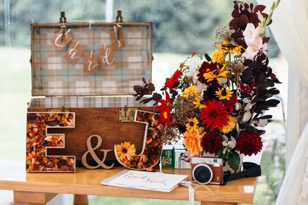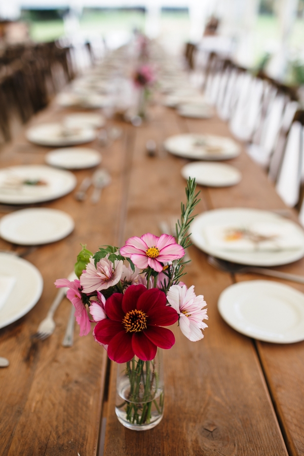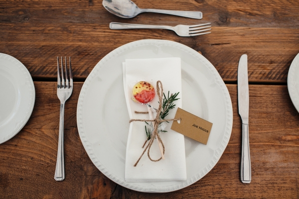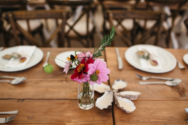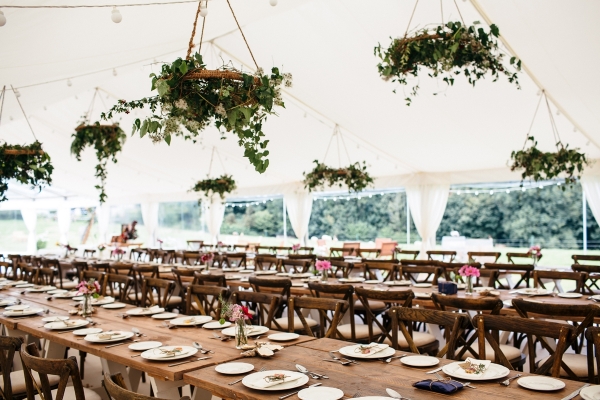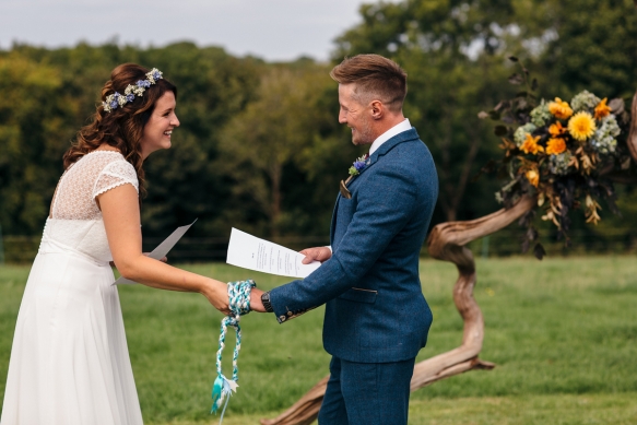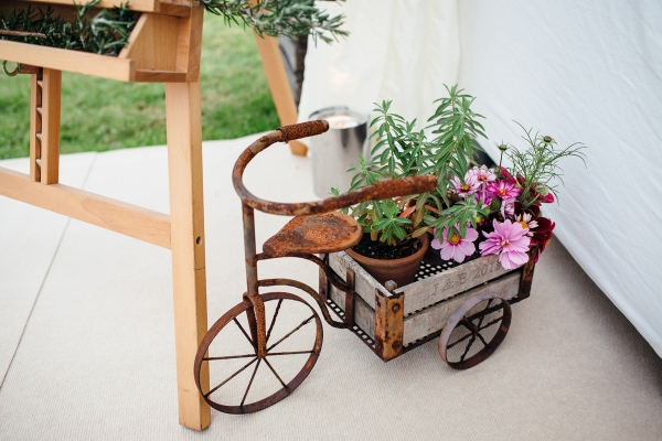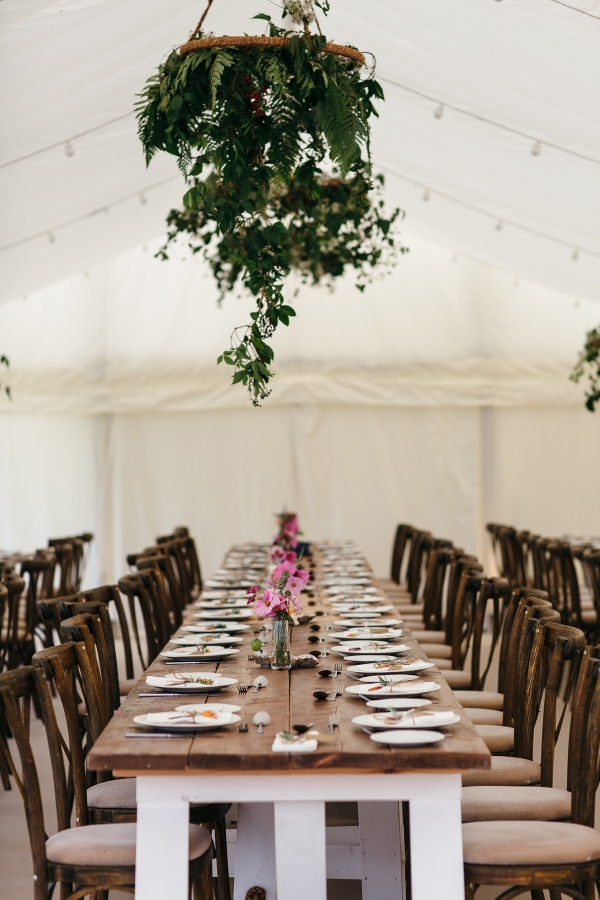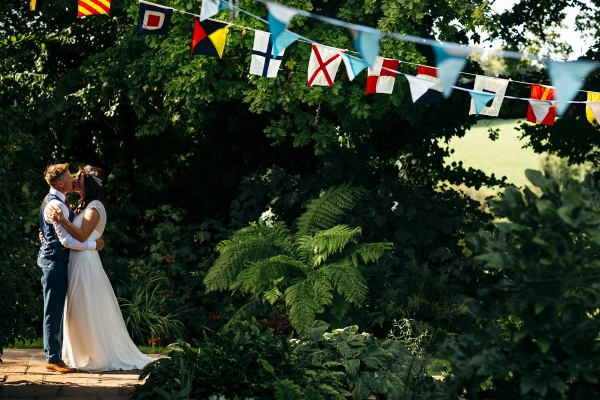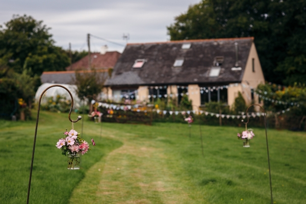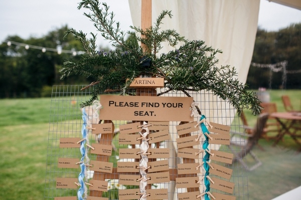 Following a home-grown and handmade theme with blue as the principle colour, the day featured an array of personal touches such as using Ellie and Joe's "big white fluffy cloud" dog's fur that had fallen out to make wool for the hand-fasting rope used during the ceremony. Ellie's mum grew and arranged all the flowers, from hanging bicycle wheels in the marquee to the buttonholes, corsages and jars of flowers on the tables, while touches such as Ellie's late grandfather's sail flags added to the poignant decor.