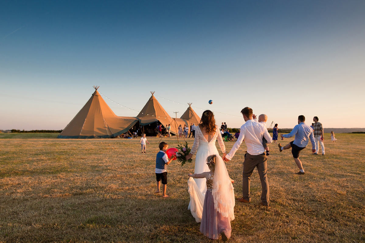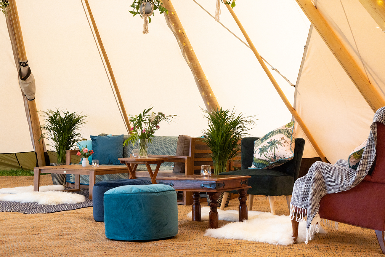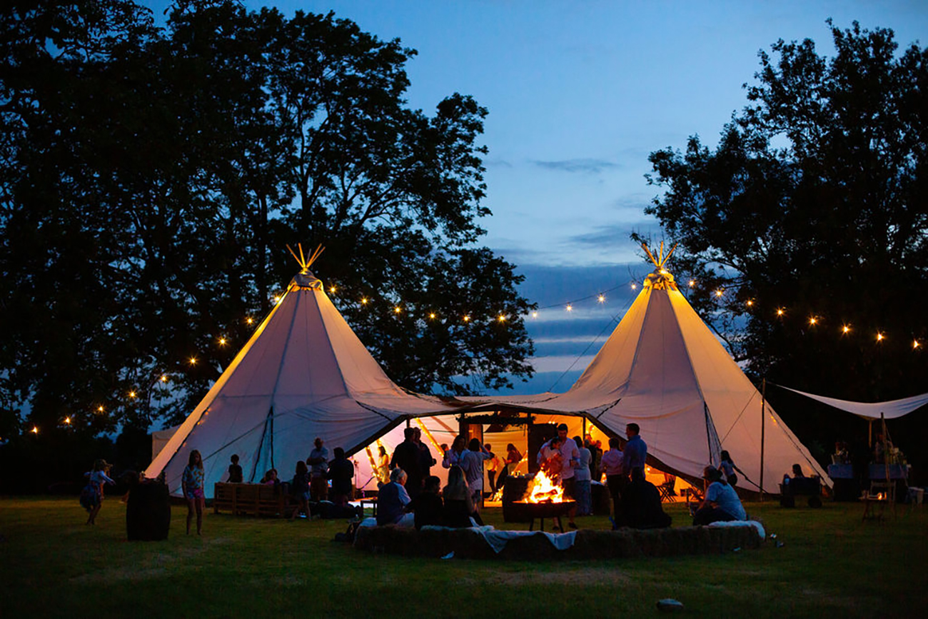 “I like to keep the lighting in our tipis and tents simple,” says Charlotte. “You don’t need bright lights unless you want to spotlight performers. Twinkly fairy lights wrapped around our poles offer a warm ambience after dark and reflect off the ivory white canvas. Candles also offer warmth and intimacy. Festoon lights strung between the tipi peaks are great for offering light outdoors so you can enjoy the warm summer nights. And a firepit is a great way to offer cosy natural light and warmth after dark.”
