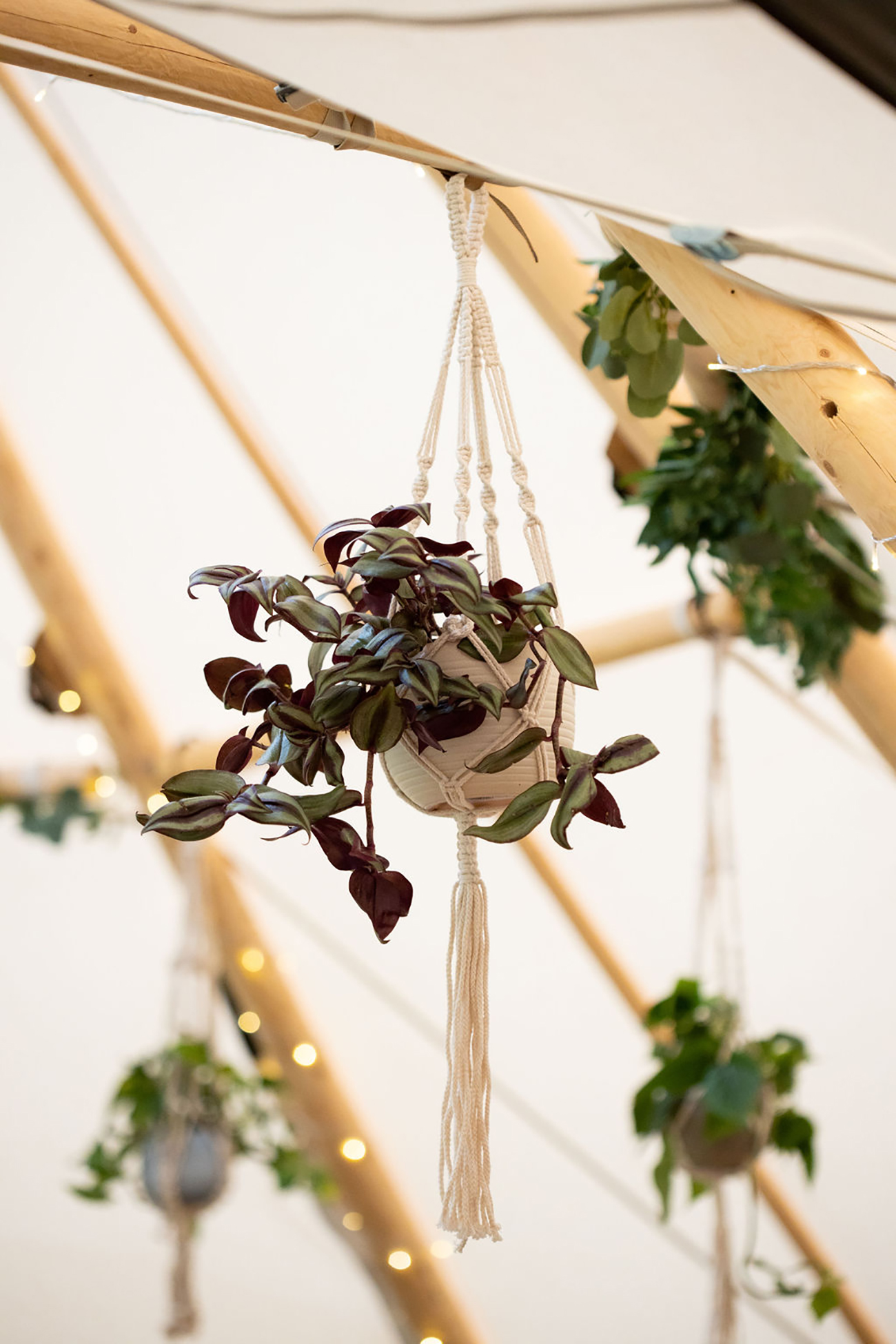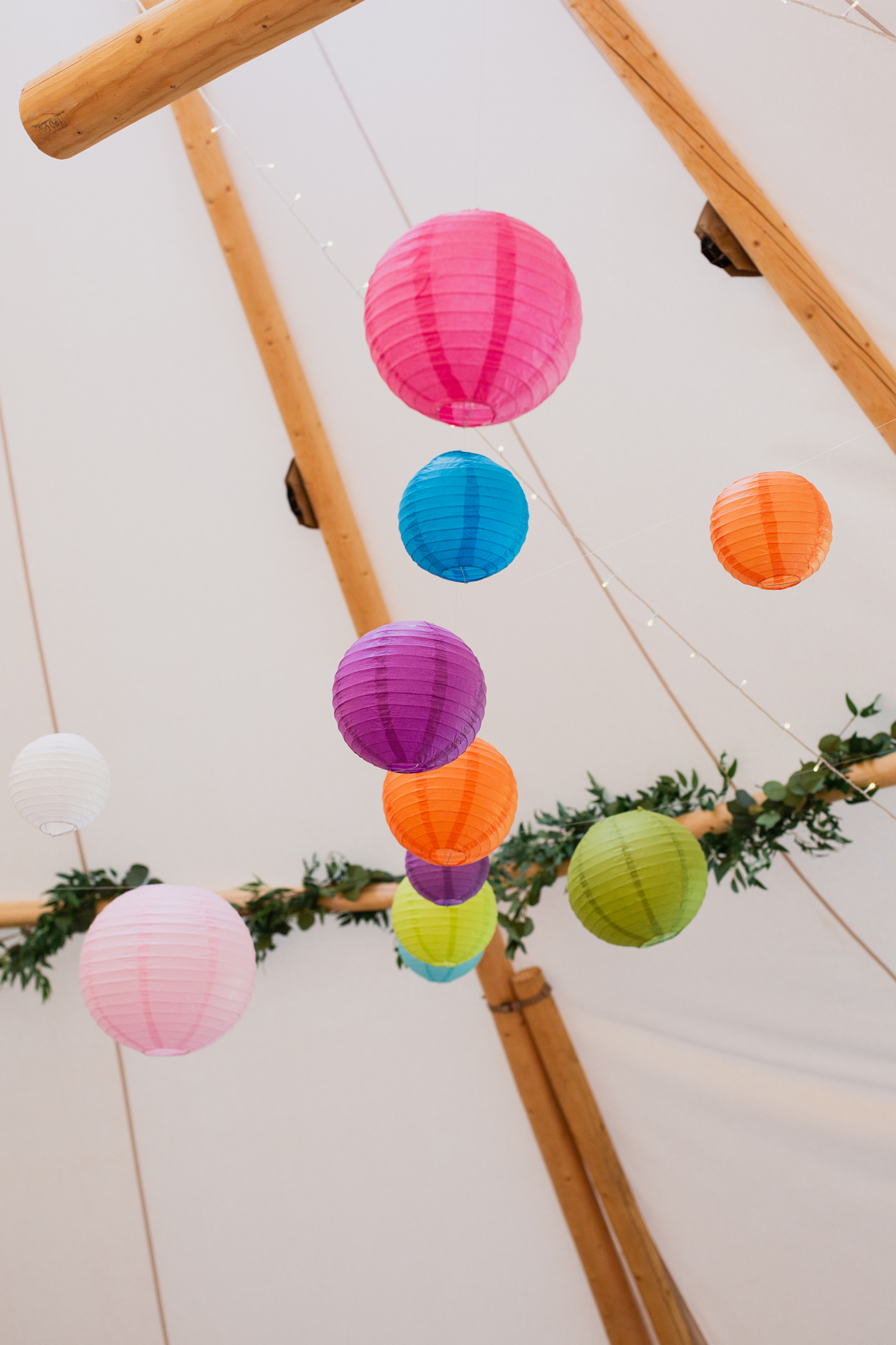“Tipis offer lots of places to hang decorations,” says Charlotte. “I use invisible nylon thread to hang brightly coloured lanterns between the poles. You can’t see the thread, so the lanterns look like they’re floating. Our tipi linking poles are a great place to create a hanging table arrangement over a long table. Hanging tea light holders look beautiful sparkling overhead.”