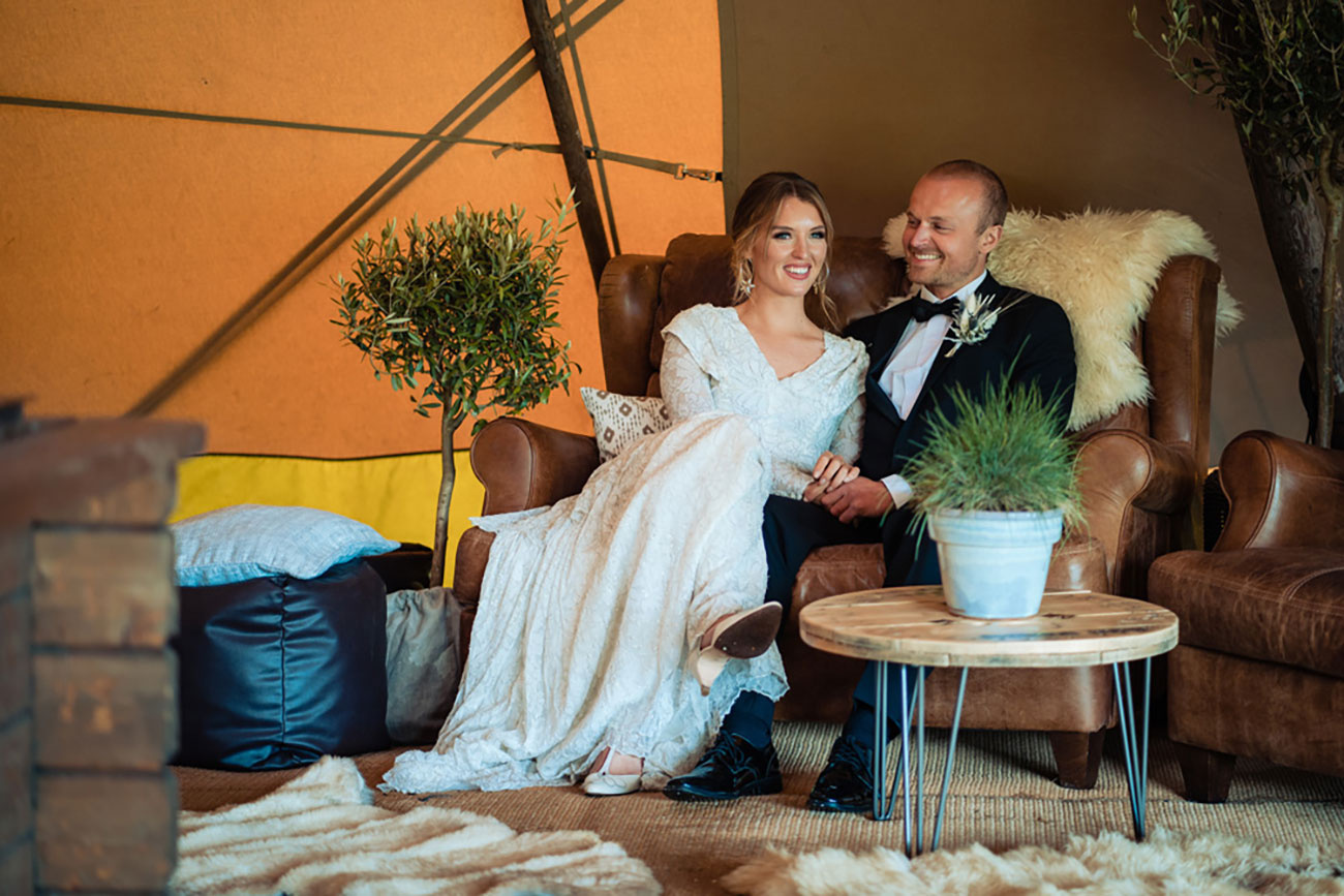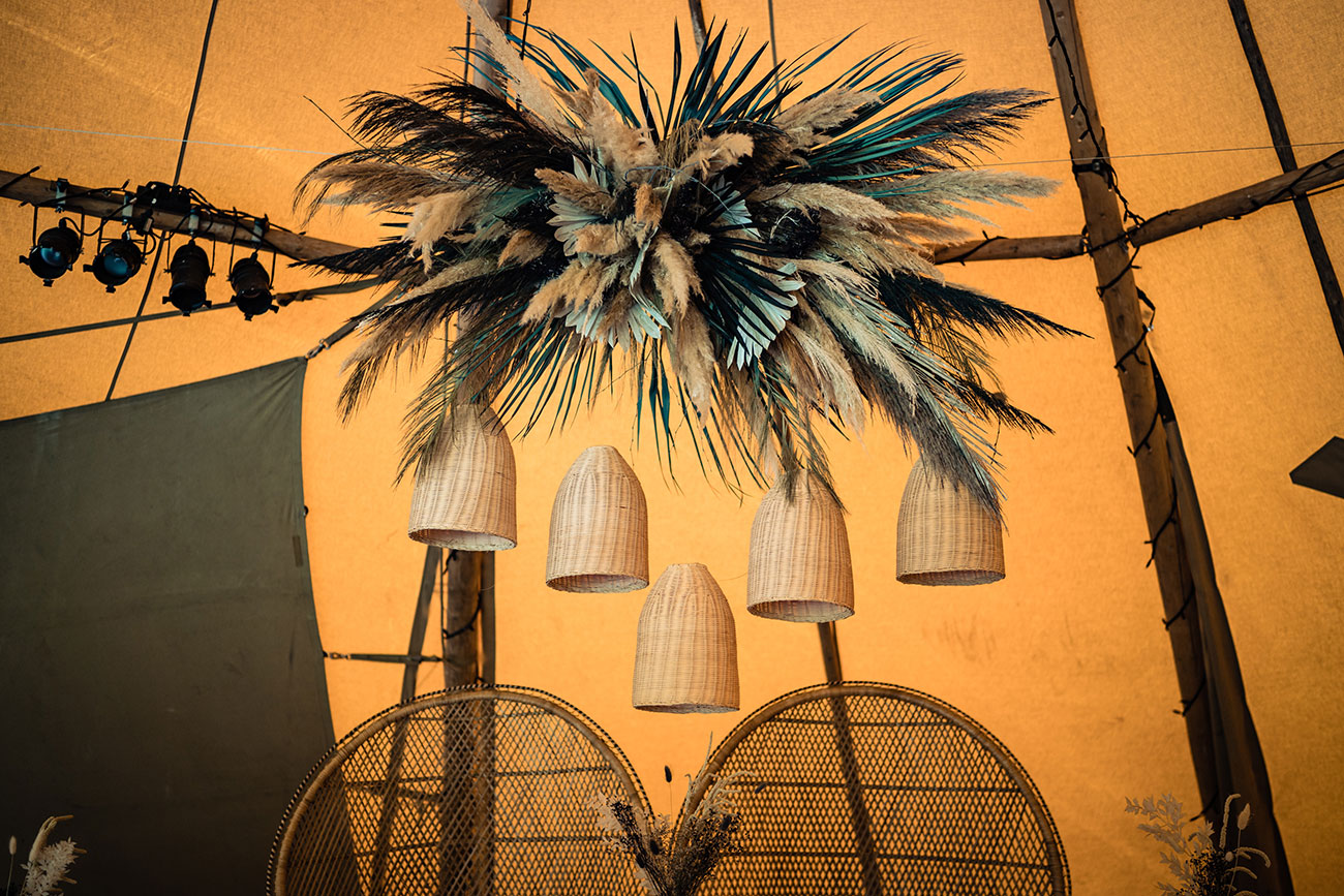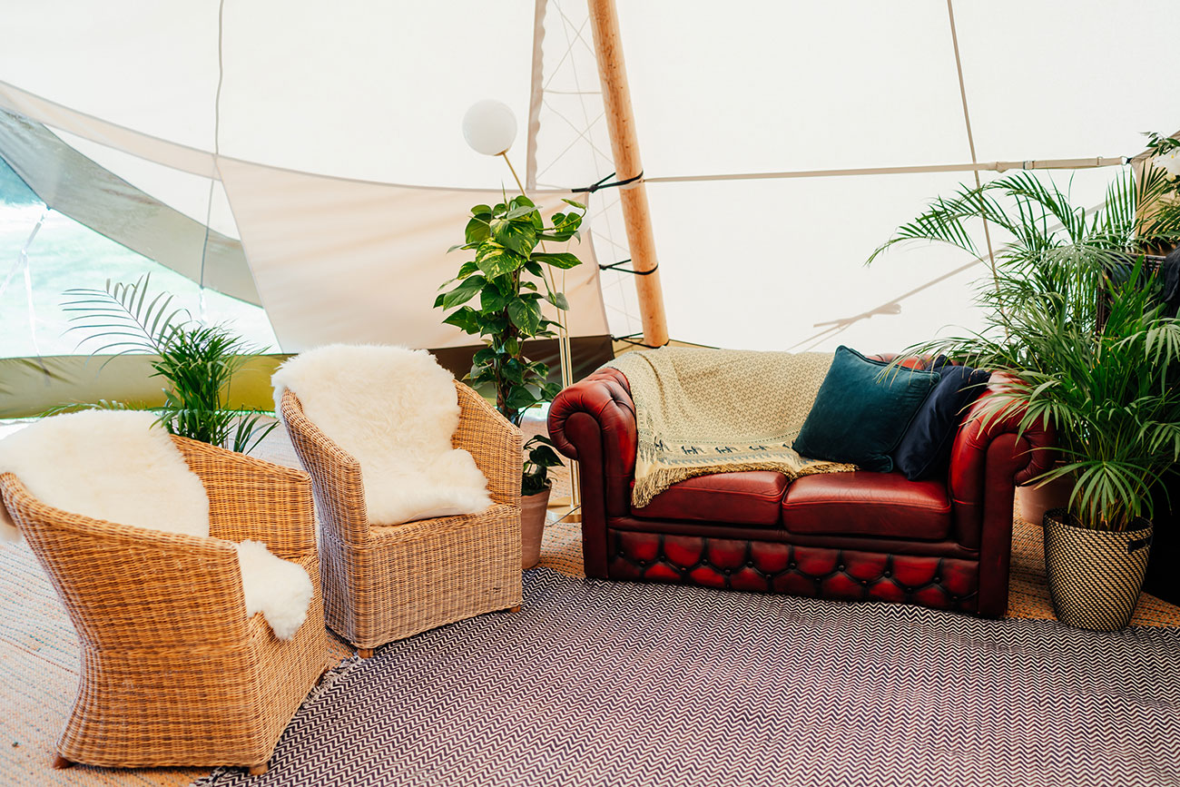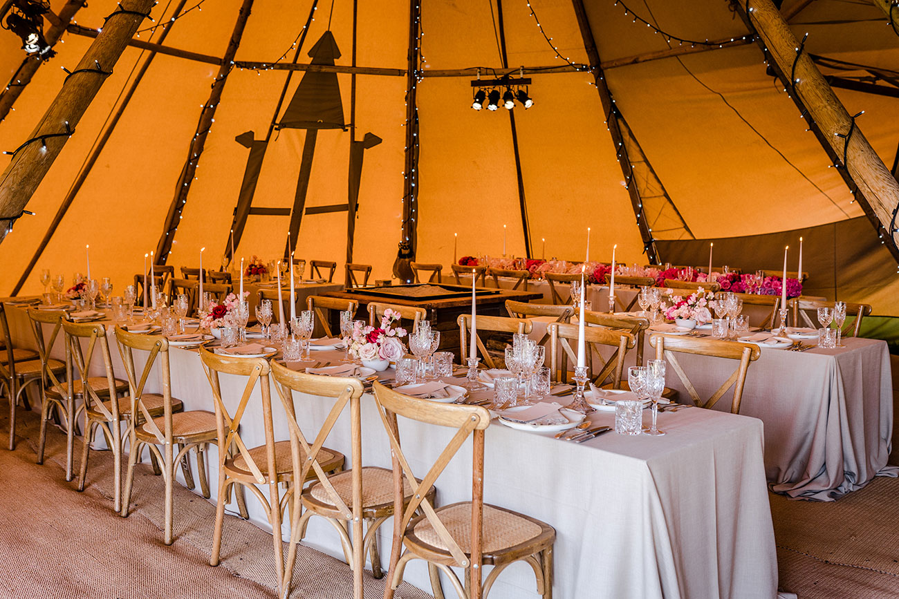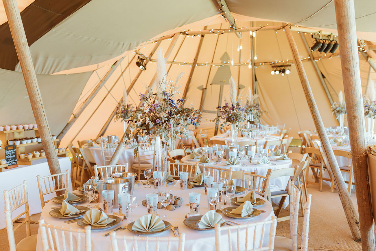 If you have plenty of space and a large guest list, then a series of structures – perhaps including a bar, chill-out tent and kids’ tent – will create a festival vibe where guests can mingle and roam throughout the course of the celebrations. Add colourful flags, a glitter bar and live music for a party to remember – and how about a naked tipi for the ceremony?
