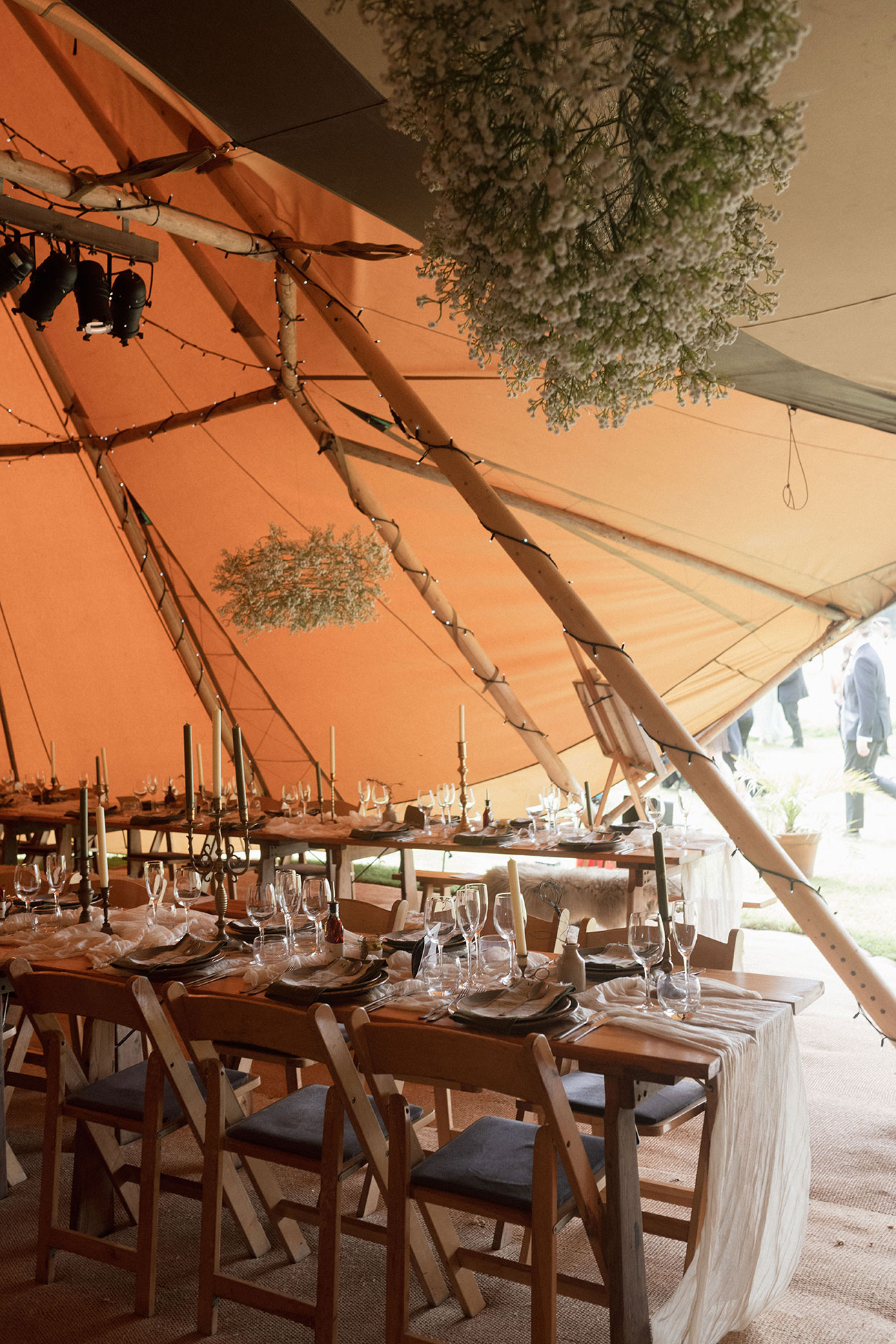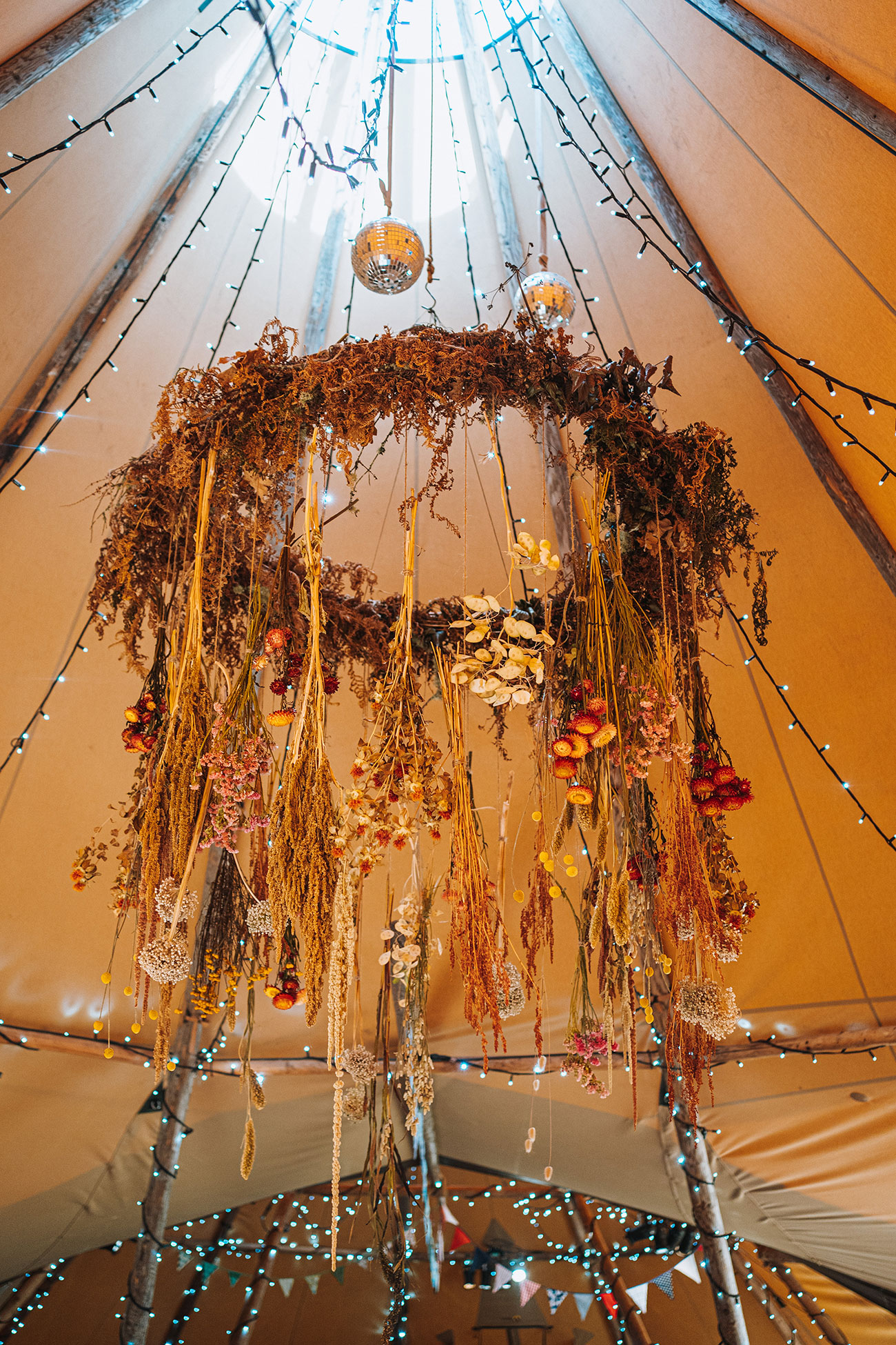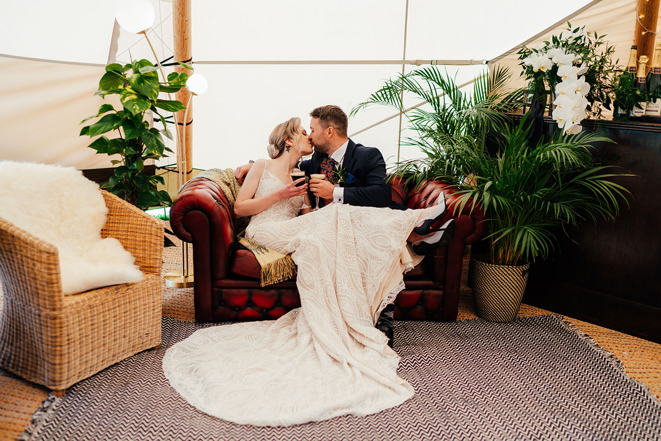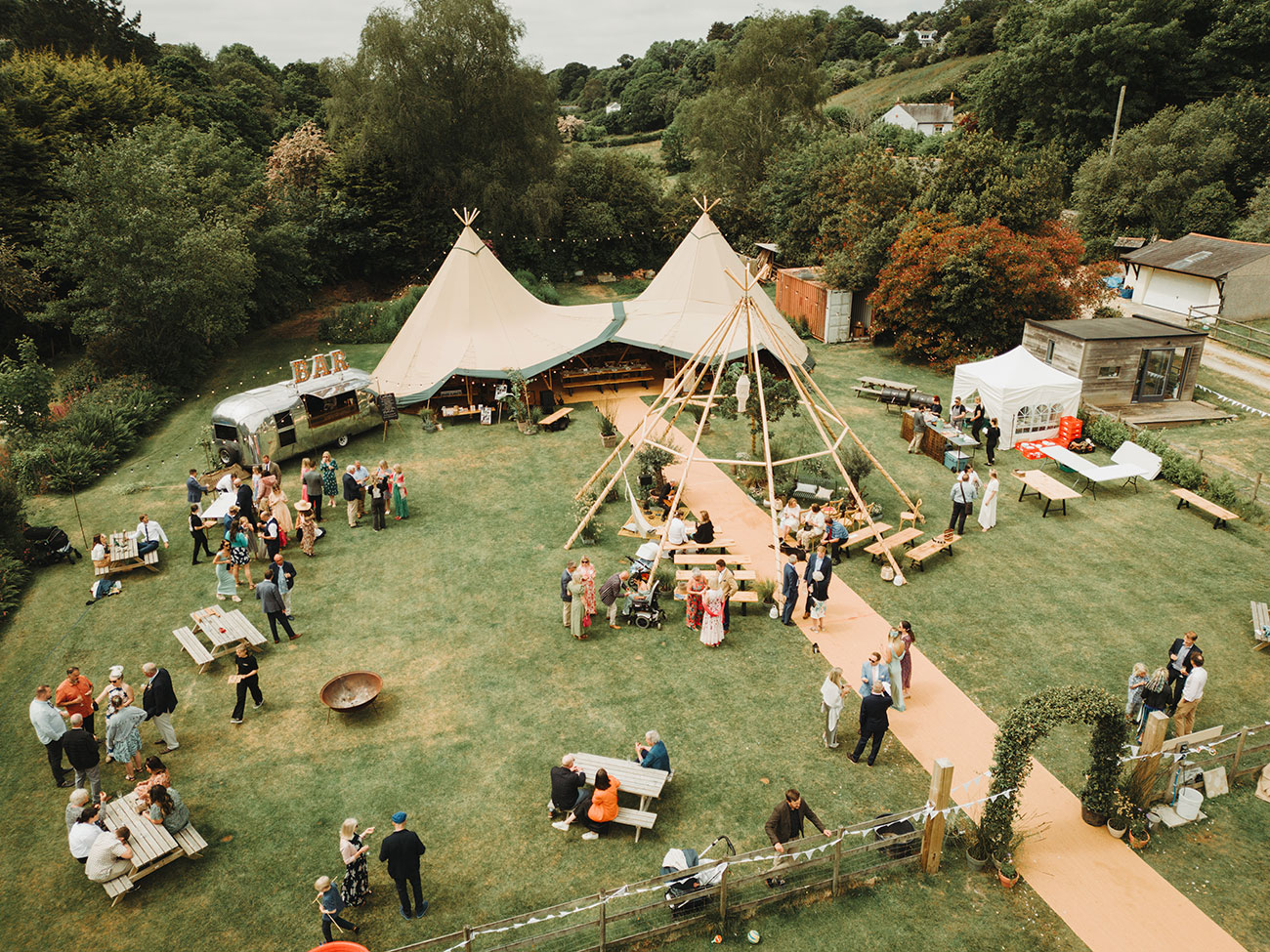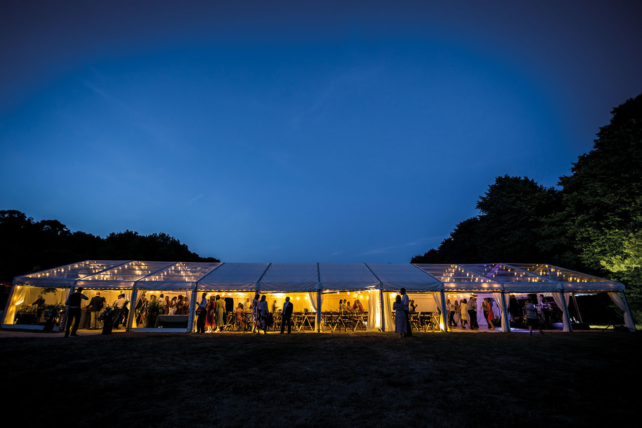 If you have plenty of space and a large guest list, then a series of structures – perhaps including a bar, chill-out tent and kids’ tent – will create a festival vibe where guests can mingle and roam throughout the course of the celebrations. Add colourful flags, a glitter bar and live music for a party to remember – and how about a naked tipi for the ceremony?