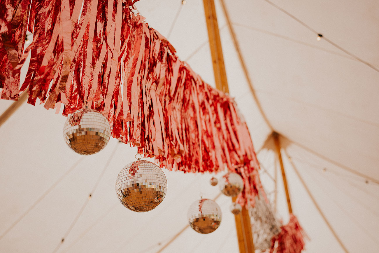 Inject fun into your party space with playful details. These colourful paper lanterns pop against the canvas of this Tipi Spaces tipi, while these combinations of streamers, lanterns and glitterballs scream party!