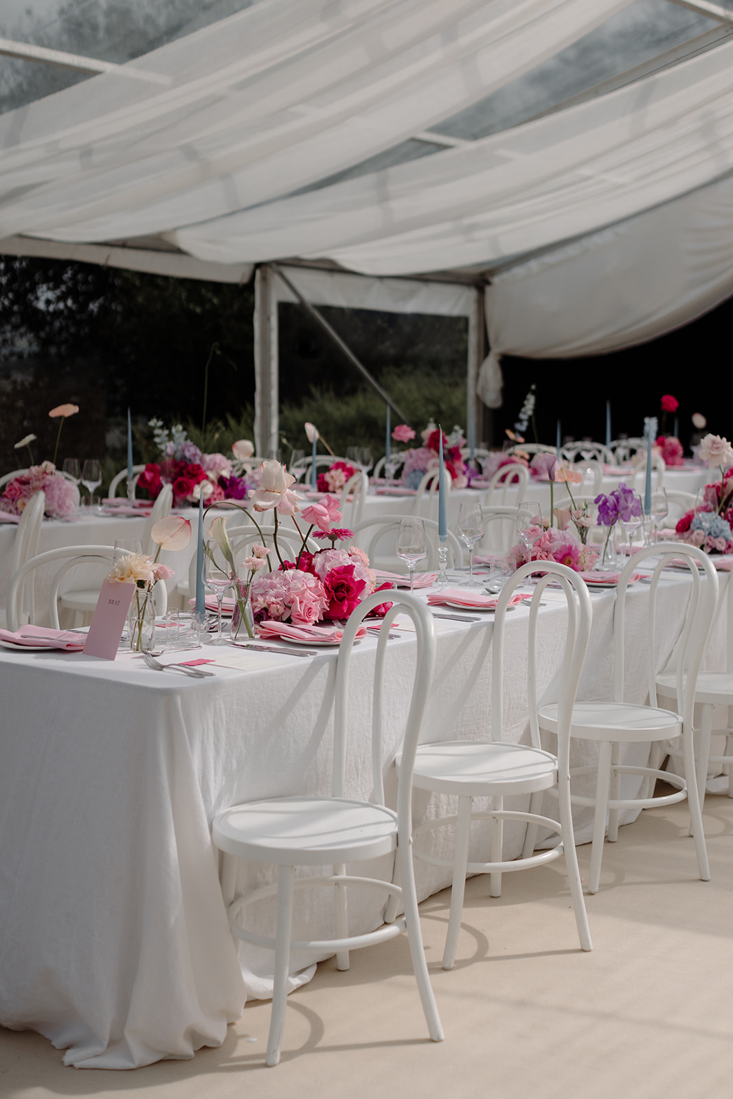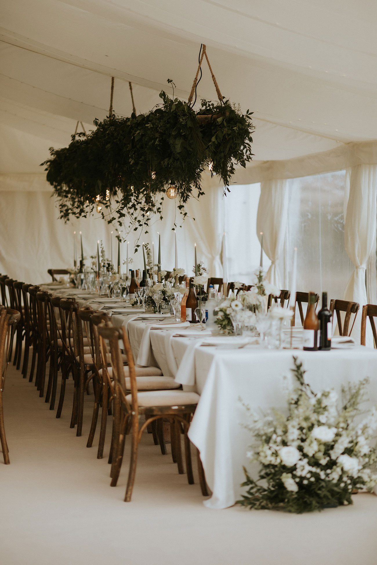Whether you’re envisioning a sophisticated scene, styled with an abundance of crisp white roses, or a wildflower meadow feel with colourful stems dotted everywhere in mismatched vessels, flowers are key in creating a so-you space. We love how these tree centrepieces create height and a gorgeous statement in this marquee.