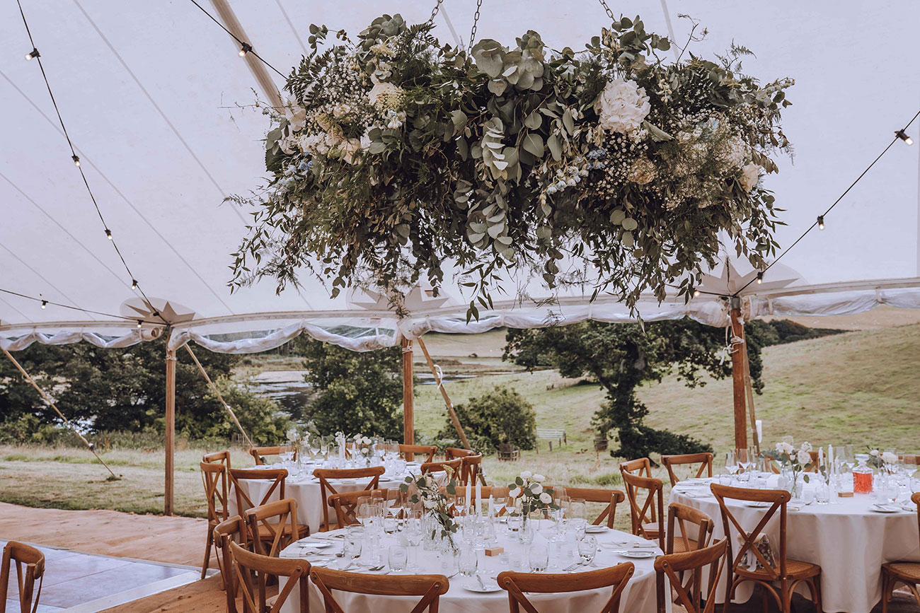 Embrace the natural beauty of your location. This foliage-filled installation picks up on the lush colours of the surroundings at Caerhays, while the hues of this tipi wedding blend beautifully with the coastal location.