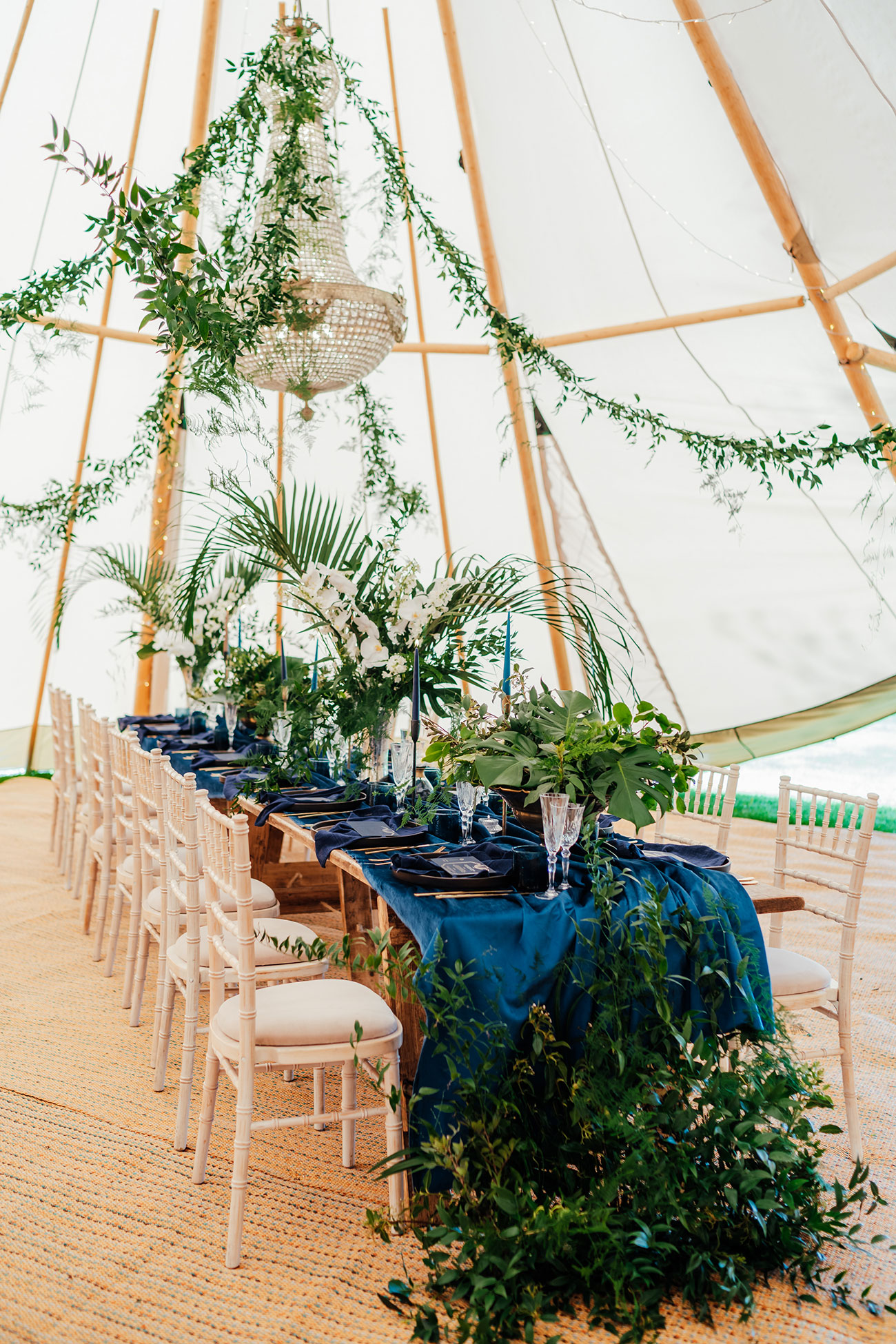 From a back-to-nature vibe to high-octane glamour, foliage is as versatile as it is impactful. The combination of fresh greens and crisp white florals look particularly striking against the ivory canvas of this Tipi Spaces tipi.