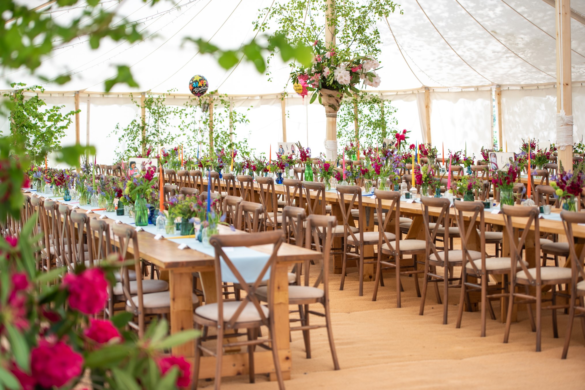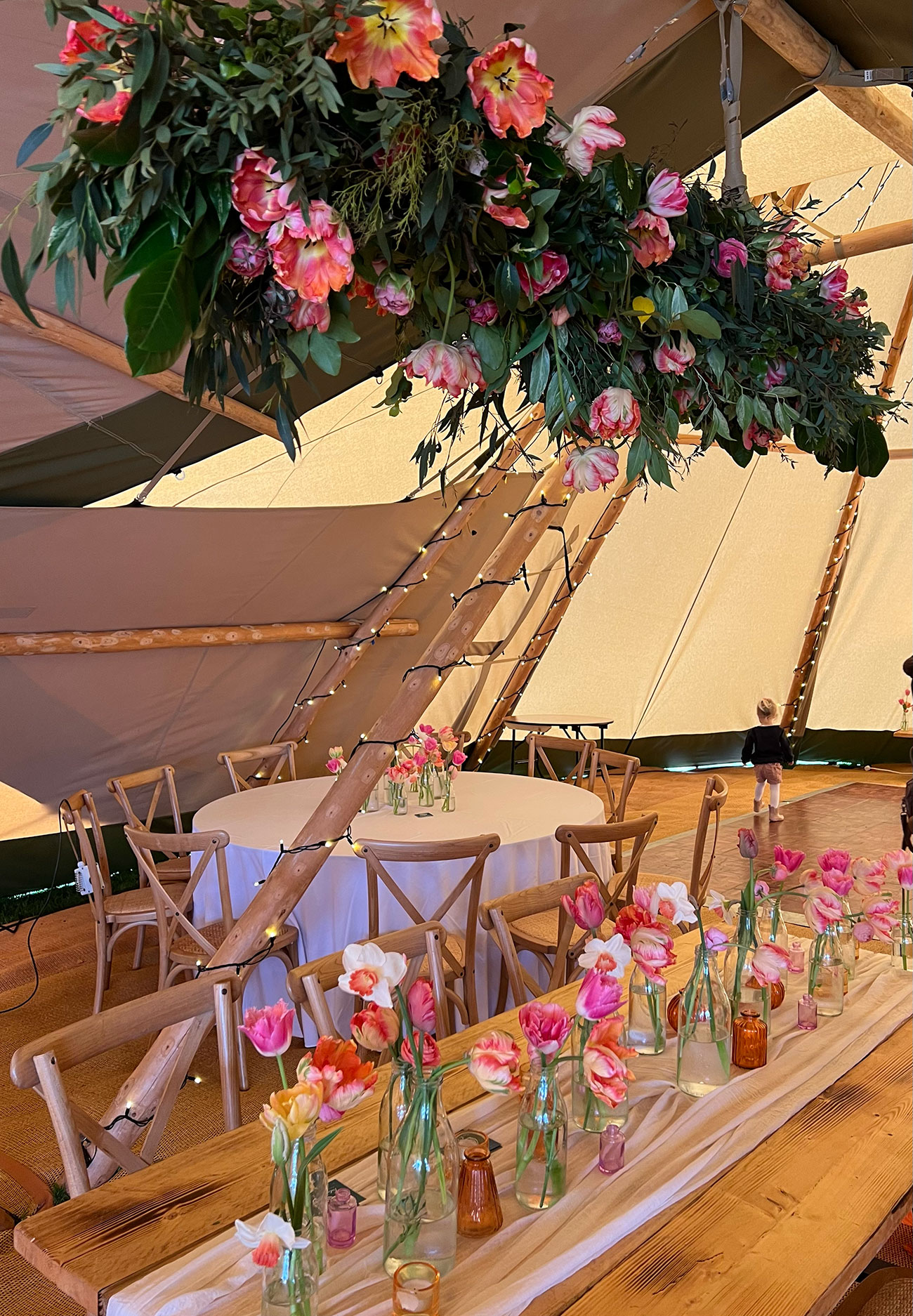 Don’t overlook your tentpoles. Make them part of the design by decorating them with foliage, flowers, fairy lights, ribbons – or you might even make them look like trees by adding branches.