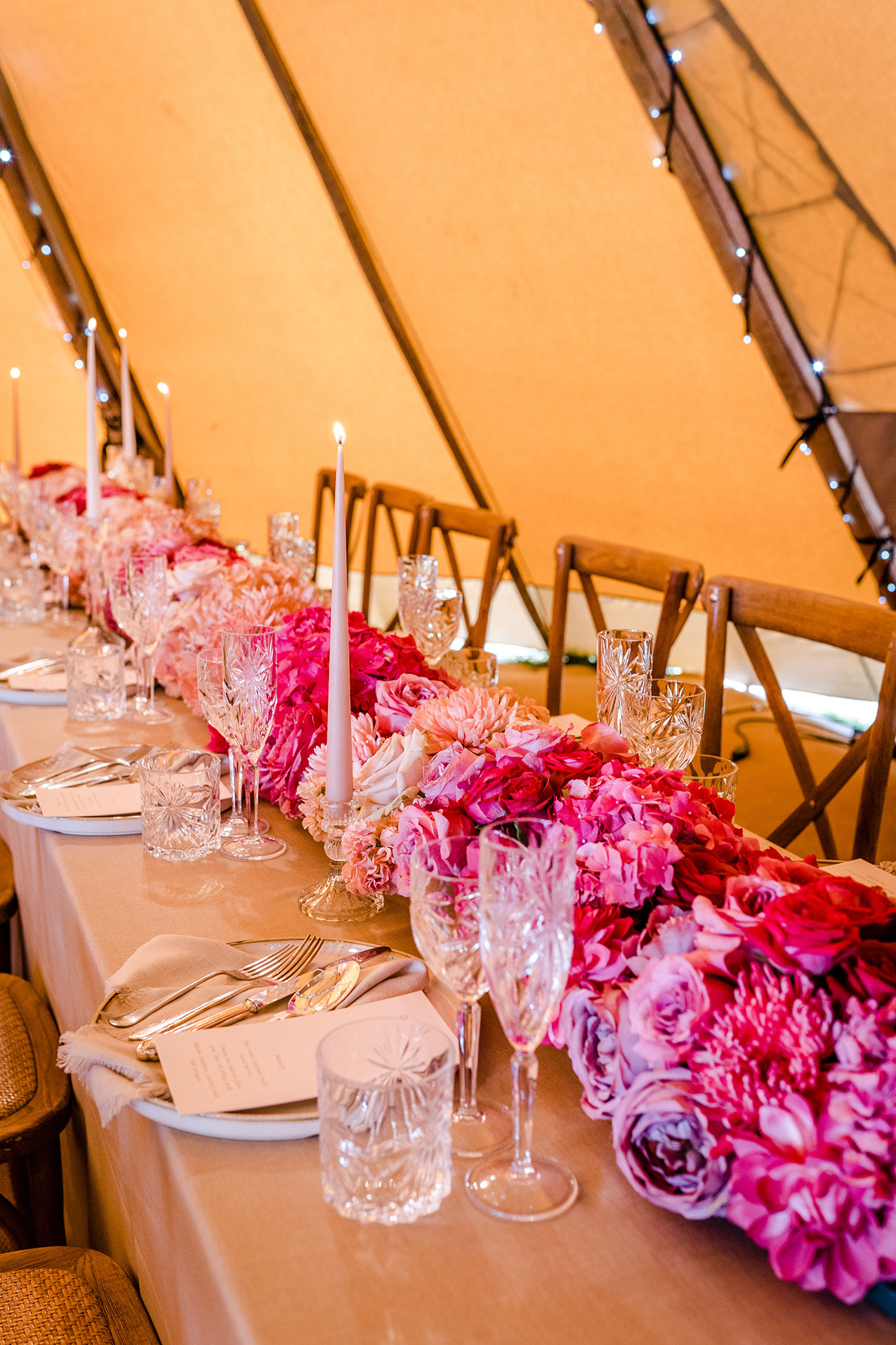 Choosing a tipi wedding doesn’t necessarily mean you have to opt for pared-back styling. You can still embrace an elegant aesthetic, as this World Inspired Tents tipi illustrates, with its crystal glassware, tapered candles and romantic blousy florals.