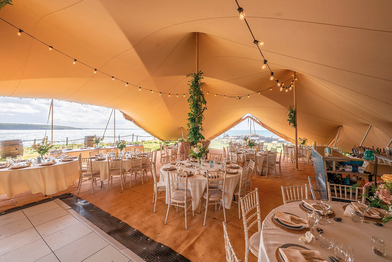 It’s difficult to resist the elegance of a traditional marquee. Its classic style combines wooden poles, natural canvas and large Georgian arch windows to usher in views across the Cornish countryside for a timelessly beautiful celebration.