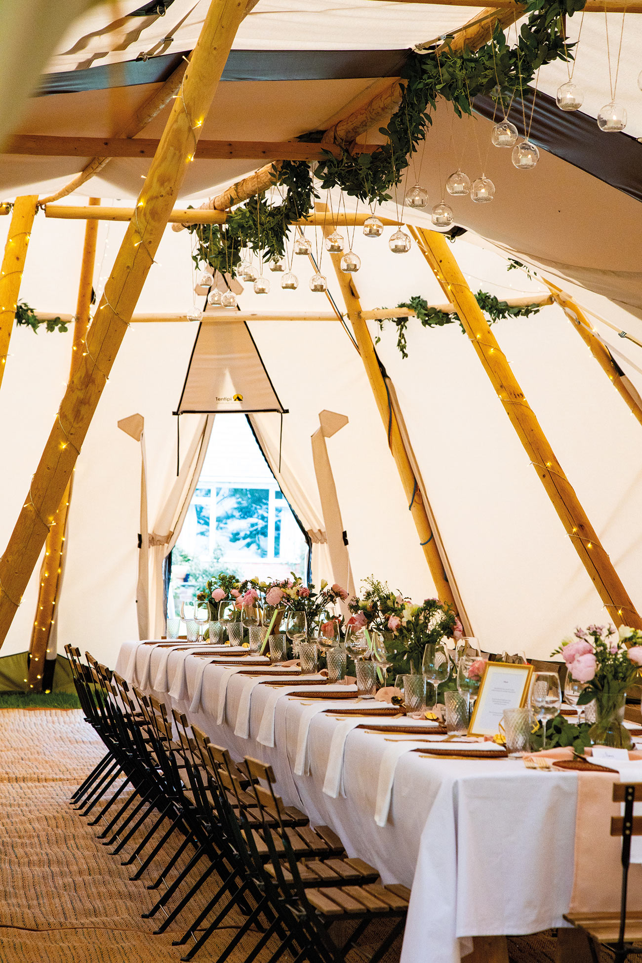 As well as the land upon which the marquee is being laid, think about the space and potential physical hazards around your venue. “The tipis are 7.5m tall, so be mindful of any overhead cables or trees with low-hanging branches,” says Charlotte. “We also ask for a plan of any known underground cables or pipes that might be at risk from our large tent pegs; and protection from the prevailing wind is also useful such as a wall, building, hedge or trees.”