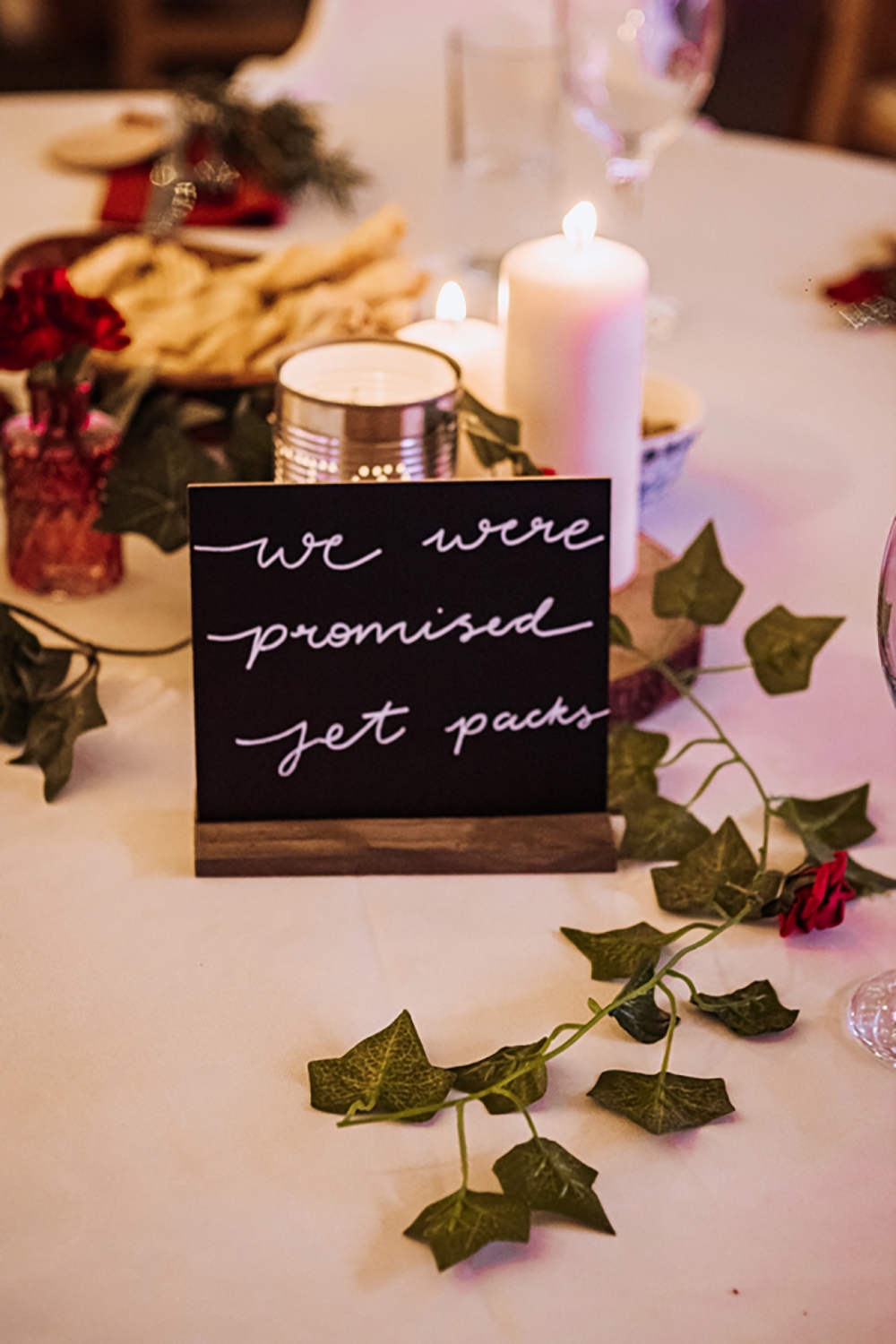 Picking a date five years to the day of their first meeting, Ash Barton Estate was the charming backdrop to their 'cosy, winter hygge' themed wedding. An abundance of fresh greenery helped to set the scene, with tree branches decorated in fairy lights suspended from the ceiling combining with candles, rugs and fur pelts to achieve the look. The tabletops were adorned with a single stem burgundy carnation, with centrepieces made by Megan's mum comprising wood slices and greenery interwoven with burgundy roses, topped with personalised tea light holders crafted from recycled tins.