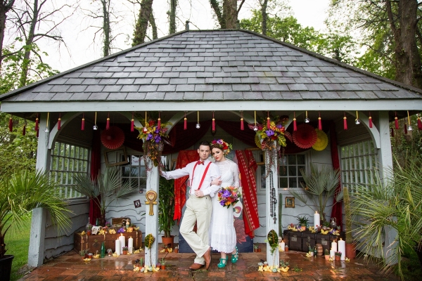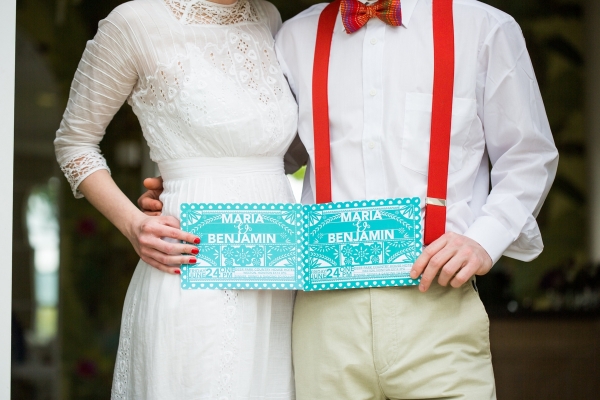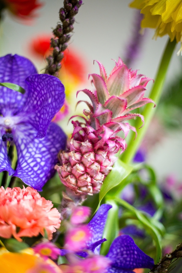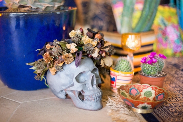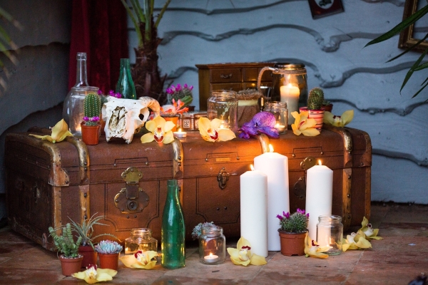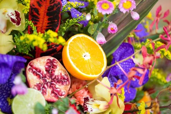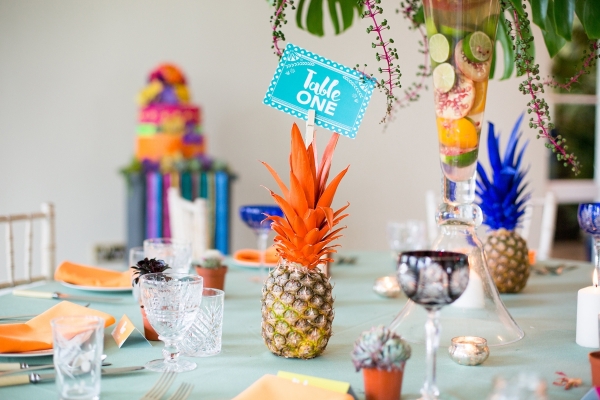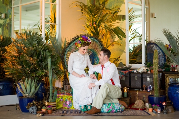 The strong colours continue in the stationery and flamboyant floral arrangements, interspersed with the sweetest addition of mini pineapples, citrus fruits and pomegranates, ensuring bright hues and zesty flavours run through the key elements. Flickering candlelight, patterned floor cushions, vintage furnishings and an antique lace gown add an atmospheric, bohemian mood, completing the character-filled aesthetic.