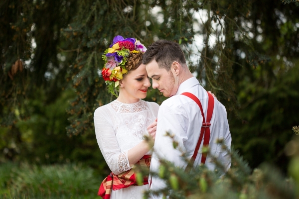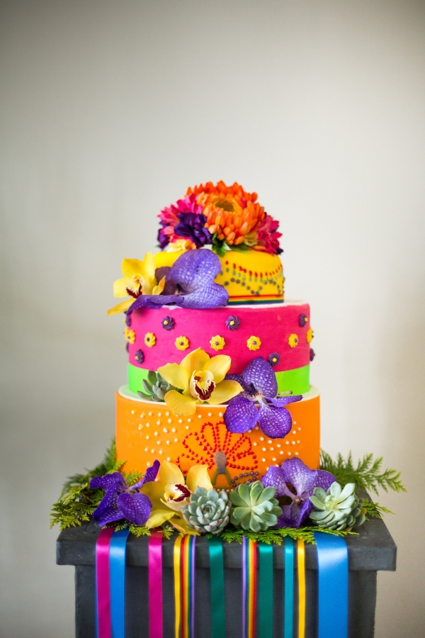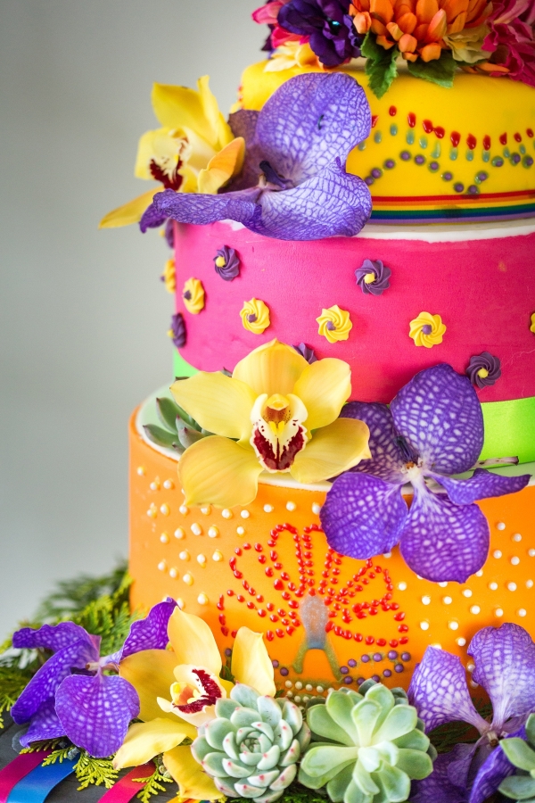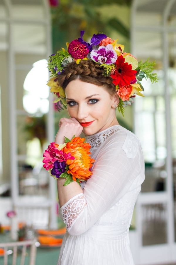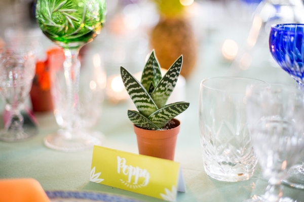 A three-tiered cake adorned with ribbons and piled high with exotic flowers stands proud in the Orangery of Deer Park Country House, which is brimming with a carnival of dazzling details that combine to dramatic effect. Dyed pineapple leaves, mini cactus favours and coloured glass bring a South American flavour, with painted ceramics and a brilliant palette of red, yellow and purple brightening every scene.