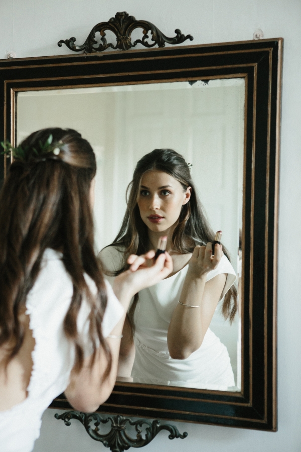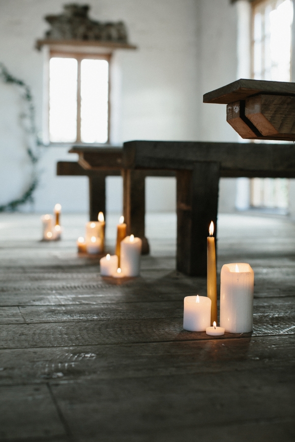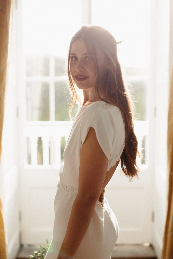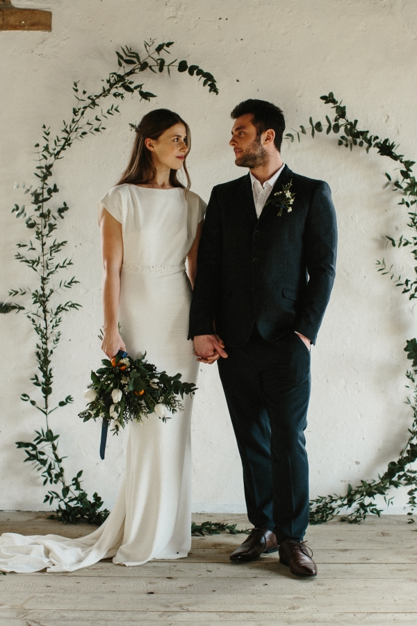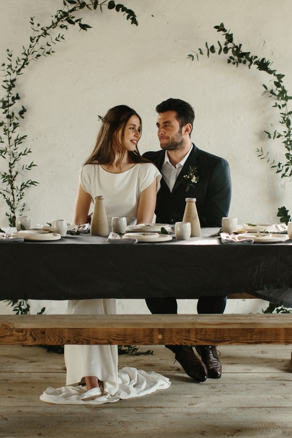 The bare beams, fresh white walls and clean lines of the furniture mean all focus is on the beauty of the bride. A svelte and elegant gown worn alongside gracefully effortless make-up allows the chord to strike between classic and contemporary; a straightforward yet sophisticated style mirrored in the stationery, complete with glassine envelope and wax seal.