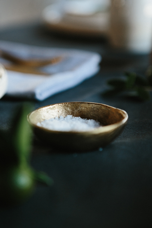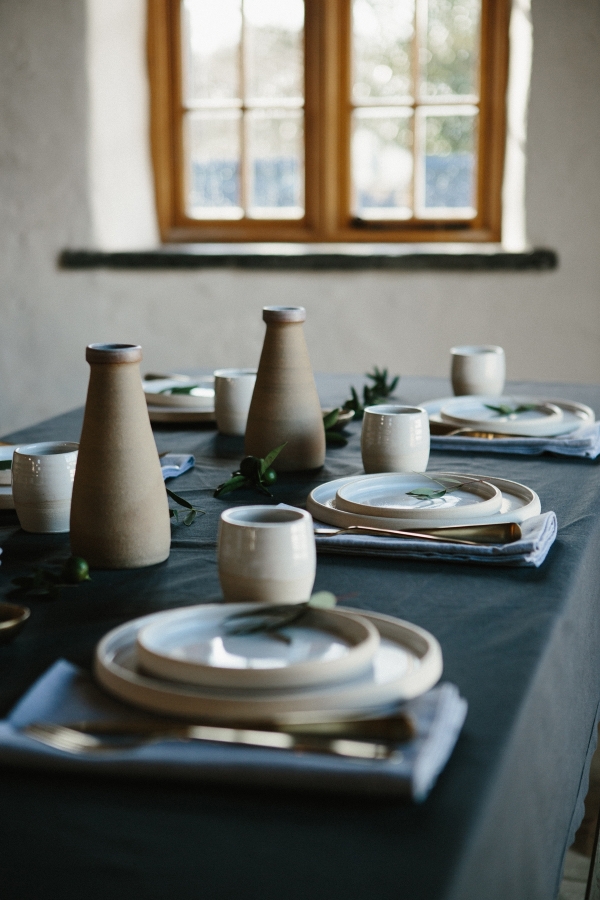 Heavy traditional pottery holds its own against a minimalist table setting of natural linens, with vine-like foliage and golden accents standing strong, the organic textures fusing to create a quietly striking dinner space.