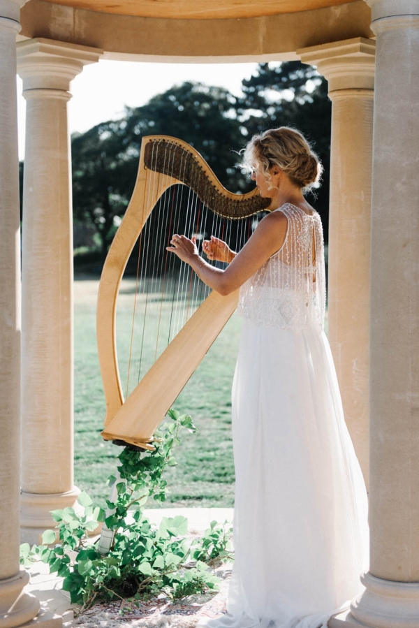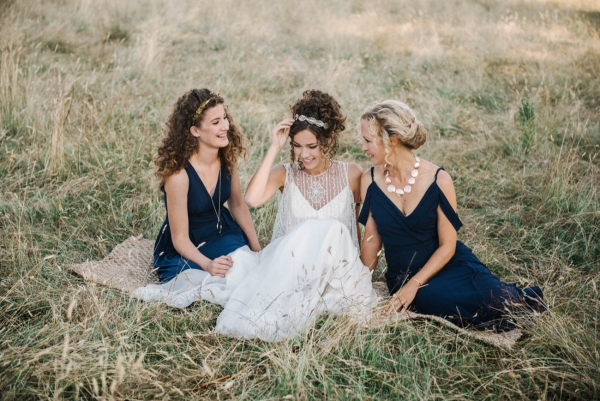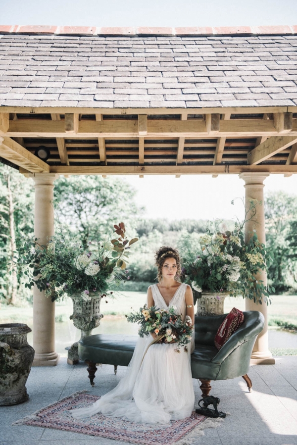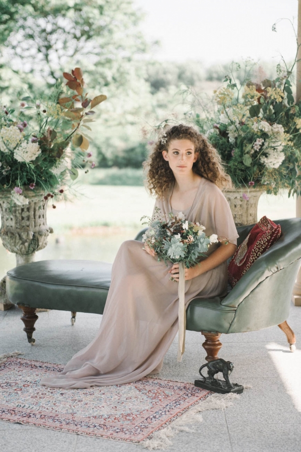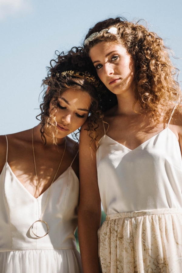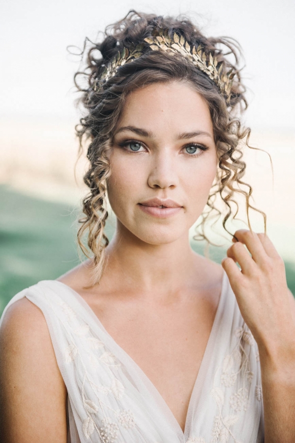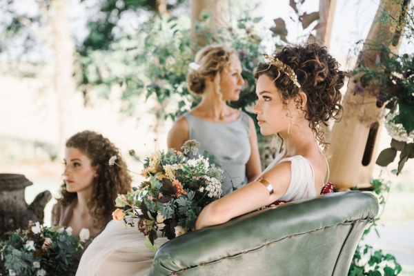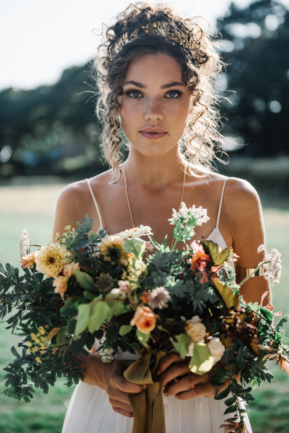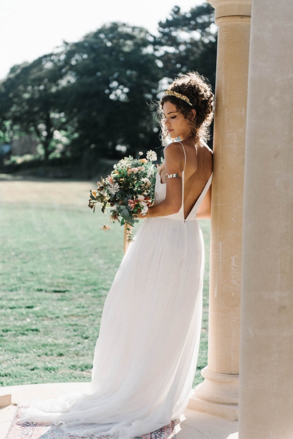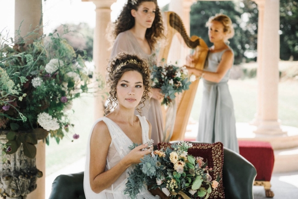 Drawing on the backdrop of the temple, the styling is classical and romantic, echoing ancient Rome - a timeless yet gorgeously relaxed look for a modern bridal party. The gowns are flowing and flowing, with draping and delicate embellishment. Statement jewellery and headpieces adorned with olive leaf details enhances the goddess aesthetic, which is softened with curls and naturally abundant bouquets.