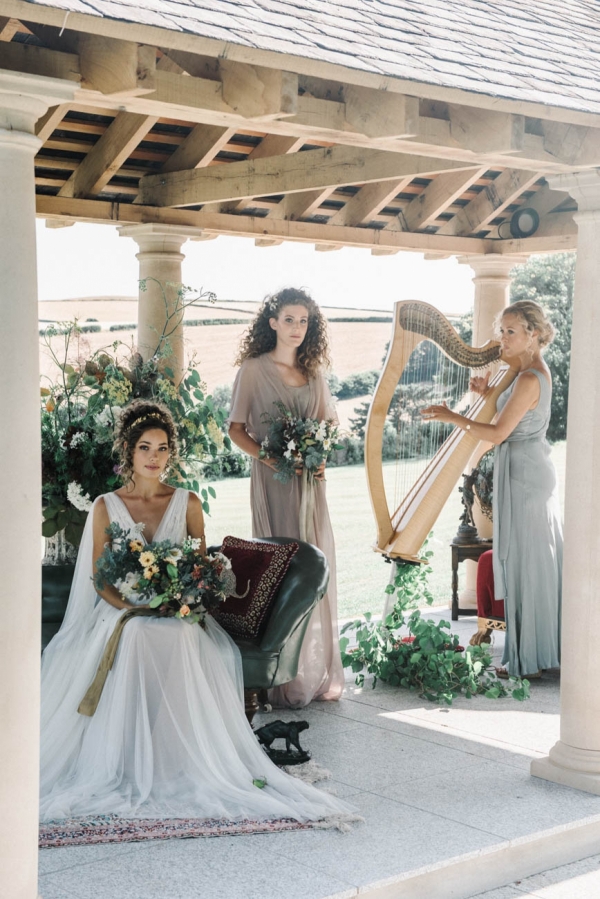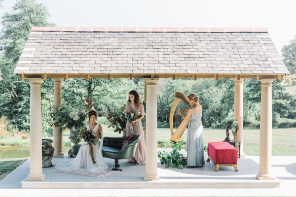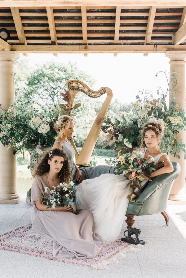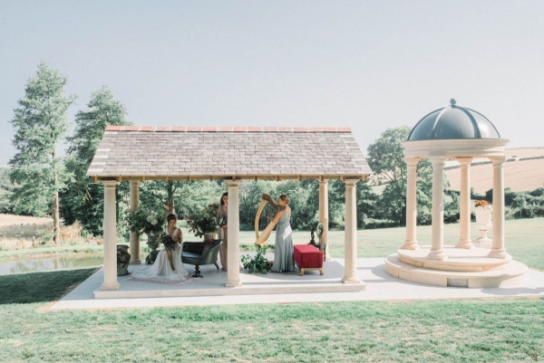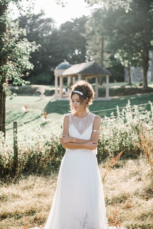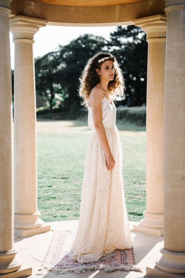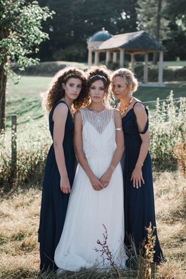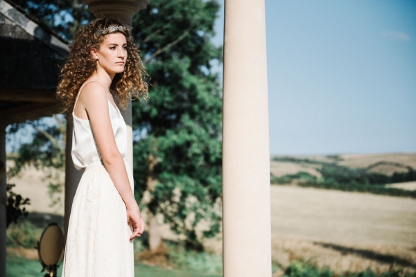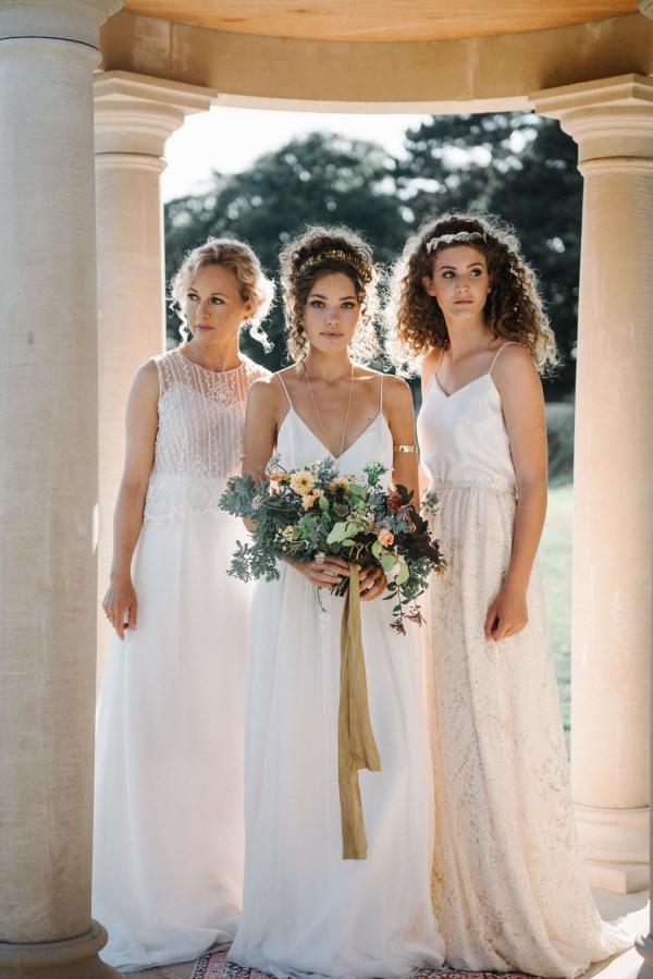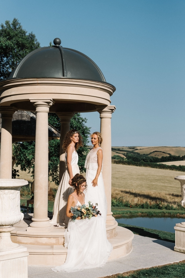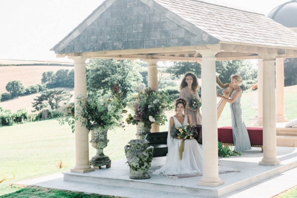 The shoot captures the poignant interaction between the bride and her bridesmaids. After the morning of preparation, excitement and anticipation comes those precious moments, a chance to communicate all the feelings of joy and intimacy. Set alongside the Roman folly in Tredudwell's incredibly scenic, grounds, the garden temple represents the final point for the women to embrace these emotions.