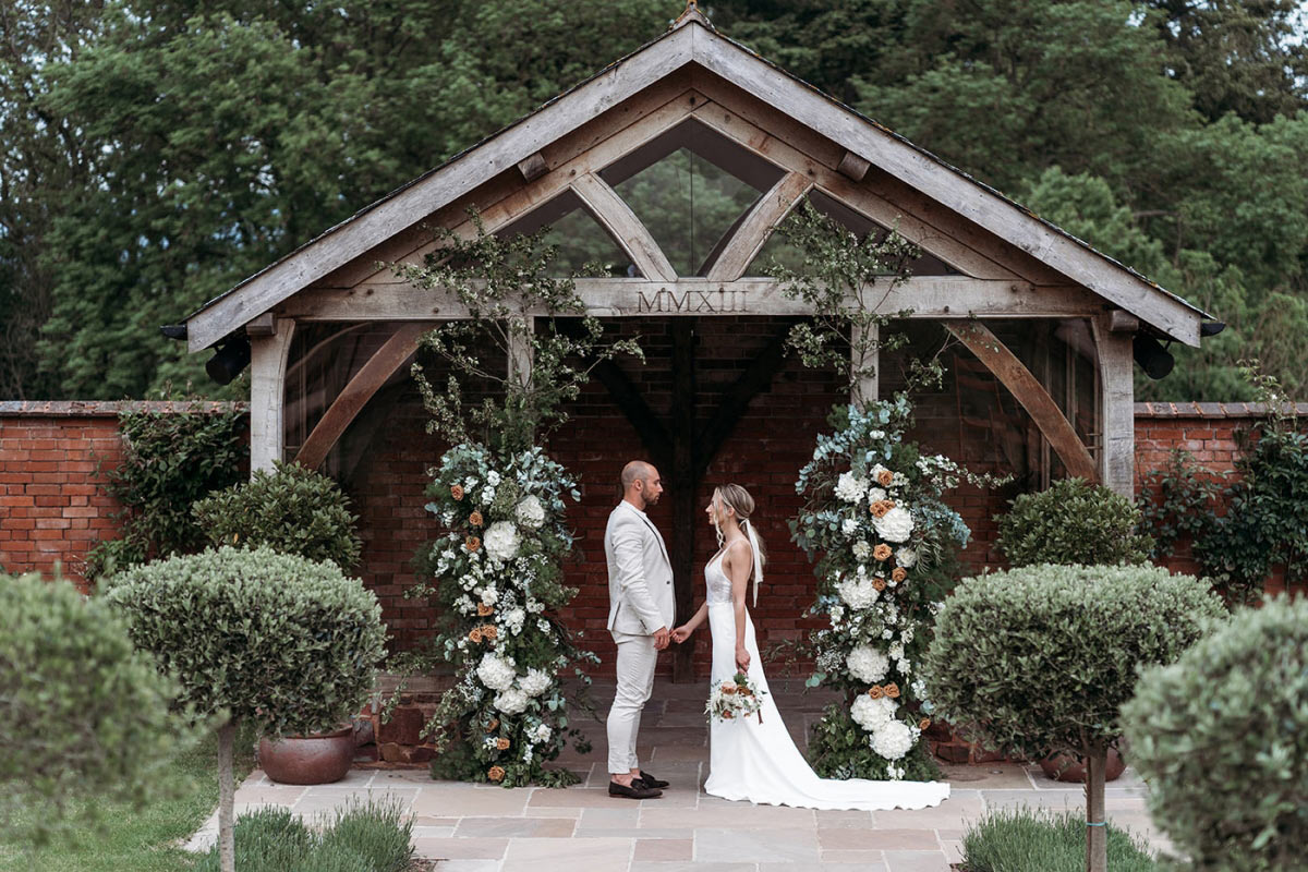 This carries into the walled garden where a glorious abundance of foliage and crisp blooms, dotted with cappuccino roses, frame the bride and groom at the arbour, the hues blending seamlessly with the setting.