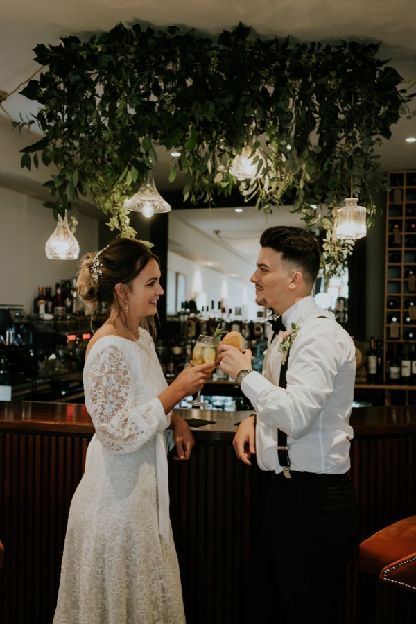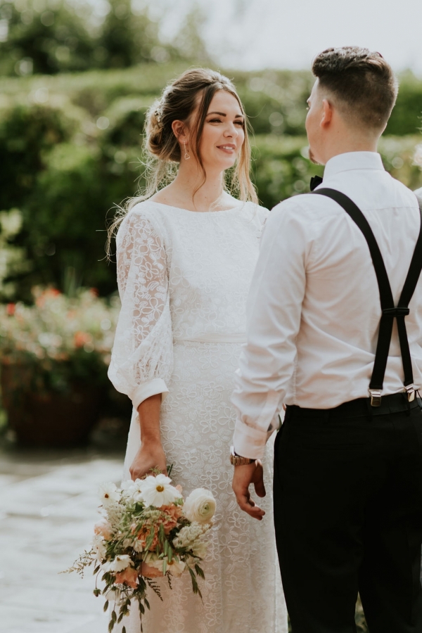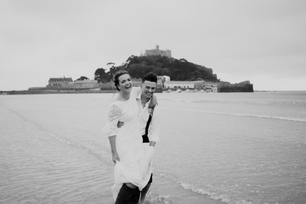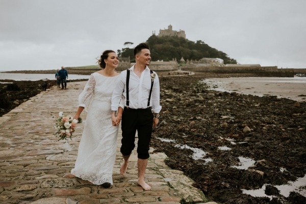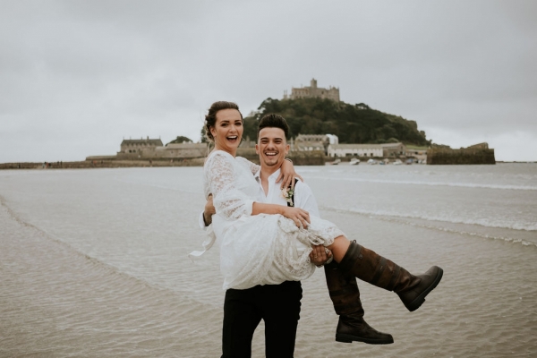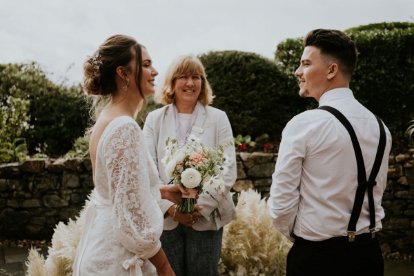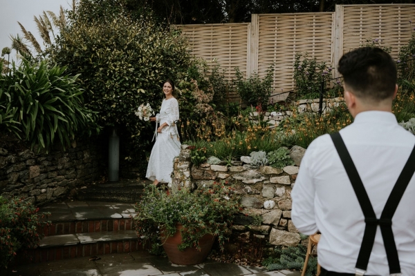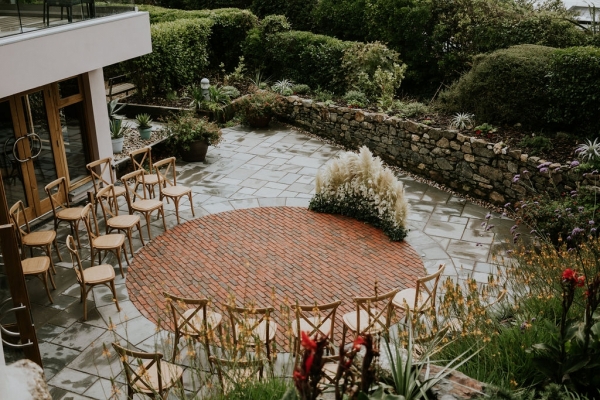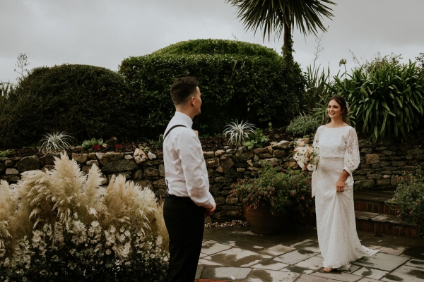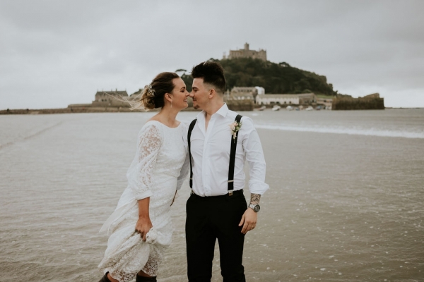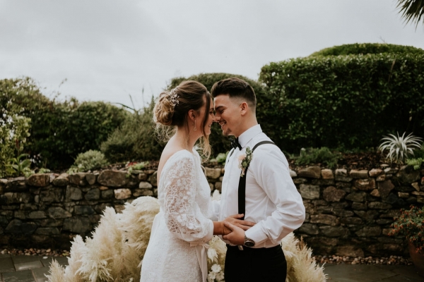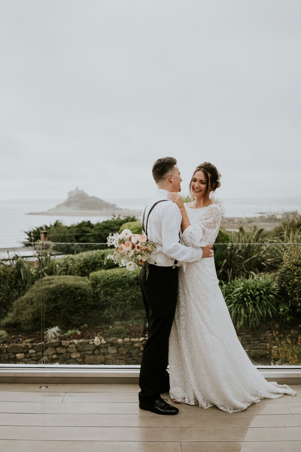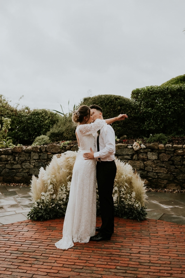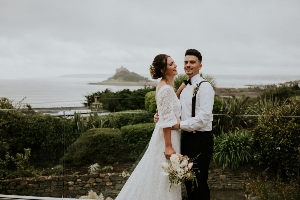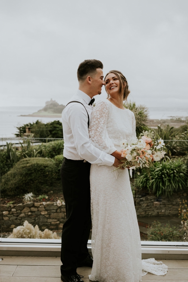 Mount Haven boasts a series of breathtaking settings for ceremonies; here, a backdrop of pampas grass, greenery and exposed stone walls set the scene for a ceremony embracing nature in the courtyard, the bride looking elegant yet relaxed in her flowing lace gown, crafted in Cornwall. With the sands of Marazion being nearby, couples might also be tempted to head to the seashore for photos on the beach with the iconic St Michael's Mount as the backdrop.