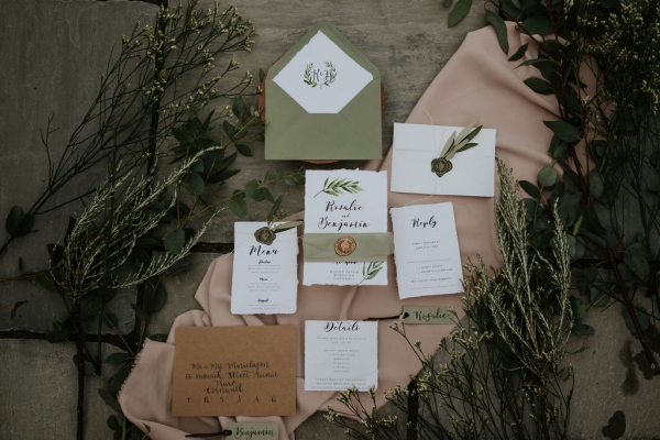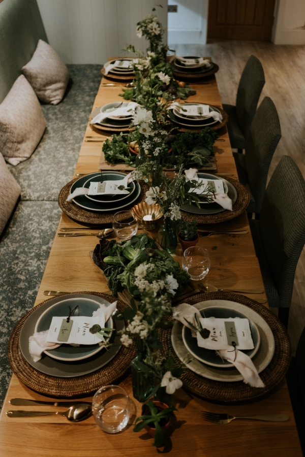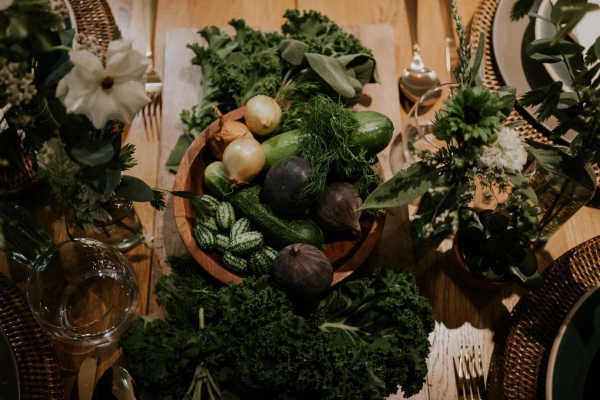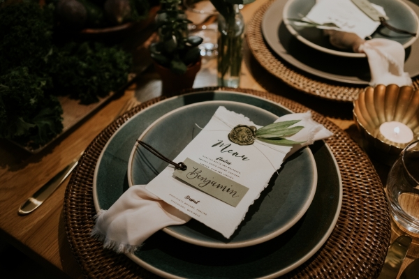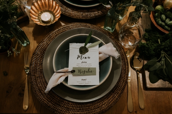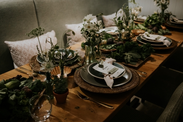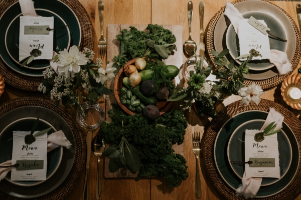 The beauty of nature is celebrated in the deep greens of the foliage and the abundance of foods, rooted in locality and seasonality, piled high in wooden bowls. The pretty white blooms bring some lightness, while the stationery embraces leaf detailing and a fresh-from-the-hedgerow palette. With table styling incorporating textures of rattan and wood with accents of gold, it's a luxe take on rustic - natural but perfectly styled to bring depth and ambience to the look.