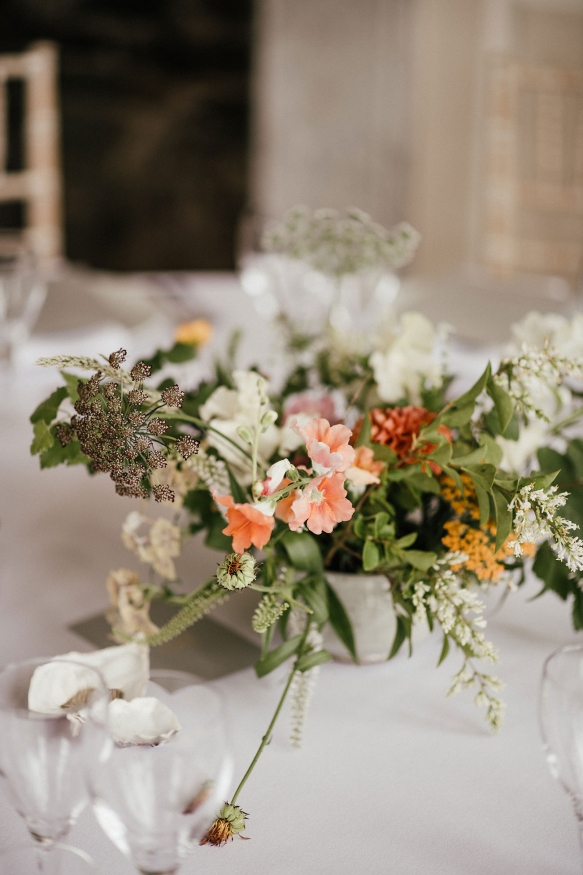 Choosing flowers that reflected a 'naturalistic, wild British overgrown garden' aesthetic, the soft toned colour palette included plenty of creamy whites in the bouquets to complement the bridesmaids' fabulous red dresses. Roses featured heavily with added texture from larkspur and phlox, and finished with plant-dyed silk ribbon.