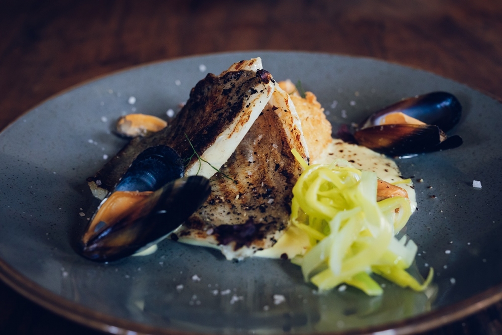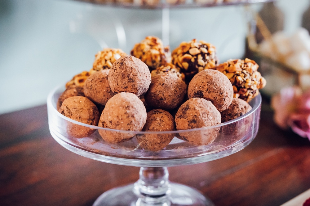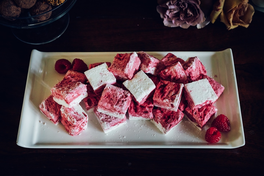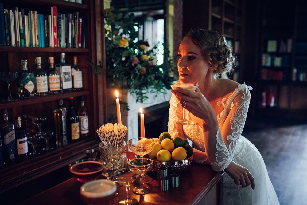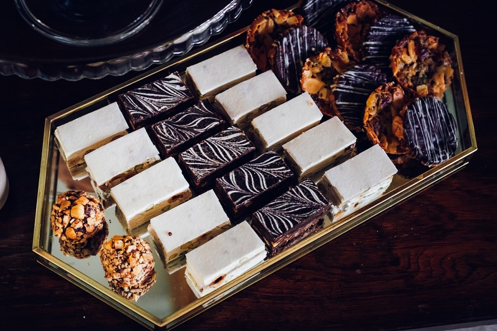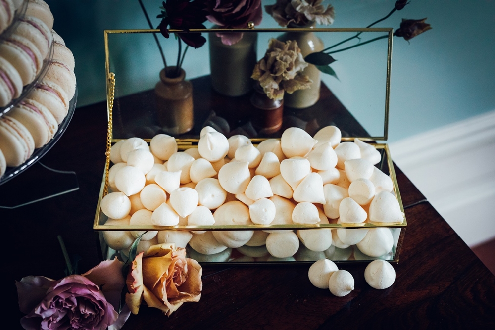 With its dark wood panelling and handprinted wallpaper, the library makes an ambient setting for guests to mingle with bespoke cocktails and canapés, while the newly renovated reception room is an elegant, light-filled space for a wedding breakfast. 'We used gilt wall sconces for candles, sand coloured linens and exuberant florals alongside stoneware plates of incredible fresh Cornish produce such as freshly made scallop ravioli, lamb rack and polenta mash with wild blackberry vinaigrette,' says Christine. Meanwhile, the wedding cake and dessert table included deep chocolate cake, fresh raspberry marshmallows, nougat with wild Cornish honey, and brown butter tiffin.