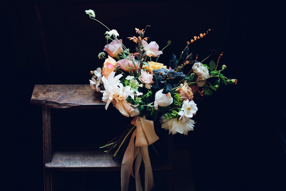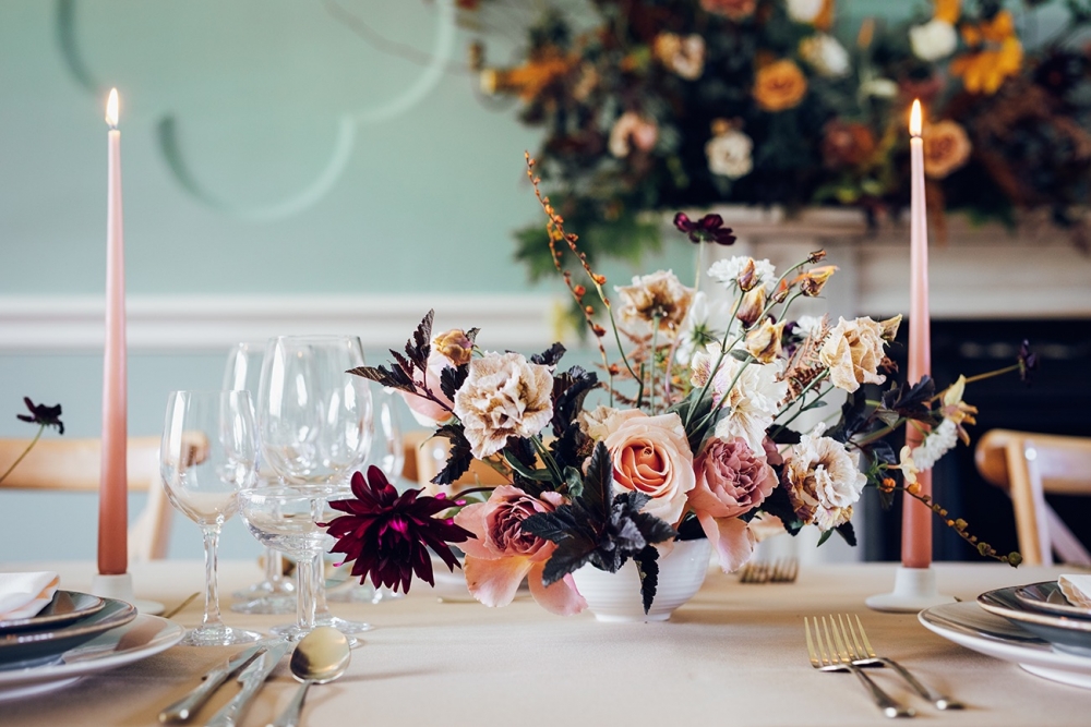 Bringing this natural beauty indoors through captivating floral design is central to the aesthetic. 'We chose a natural, asymmetric approach to arrangements,' says Christine. 'It was vital to allow a sense of rich abundance through the greenery by maintaining a high ratio of staggeringly beautiful blooms throughout. Deep creams, caramels, and dark chocolate were the main colours, with light touches of aged pale pink.'