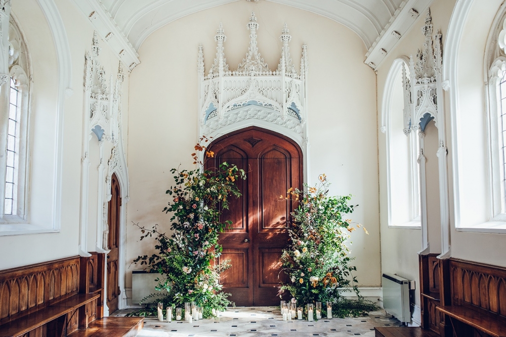 Filled with intricate plasterwork crowning the arches of every window, the family chapel at Trelowarren is a breathtakingly romantic space. 'Along with an imposing broken floral arch that graced the chapel doorway, a living chancel-rail was created of foliage harvested from the estate, and feature flowers,' says Christine.
