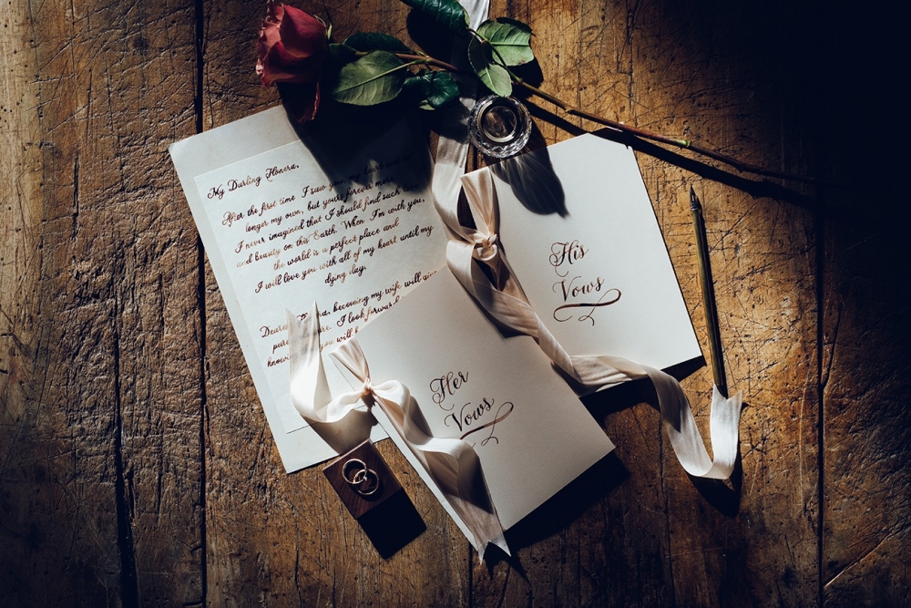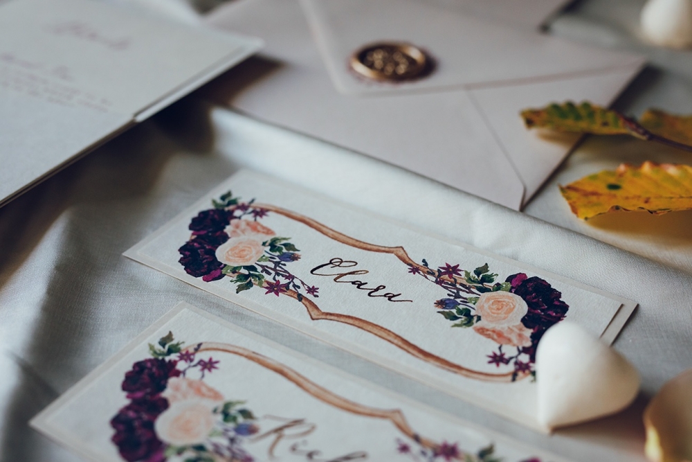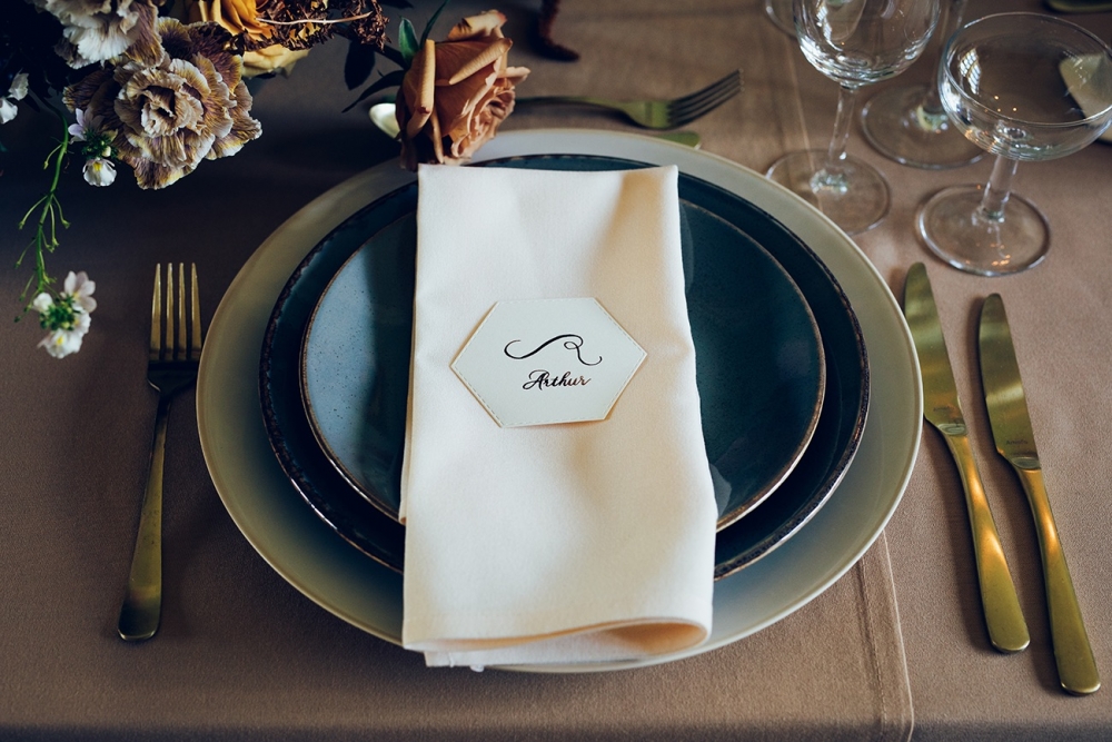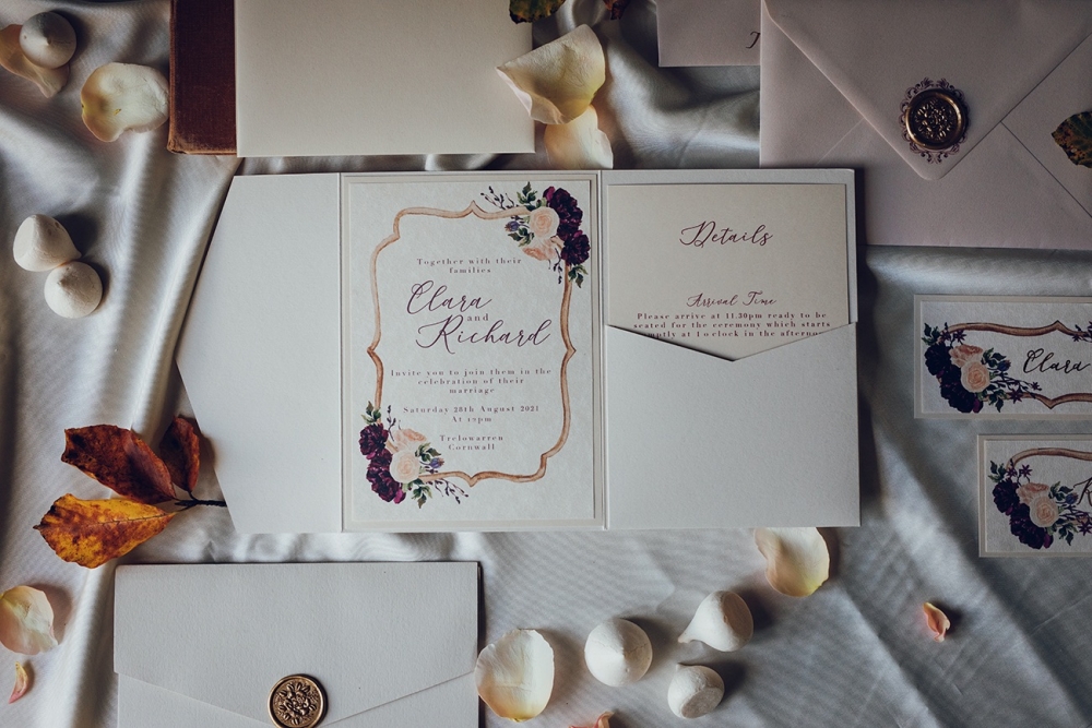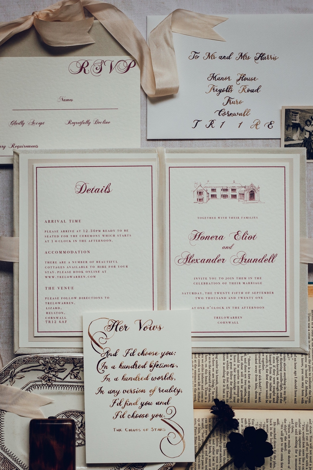 'I drew inspiration from Daphne du Maurier's quiet yet intentional revelry in the unspoilt nature of vanishing Cornwall,' says Christine. Combining both the historic and literary, the stunning suite of wedding stationery features an original line drawing of Trelowarren with textured cardstock, calligraphy and cream velvet detailing. It captures the timeless and beguiling beauty of this styled shoot ' and, indeed, Trelowarren itself.