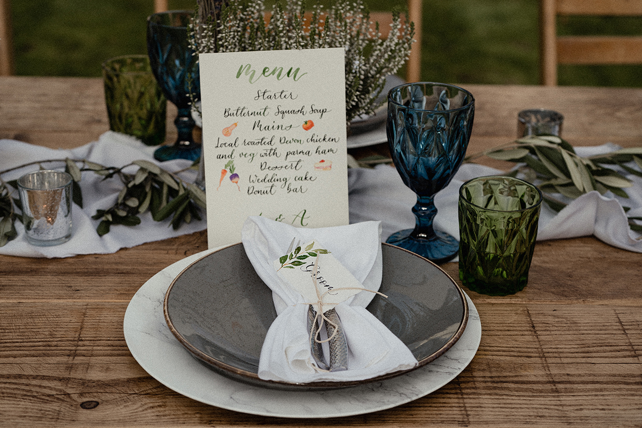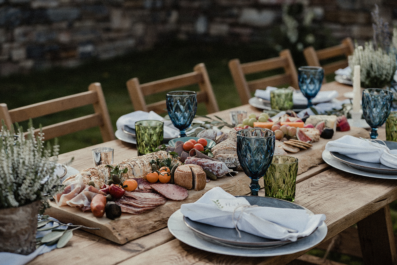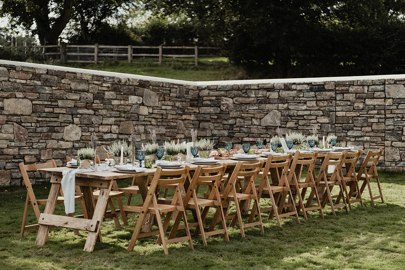 Set amidst the walled garden with far-reaching views across the surrounding meadows, the tablescape offers natural, unfussy styling, where the colours of the glassware, bunches of lavender and hearty sharing platters of fruits, meats and cheeses pop against the wooden table and slate grey tableware. A semi-naked cake and colourful hand-painted stationery adds to the charm.